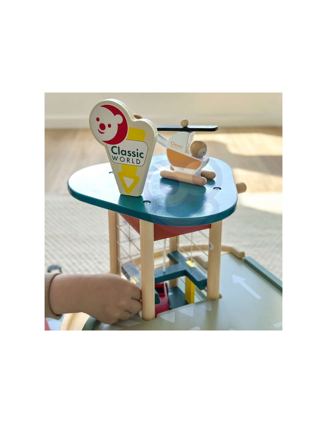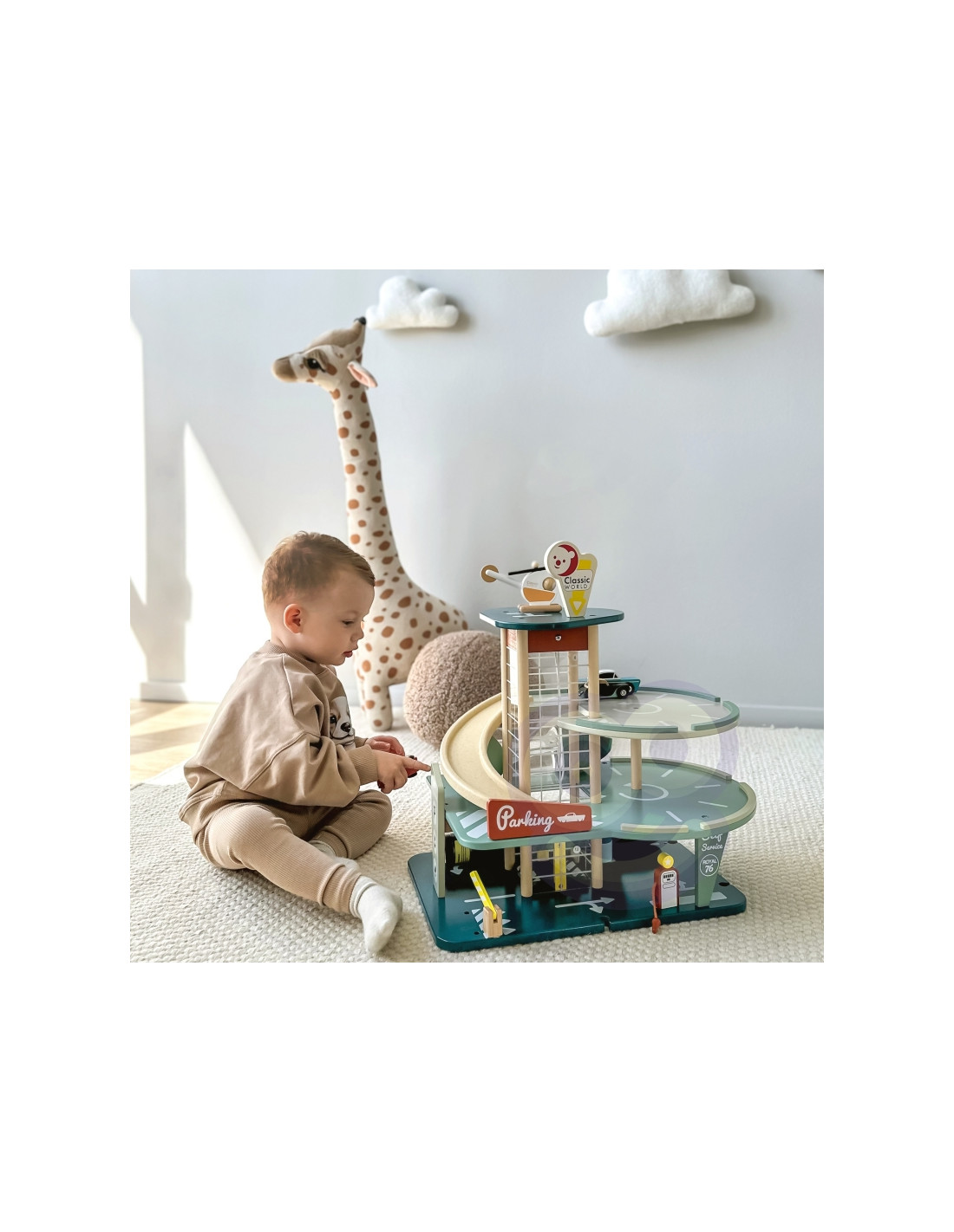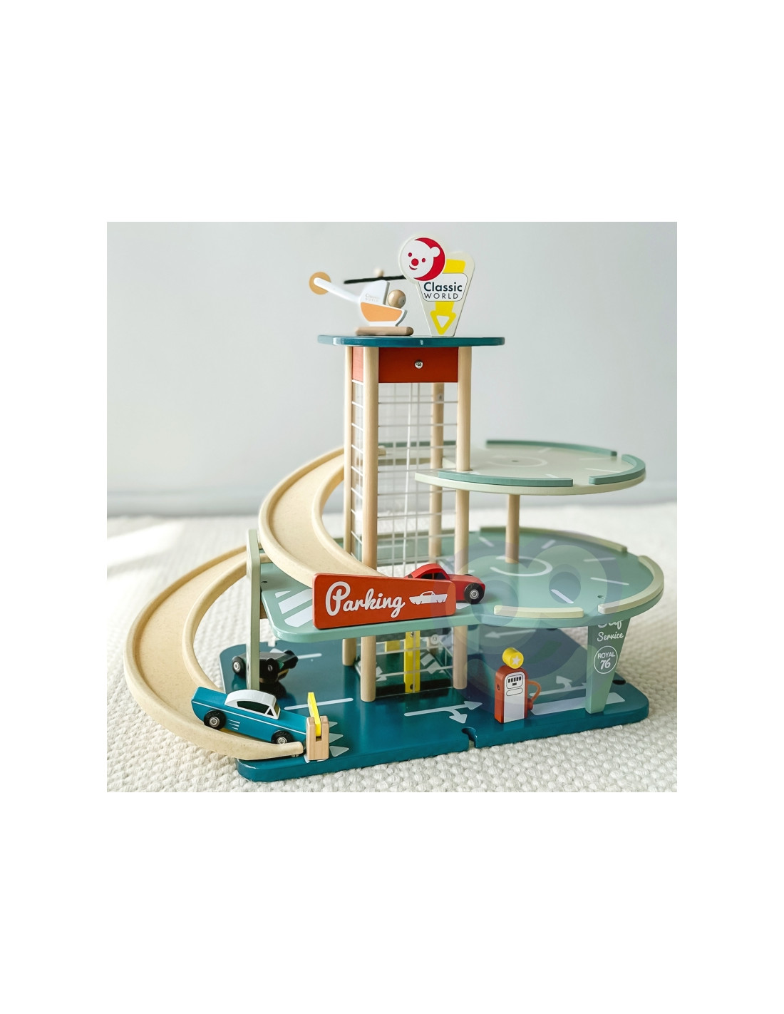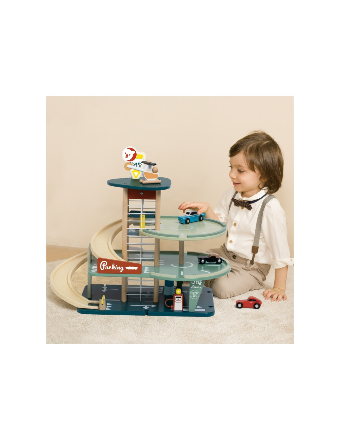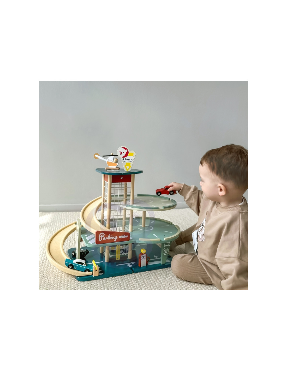 Inspired by the 1950s, this CLASSIC WORLD garage evokes the golden age of cars ! It features stylish cars, a car wash, a fuel pump, and bioplastic ramps for access to the parking lot. An elevator serves all three levels and is topped with a platform that houses a helicopter . The base is equipped with connectors for creating a track. This toy develops fine motor skills and language skills. Playing with other children also helps develop social skills. The wood is FSC-certified, and the ramps are made of bioplastic.
