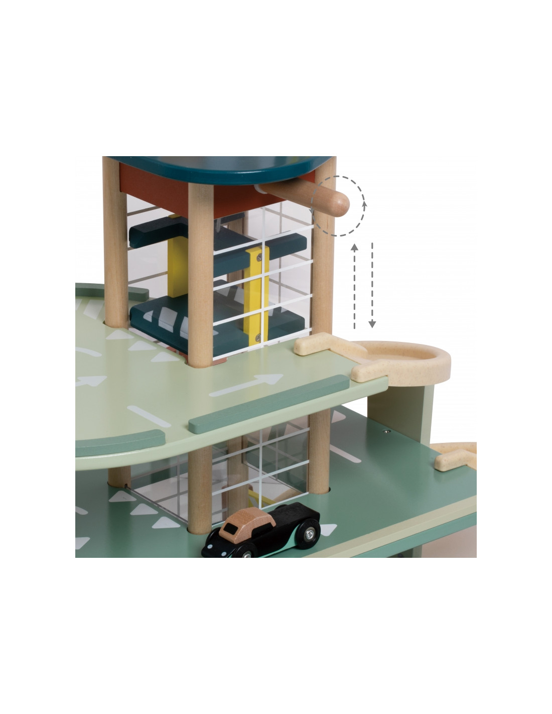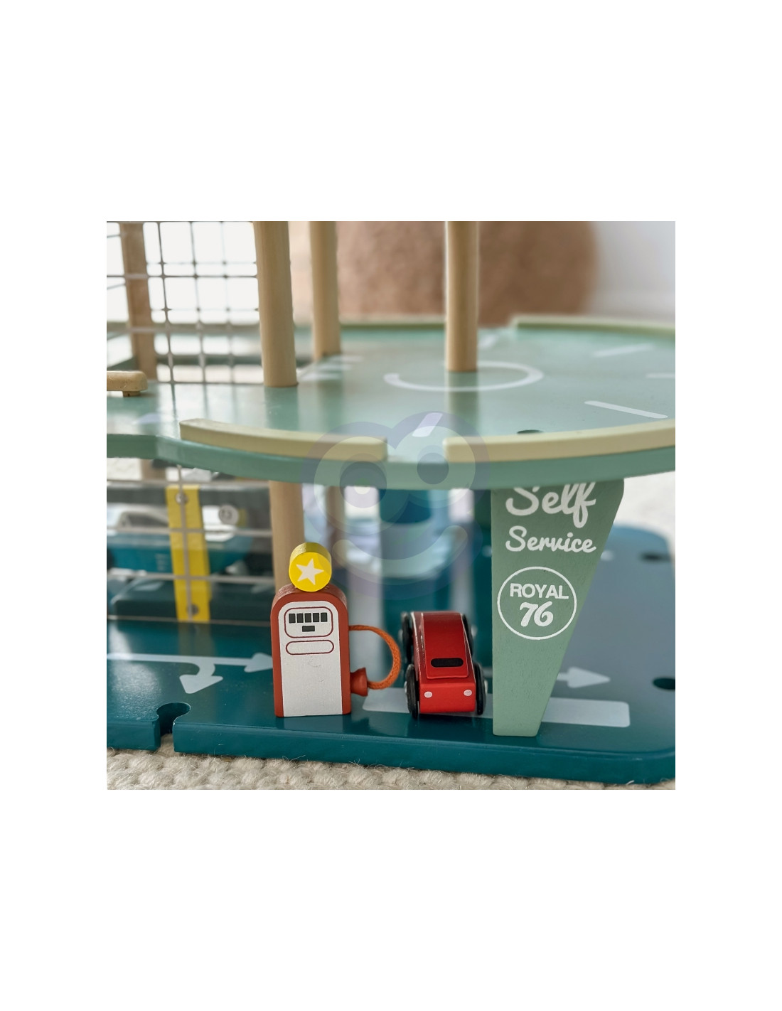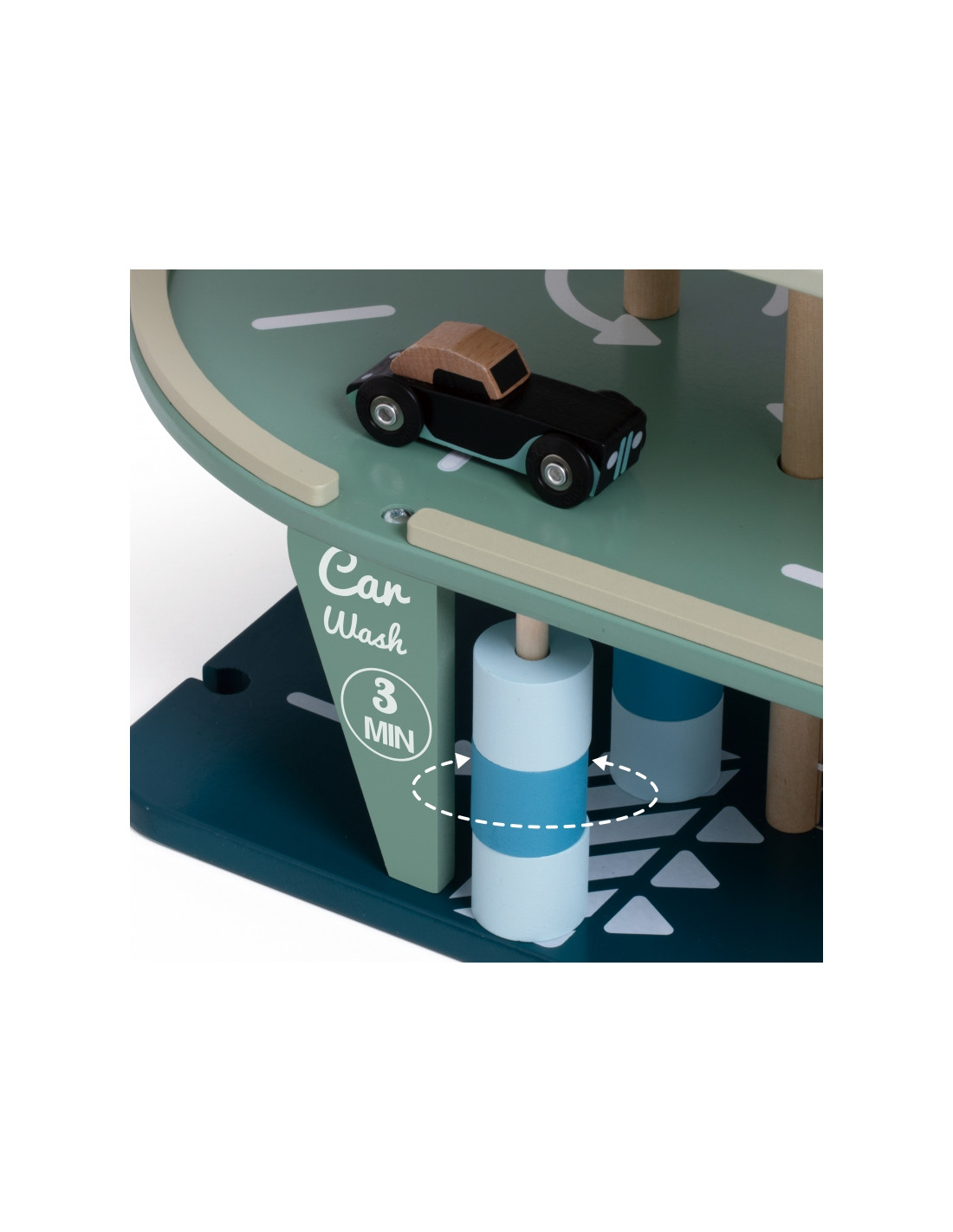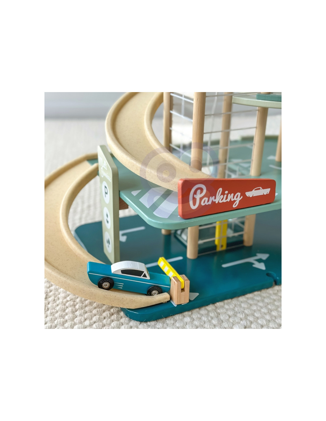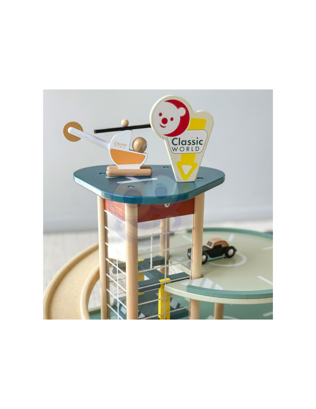 Inspired by the 1950s, this CLASSIC WORLD garage evokes the golden age of cars ! It features stylish cars, a car wash, a fuel pump, and bioplastic ramps for access to the parking lot. An elevator serves all three levels and is topped with a platform that houses a helicopter . The base is equipped with connectors for creating a track. This toy develops fine motor skills and language skills. Playing with other children also helps develop social skills. The wood is FSC-certified, and the ramps are made of bioplastic.