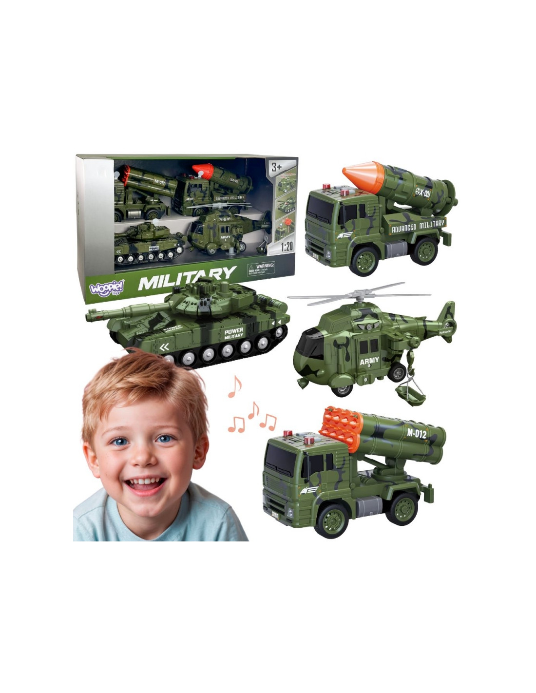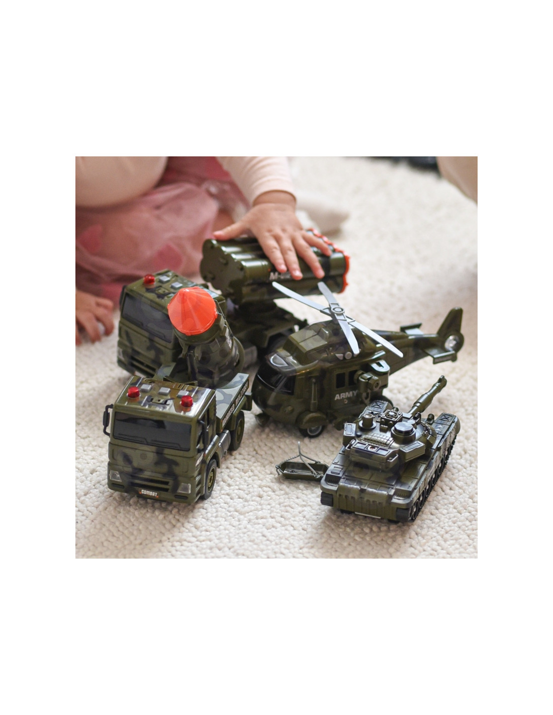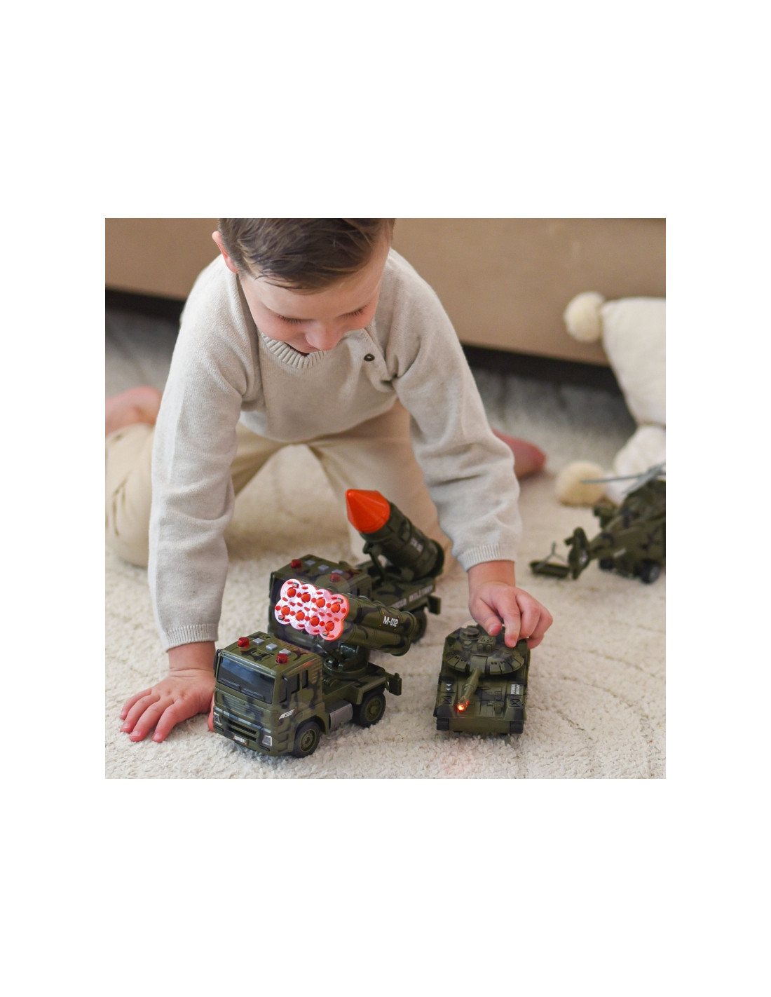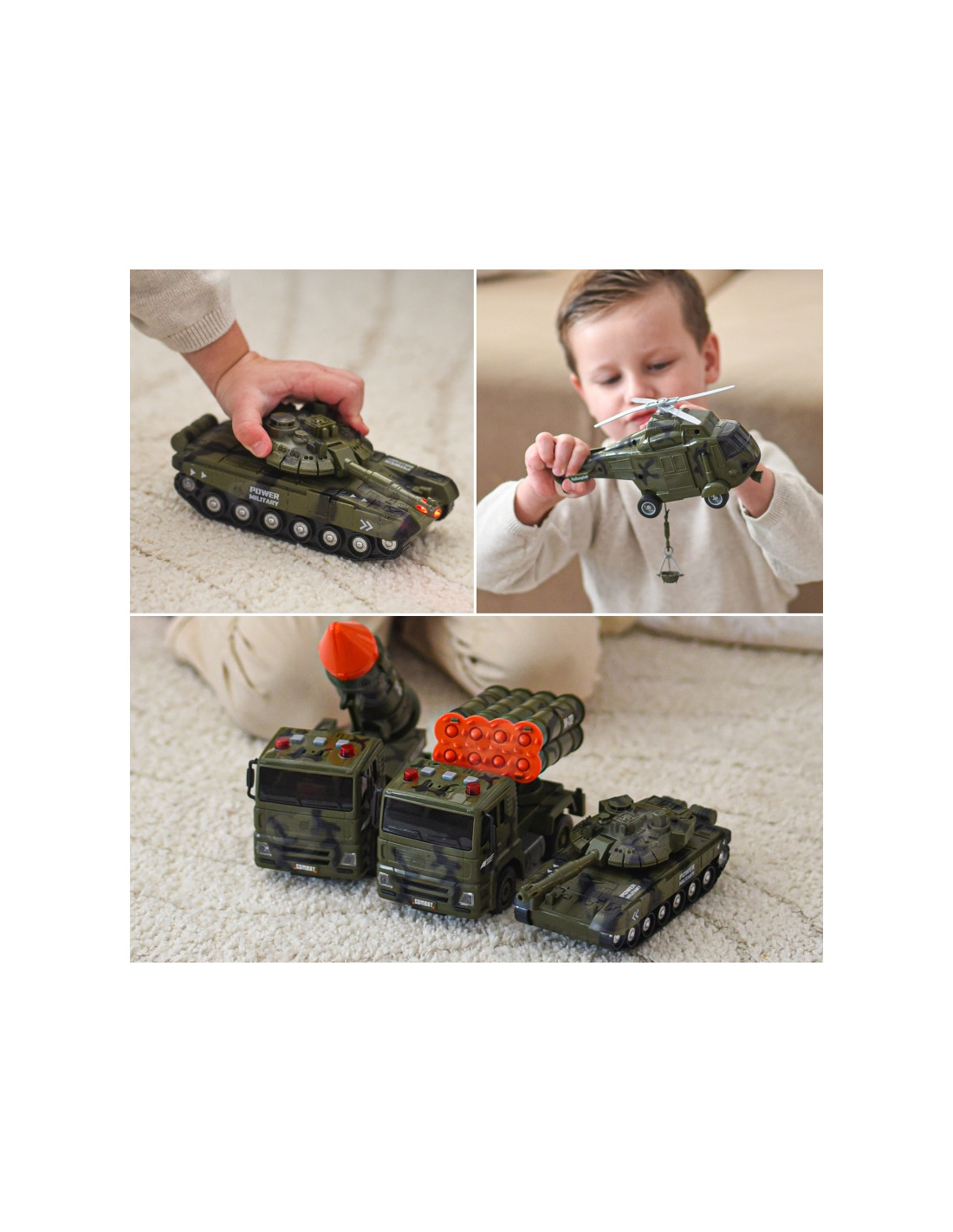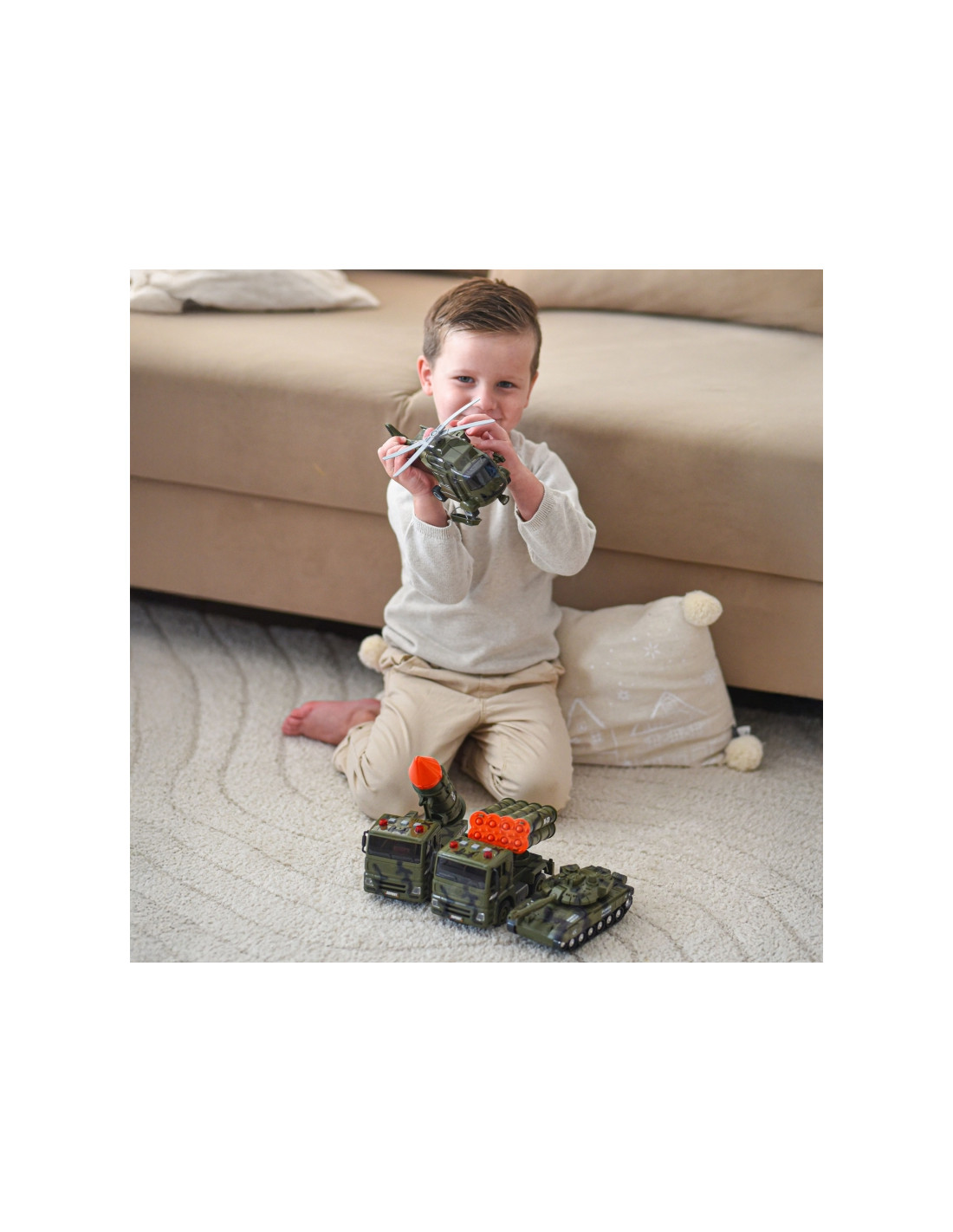 The complete military vehicle set from Woopie is the perfect choice for any young military and action fan! This high-quality , 4-piece set includes realistic models of vehicles, such as a tank , a helicopter , and two powerful trucks with rocket launchers . The trucks are equipped with light and sound effects , making play incredibly dynamic and engaging. The helicopter features moving propellers and a rescue hook , inspiring role-playing rescue missions. The set develops imagination and creativity and is perfect for group play. Suitable for children aged 3 and up .