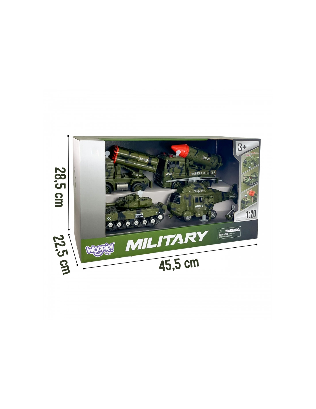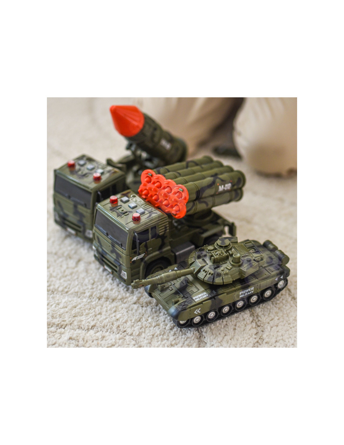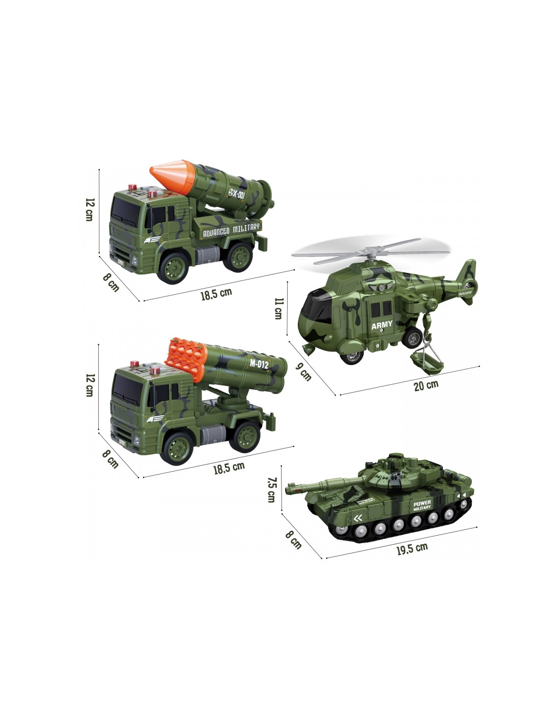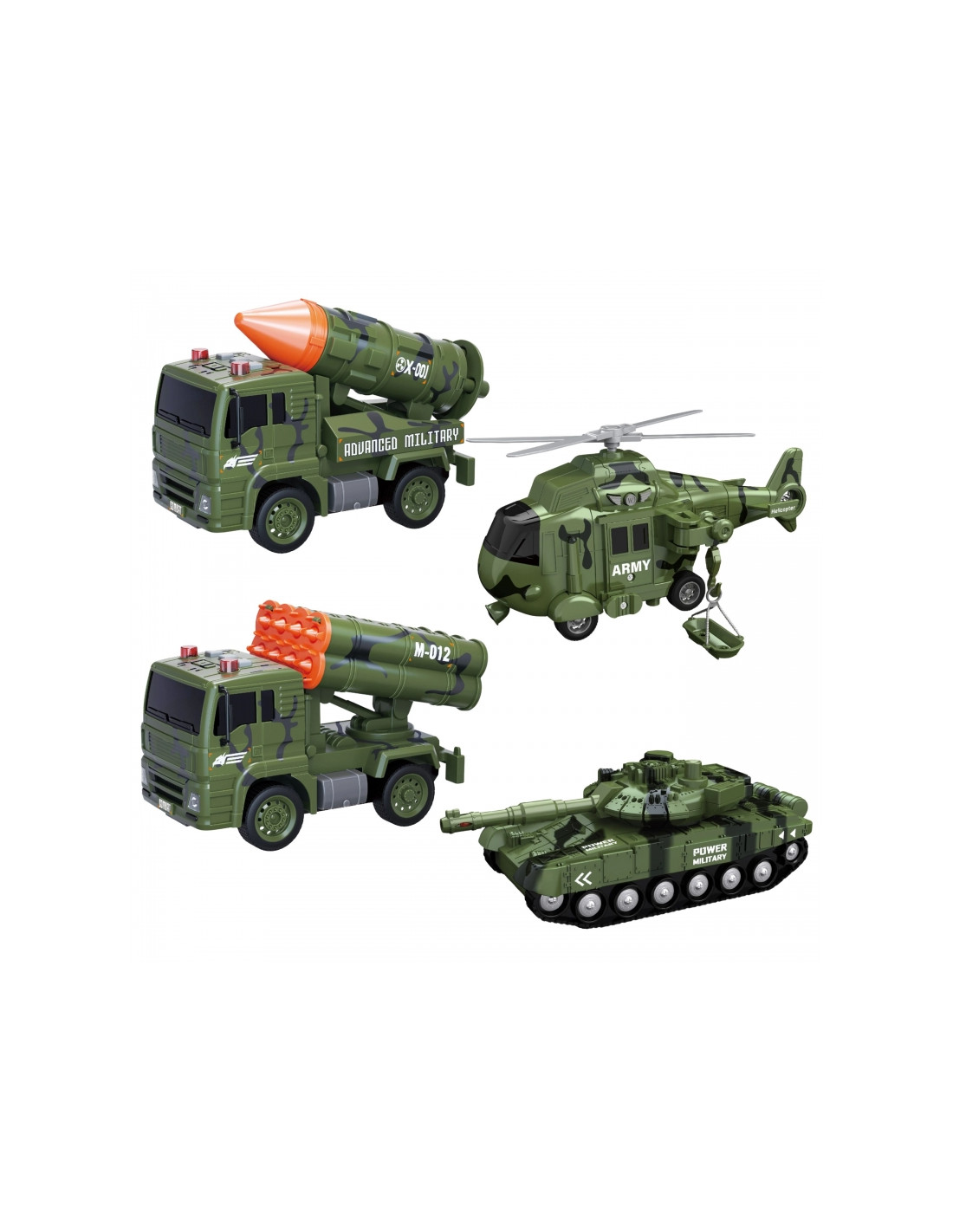 The complete military vehicle set from Woopie is the perfect choice for any young military and action fan! This high-quality , 4-piece set includes realistic models of vehicles, such as a tank , a helicopter , and two powerful trucks with rocket launchers . The trucks are equipped with light and sound effects , making play incredibly dynamic and engaging. The helicopter features moving propellers and a rescue hook , inspiring role-playing rescue missions. The set develops imagination and creativity and is perfect for group play. Suitable for children aged 3 and up .