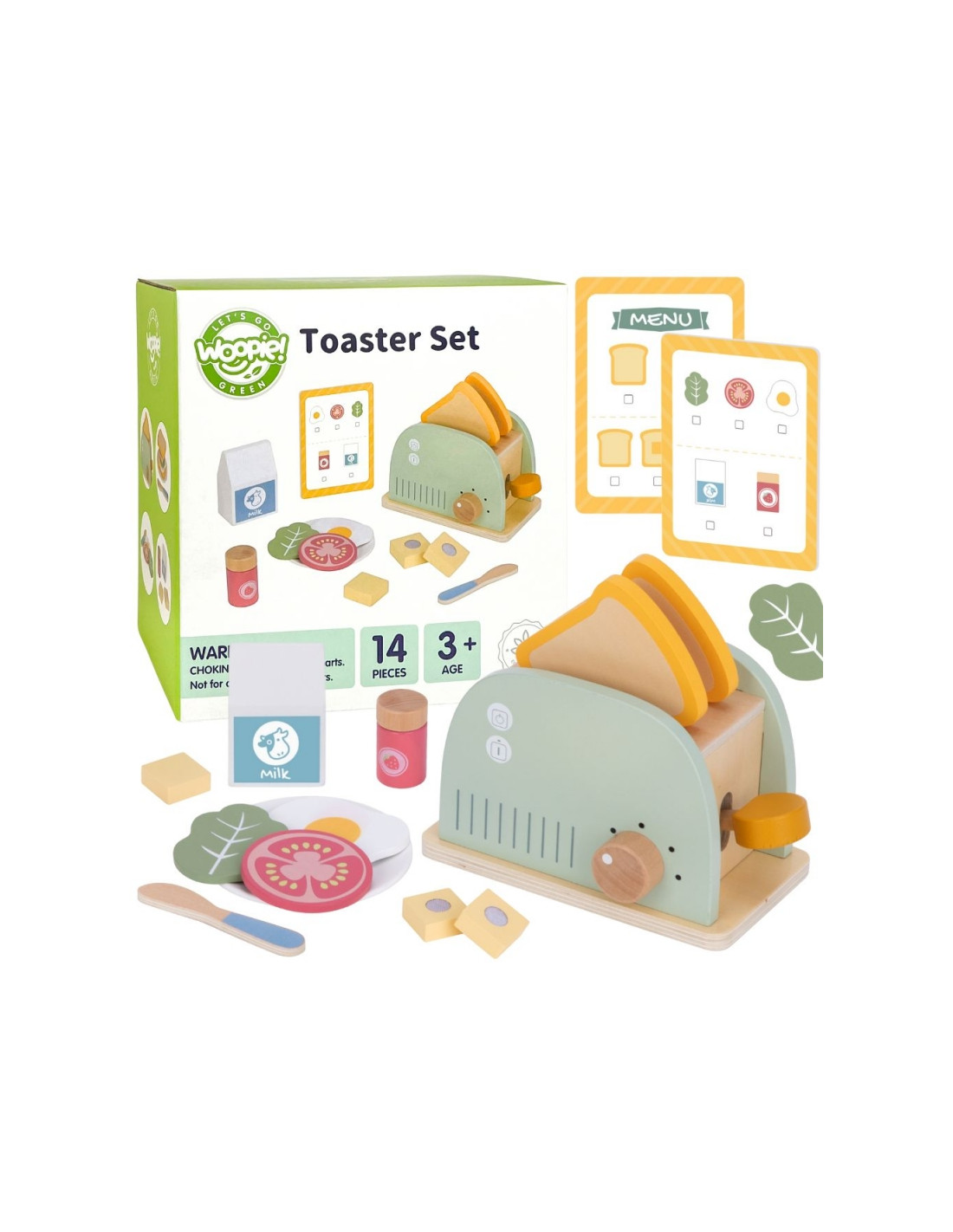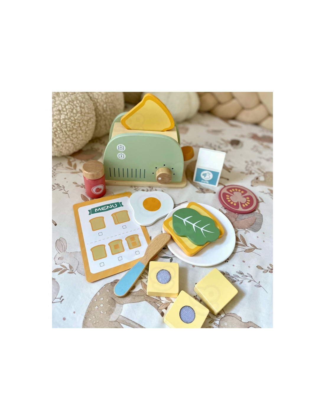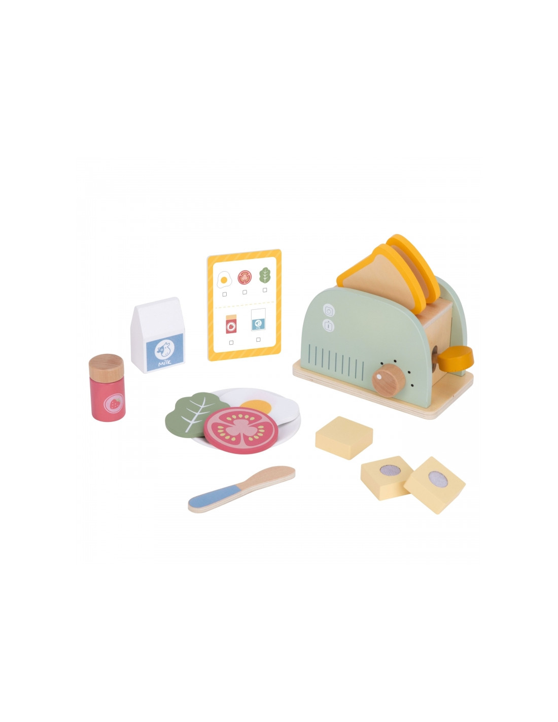 - - Colorful accessories - the set includes various accessories, such as slices of bread, butter, an egg, milk or a lettuce leaf, which allow you to compose tasty breakfast sets