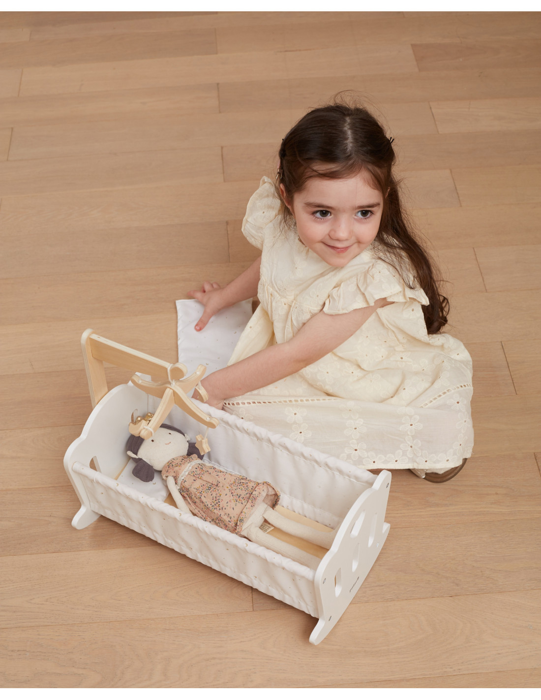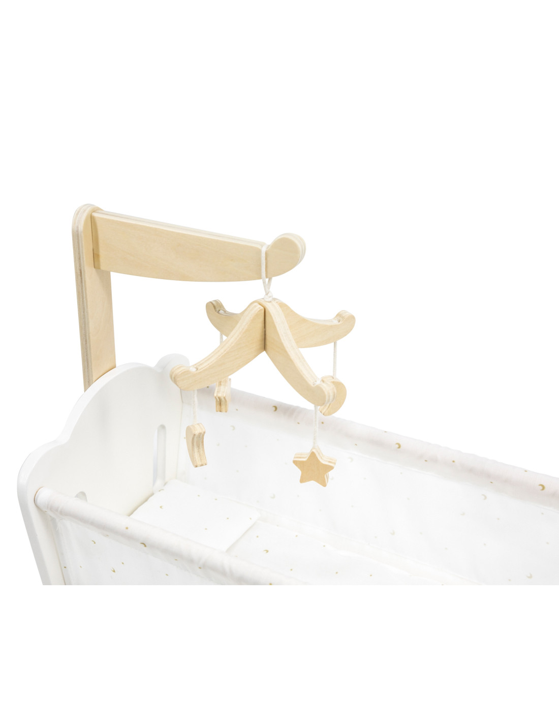 Lay your doll down to sleep in this beautifully crafted cradle from the PolarB series by VIGA . The cradle features a soft cotton pillow and duvet with a sweet star and moon print, plus a charming crib mobile. It fits dolls up to 38 cm tall.