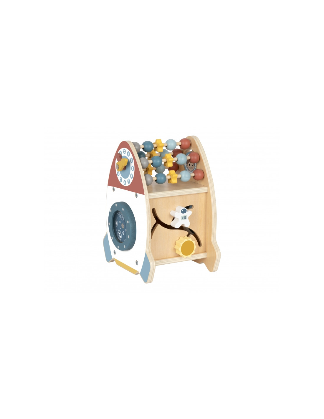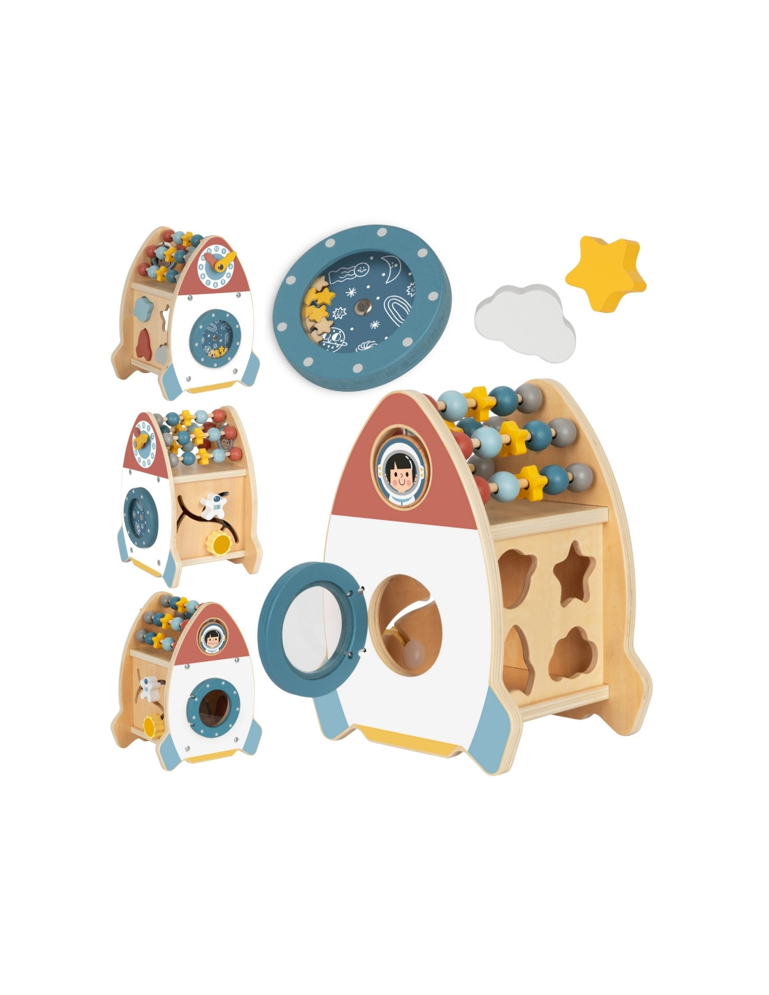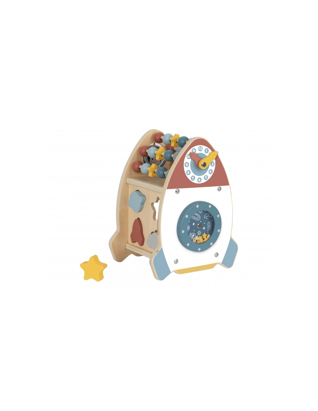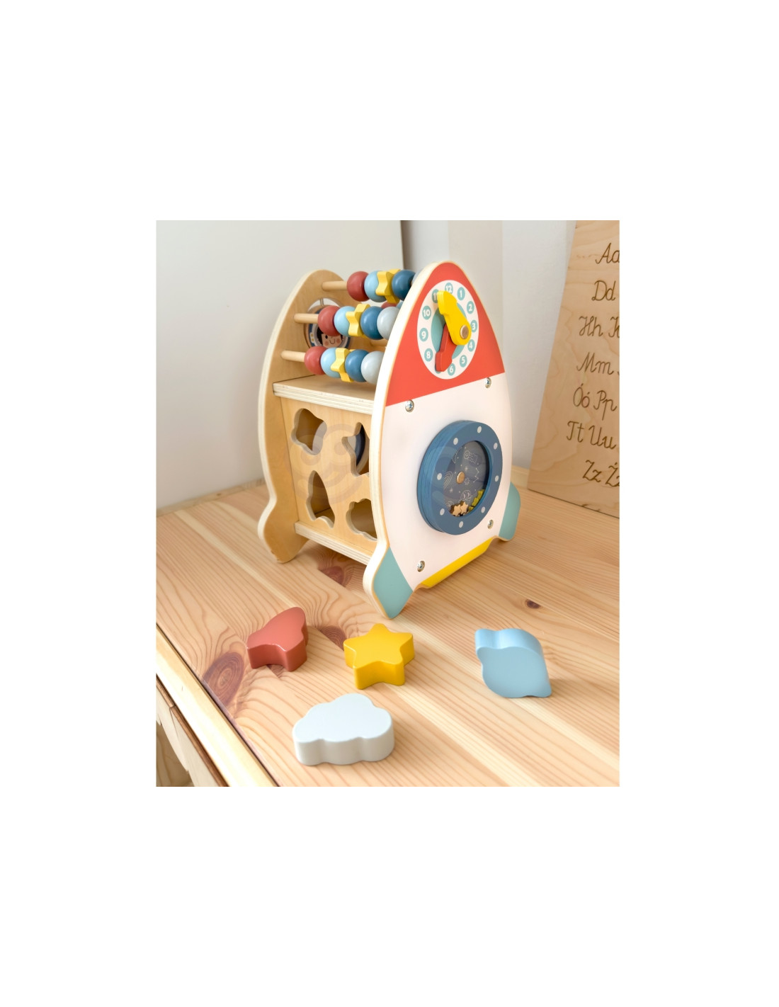 The Space Activity Rocket from Tooky Toy is a unique toy that invites little ones to discover the mysteries of space through engaging play . Its charming shape and soft colors are designed for children aged 18 months and up, combining aesthetics with safety . With six different active functions, such as moving beads, navigating a maze, rotating a galaxy, and sorting shapes, children can develop their motor skills, practice coordination, and spark their imagination.