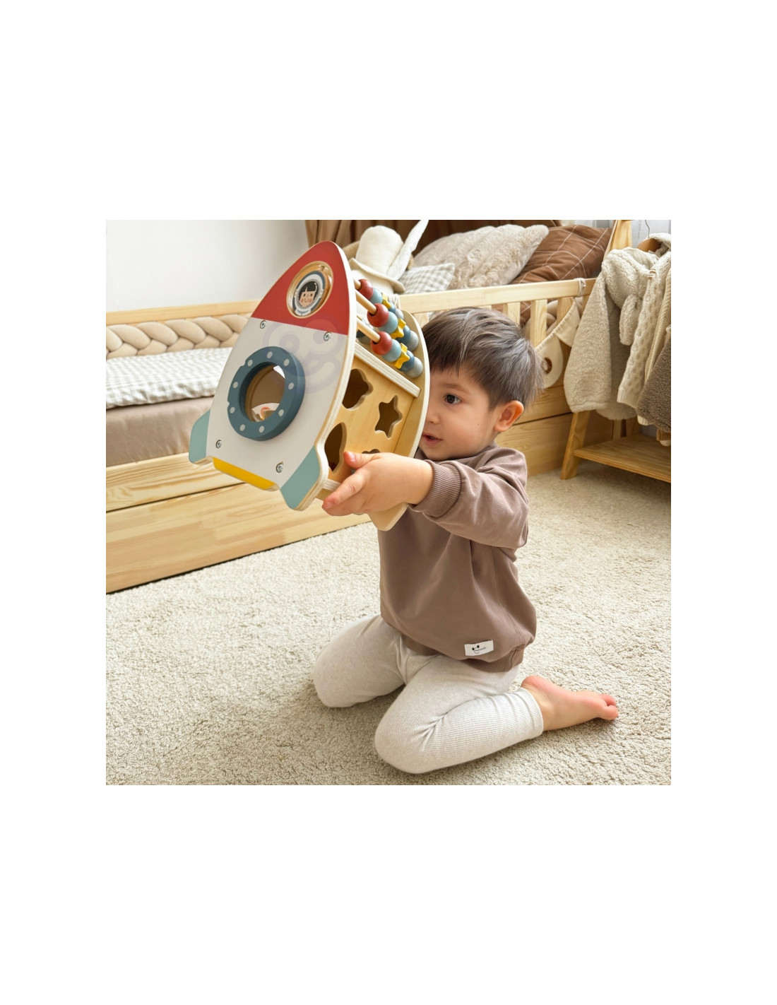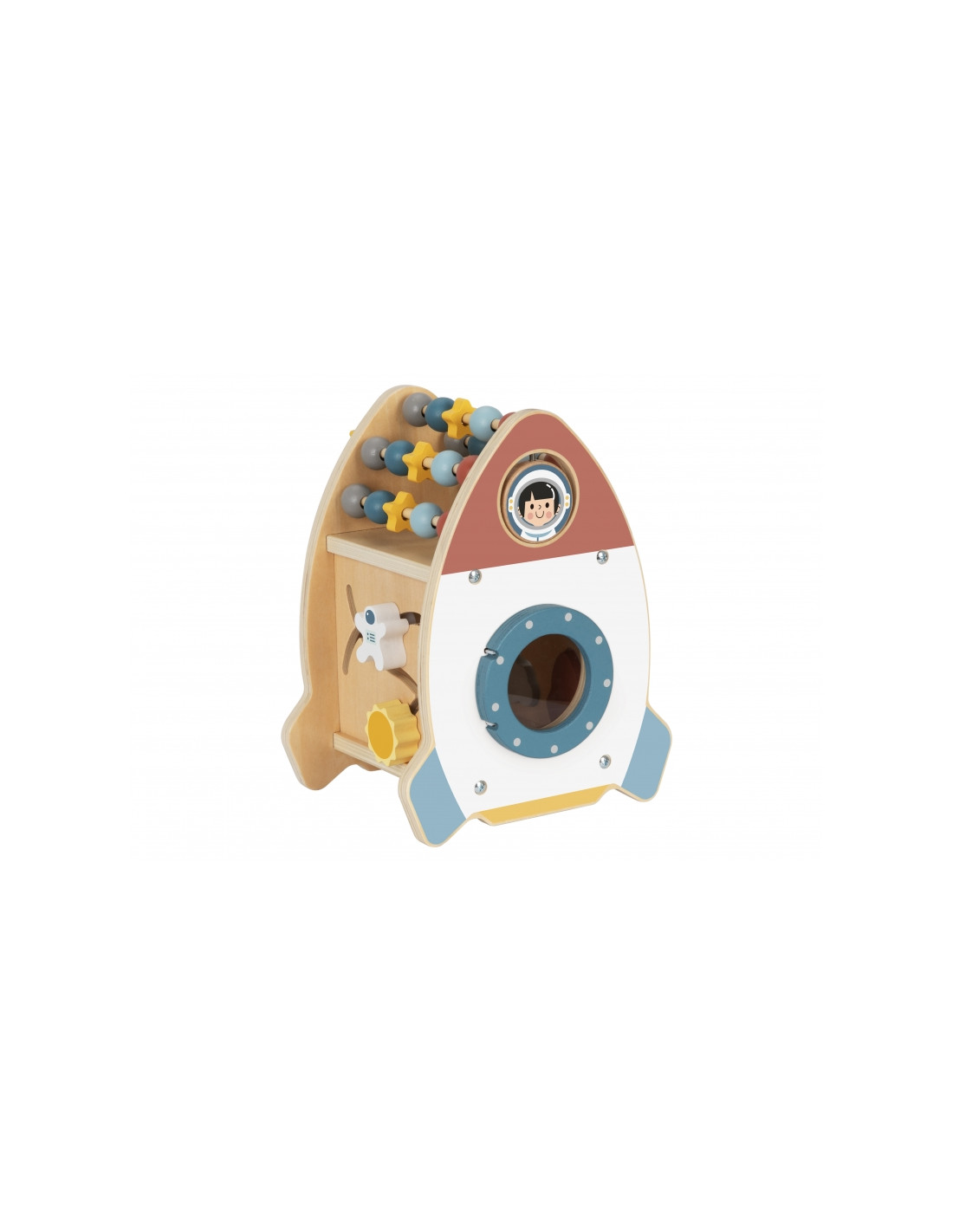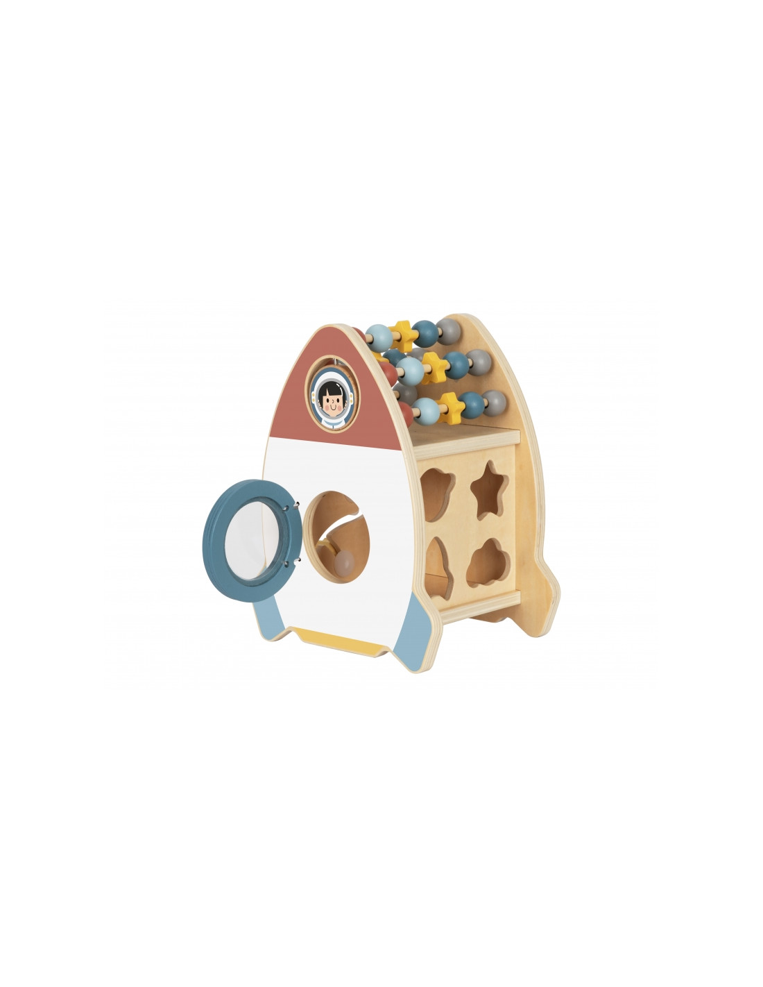 The Space Activity Rocket from Tooky Toy is a unique toy that invites little ones to discover the mysteries of space through engaging play . Its charming shape and soft colors are designed for children aged 18 months and up, combining aesthetics with safety . With six different active functions, such as moving beads, navigating a maze, rotating a galaxy, and sorting shapes, children can develop their motor skills, practice coordination, and spark their imagination.