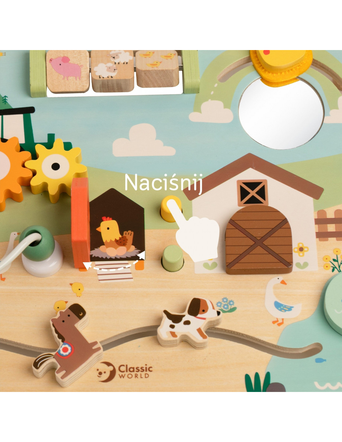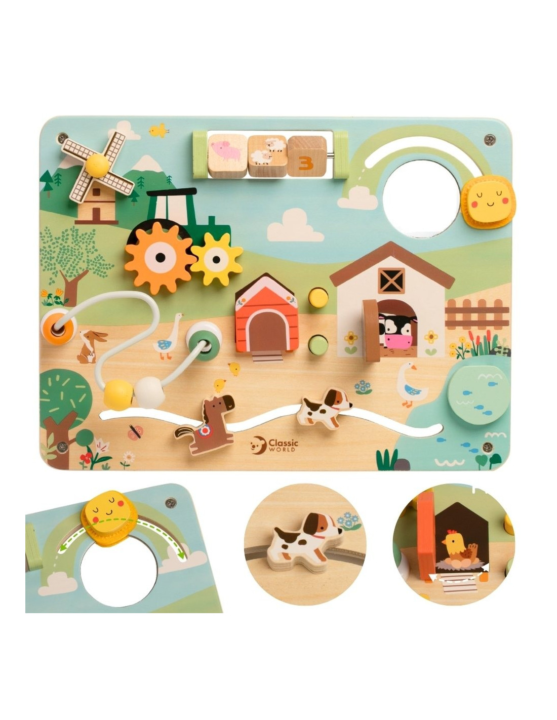 This wooden farm-themed activity board from Classic World is a unique toy that will take your child on a fascinating journey through the world of the countryside. This colorful activity board is specifically designed to stimulate your little one's senses through a variety of interactive elements. Your child can move beads around in a maze, open secret doors to reveal animals, and spin a windmill. It's a great way to develop fine motor skills and develop curiosity about the world in a safe and engaging way.