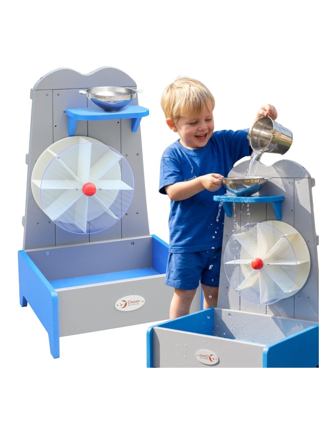 This wooden water wheel from the renowned Classic World brand is a great way to enhance outdoor play. This educational toy introduces children to the world of physics, water energy, and mechanics in a simple and engaging way. The structure consists of a metal funnel at the top, through which water is poured. The liquid flows down onto the impeller blades, setting the large wheel in rotation. The entire unit is protected by a transparent cover, allowing for safe observation of the process, while the water collects in a lower reservoir, ready for reuse.