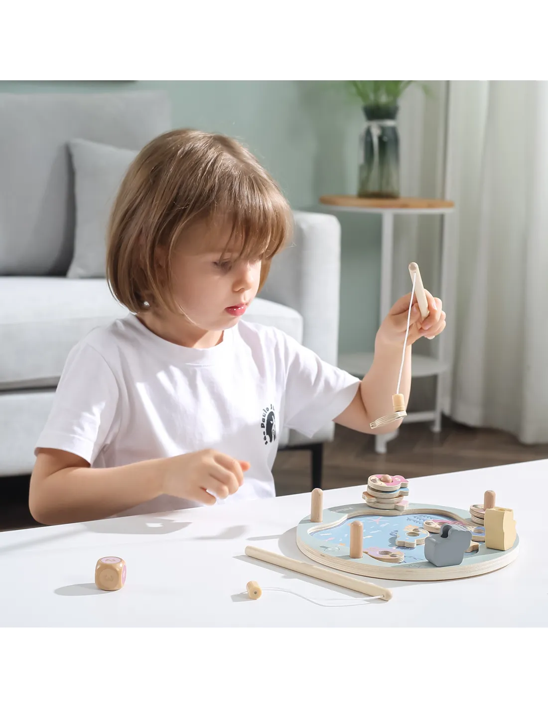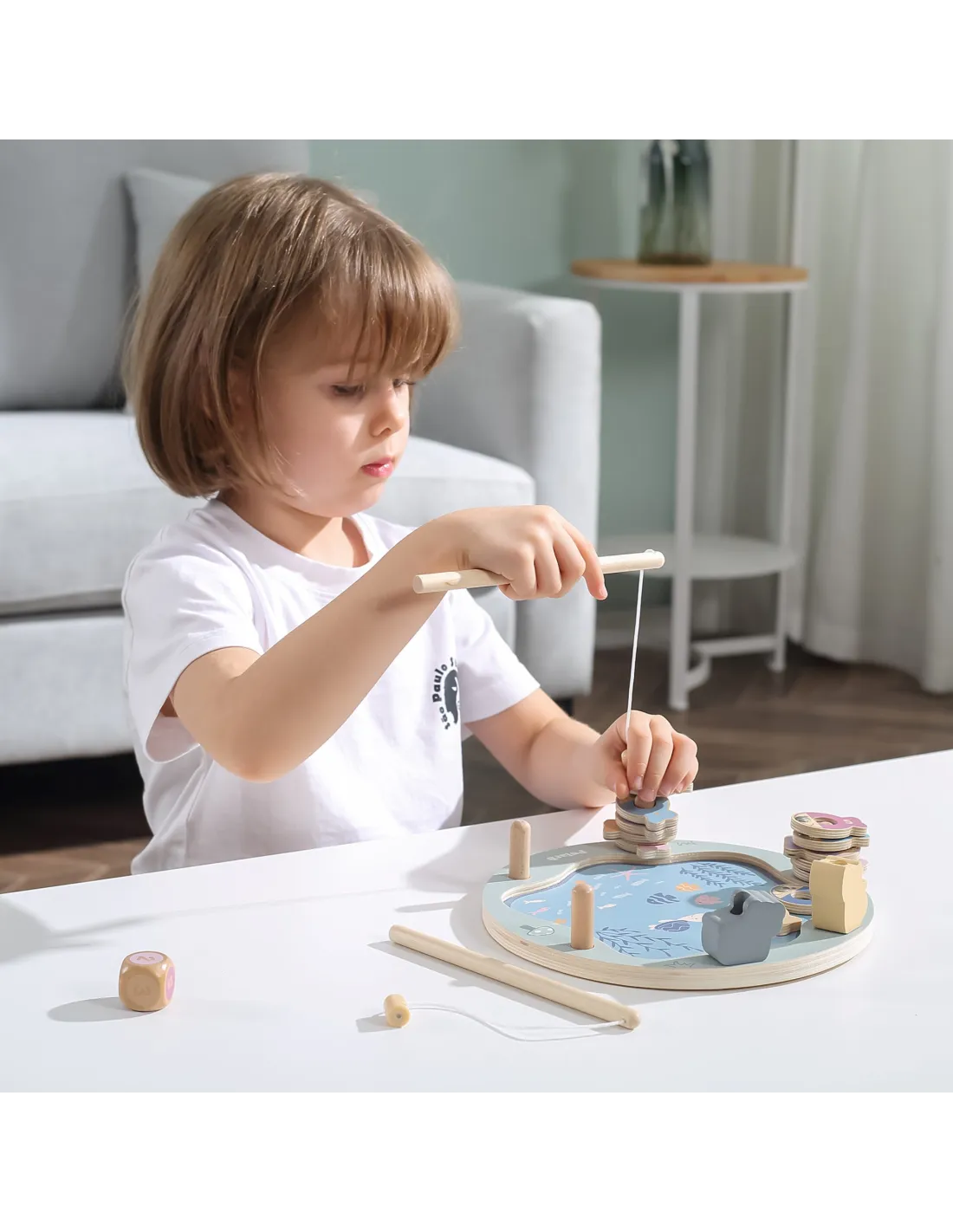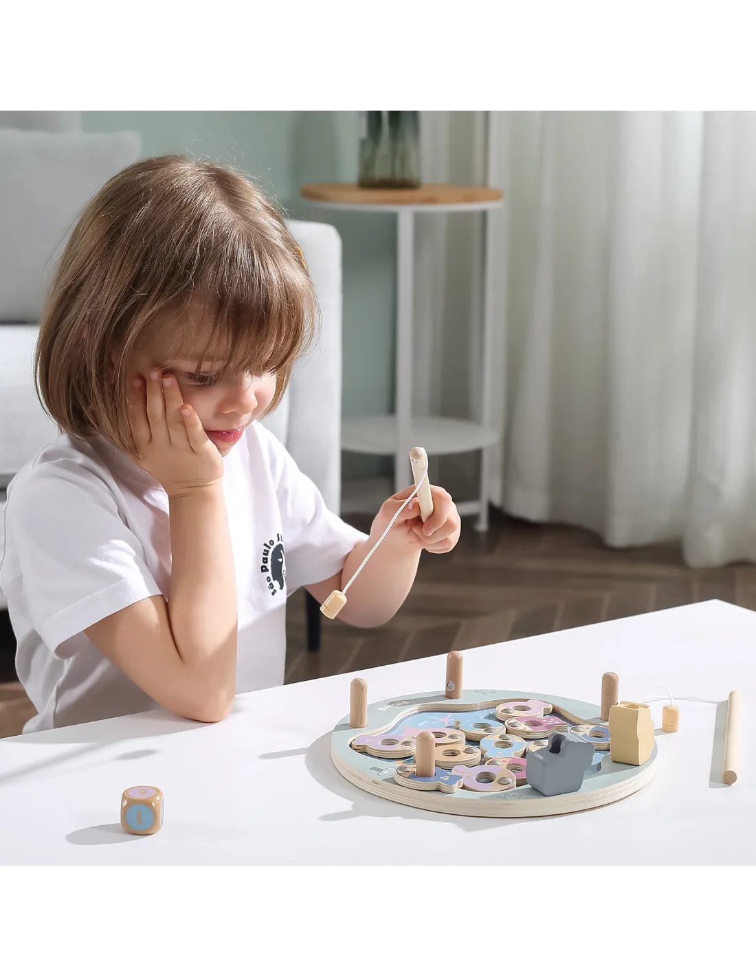 - - the toy includes: a wooden game stand, 2 fishing rods, a die and 12 fish,