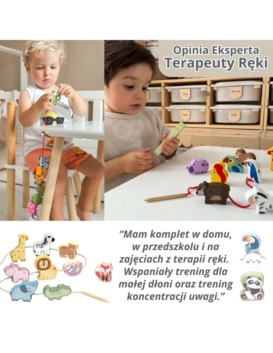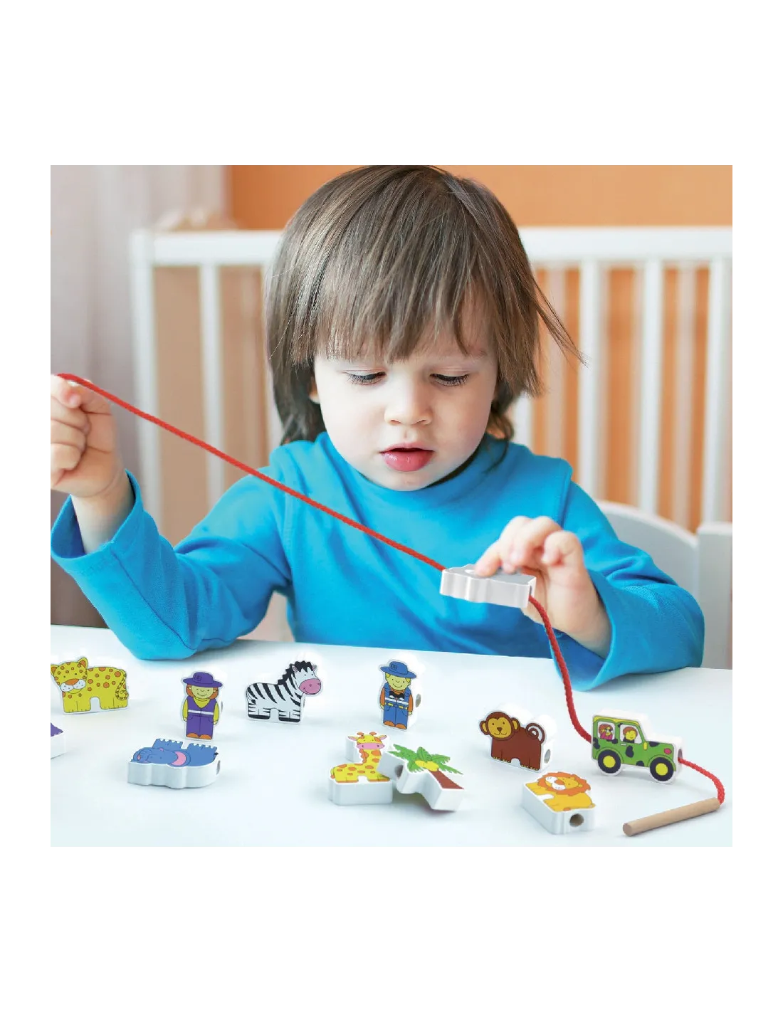- - the set includes a string with a wooden element (resembling a needle) that makes it easier for the child to thread it through the holes,