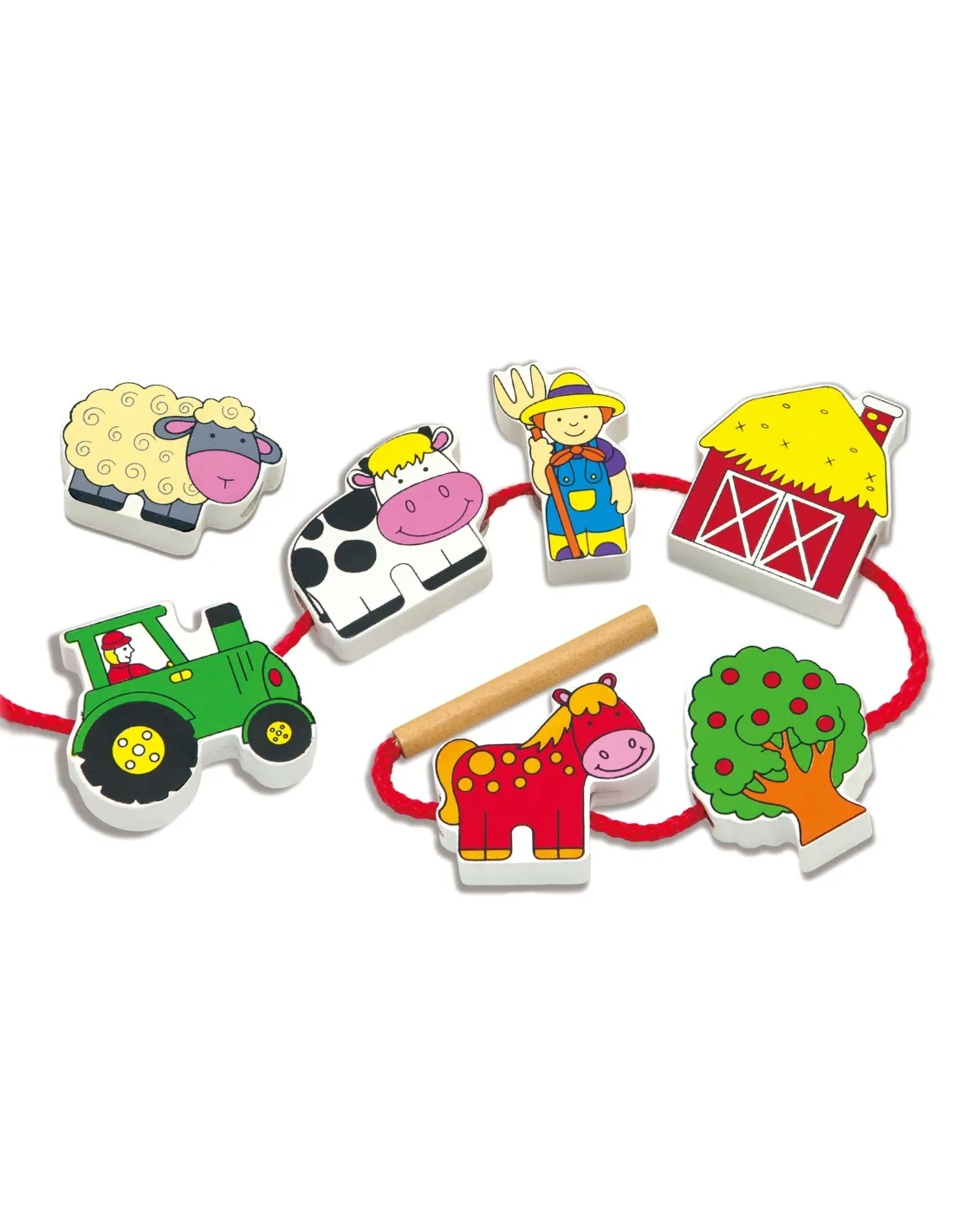 - - the set contains 12 wooden threading elements (including a cow, a horse, a sheep, a tractor, a barn, a tree and a farmer figurine),