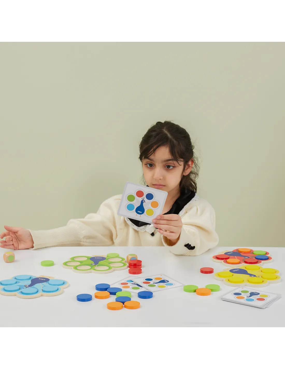 The "Match the Colors - Peacock Tail " toy from Viga involves placing discs in the peacock's tail according to the instructions on the included cards or filling in the holes with colored blocks according to the dice. This activity helps children learn colors , develop fine motor skills , and hand-eye coordination by combining play with learning in accordance with the Montessori approach . Playing together is the best way to develop imagination , which is so important at this age, while also preparing the child for future preschool education.