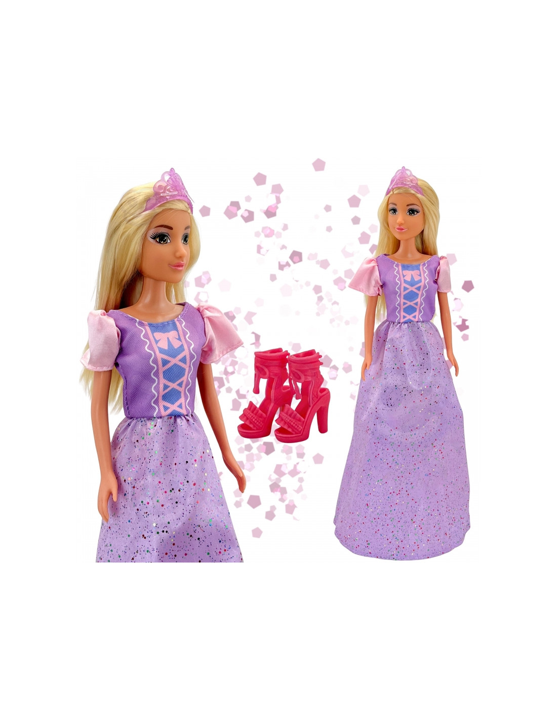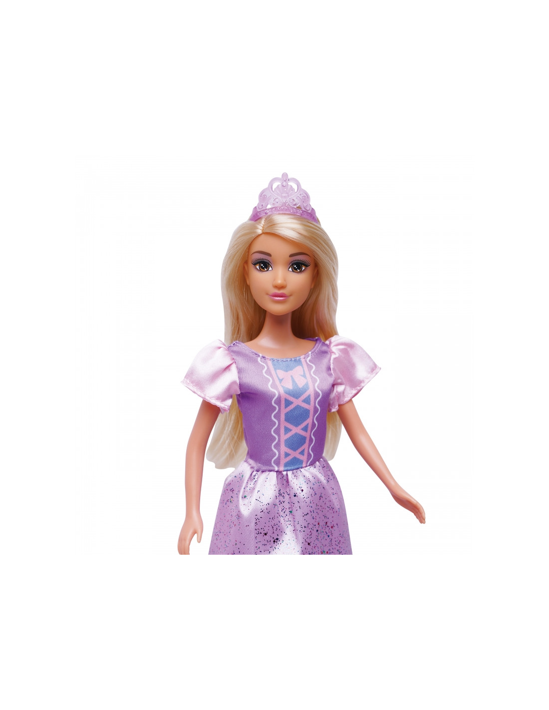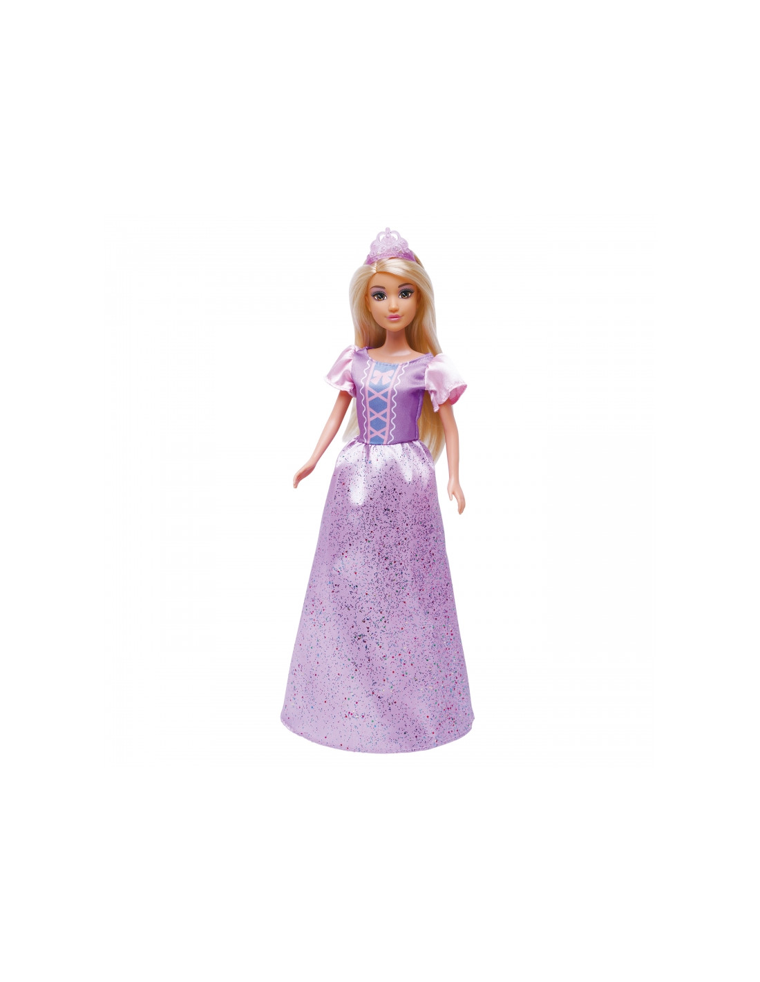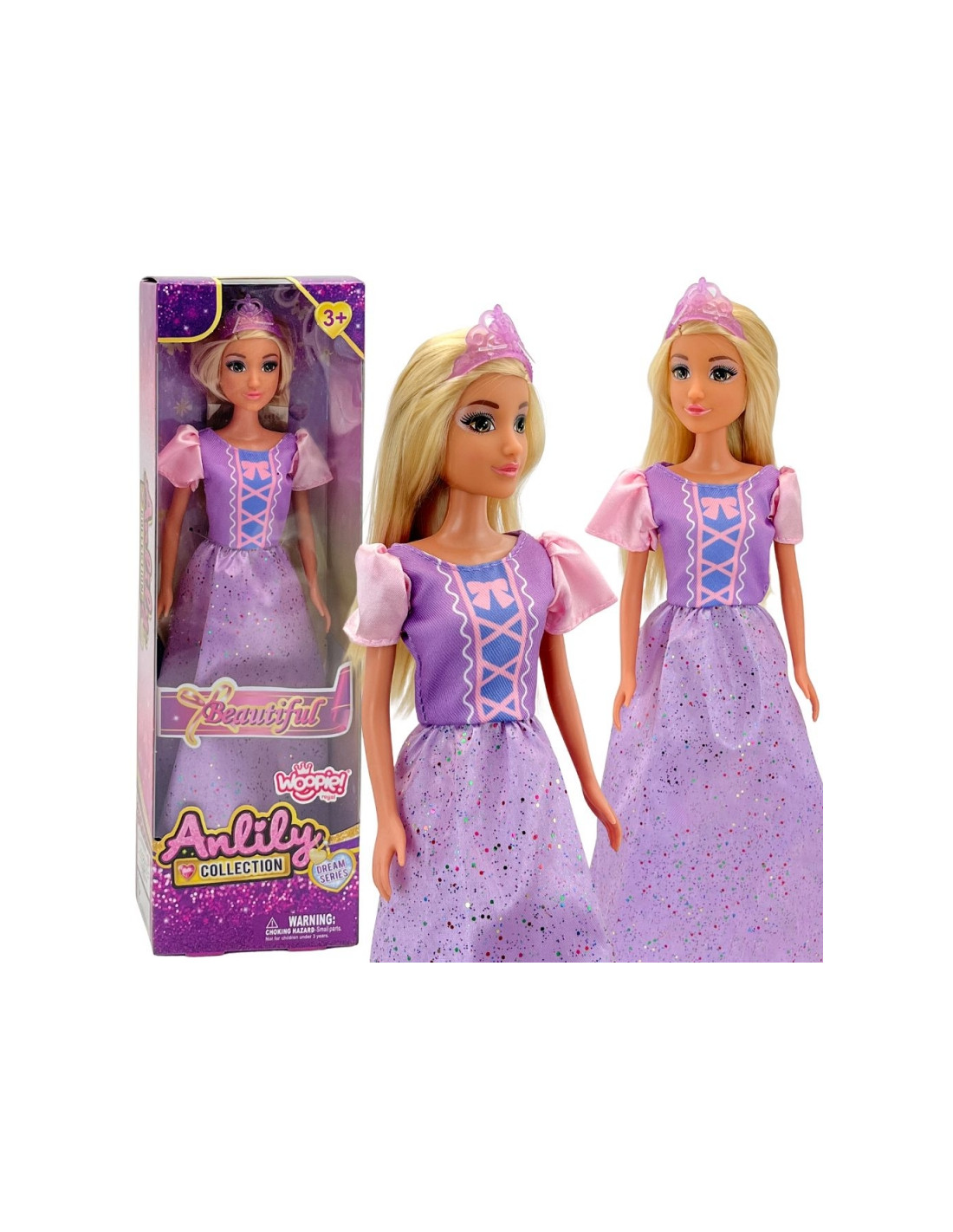 The Princess Lily doll from Woopie is the perfect gift for a little lover of princesses and magical stories! This beautiful doll has long, blonde hair that can be brushed and styled , developing children's fine motor skills. She wears a striking, long, purple and pink ball gown with a corset and puffed sleeves, adorned with sparkling flecks. A sheer, purple tiara accentuates her royal character. This doll sparks imagination , encourages fairytale-themed role-play , and is the perfect companion for creative adventures. Suitable for children aged 3 and up .