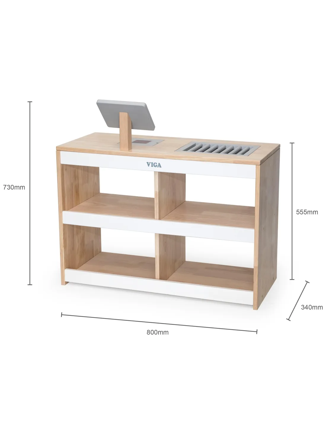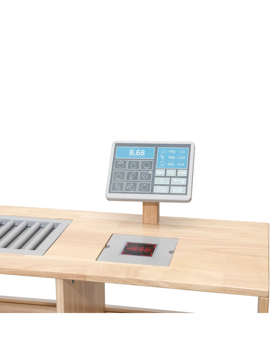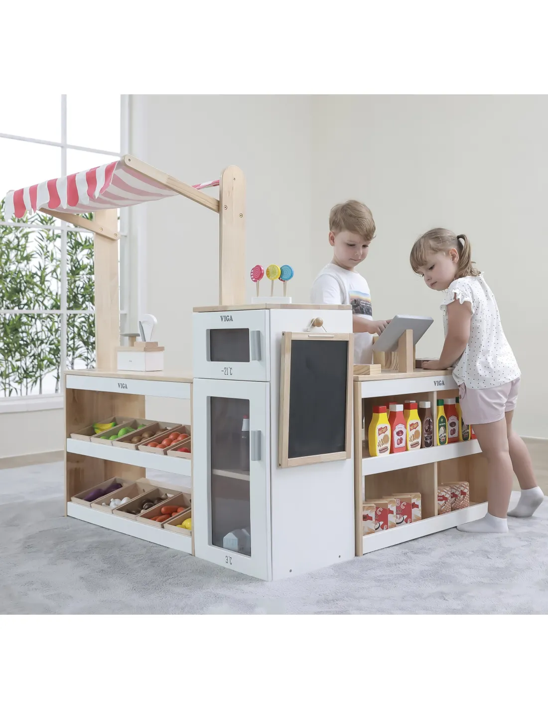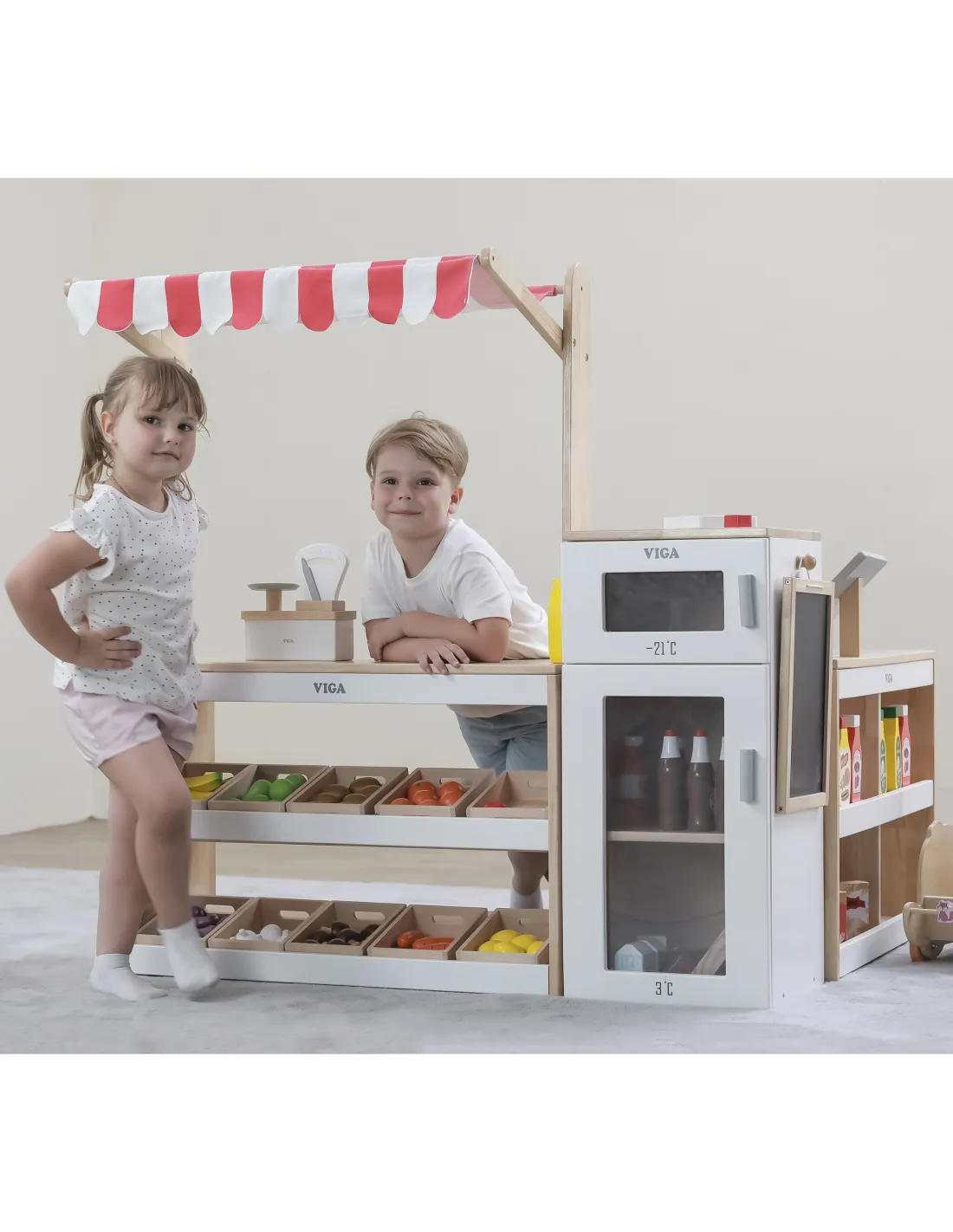 The Wooden Shop XXL from VIGA is a comprehensive set that will transport your little one to the fascinating world of commerce! This extensive set includes everything needed for creative shop play: a wooden stall, a cash register with accessories, a refrigerator, a scale, a shopping cart, and a selection of groceries and sweets .