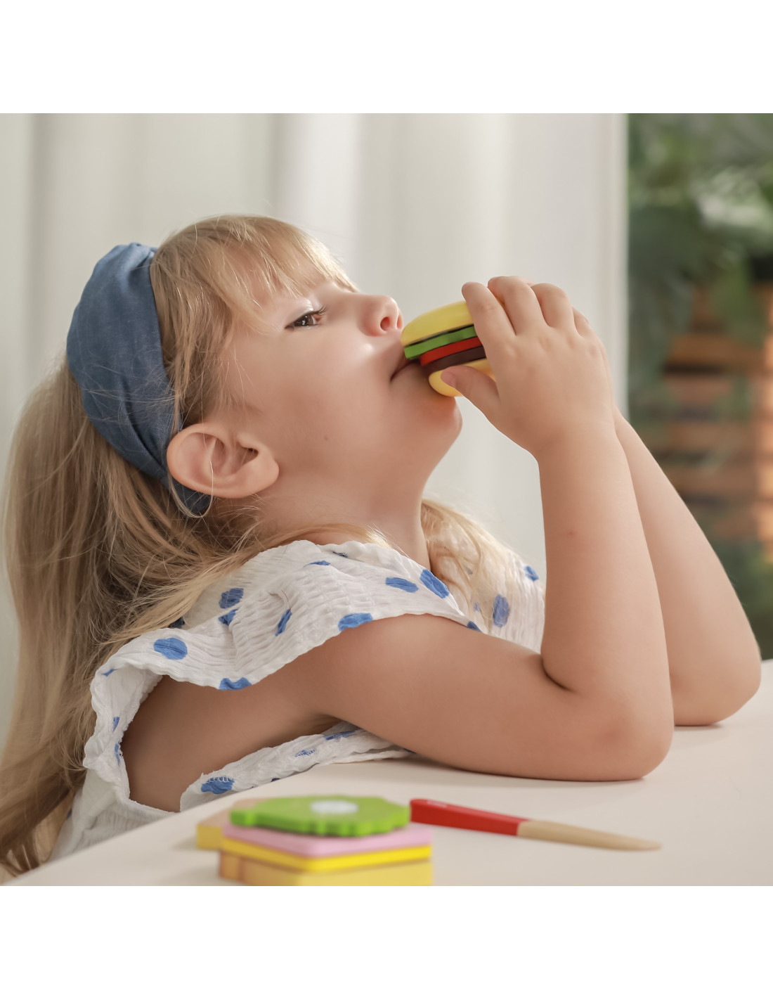 • - the set includes: a knife, 2 slices of toast bread, 1 hamburger bun, 2 lettuce leaves, 2 tomato slices, a slice of yellow cheese, a slice of ham, a hamburger cutlet,