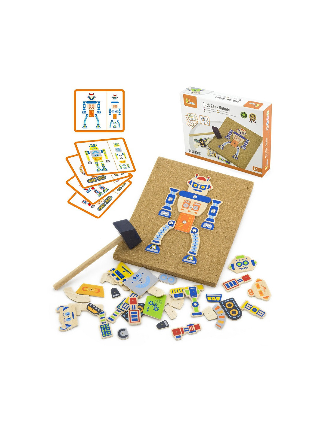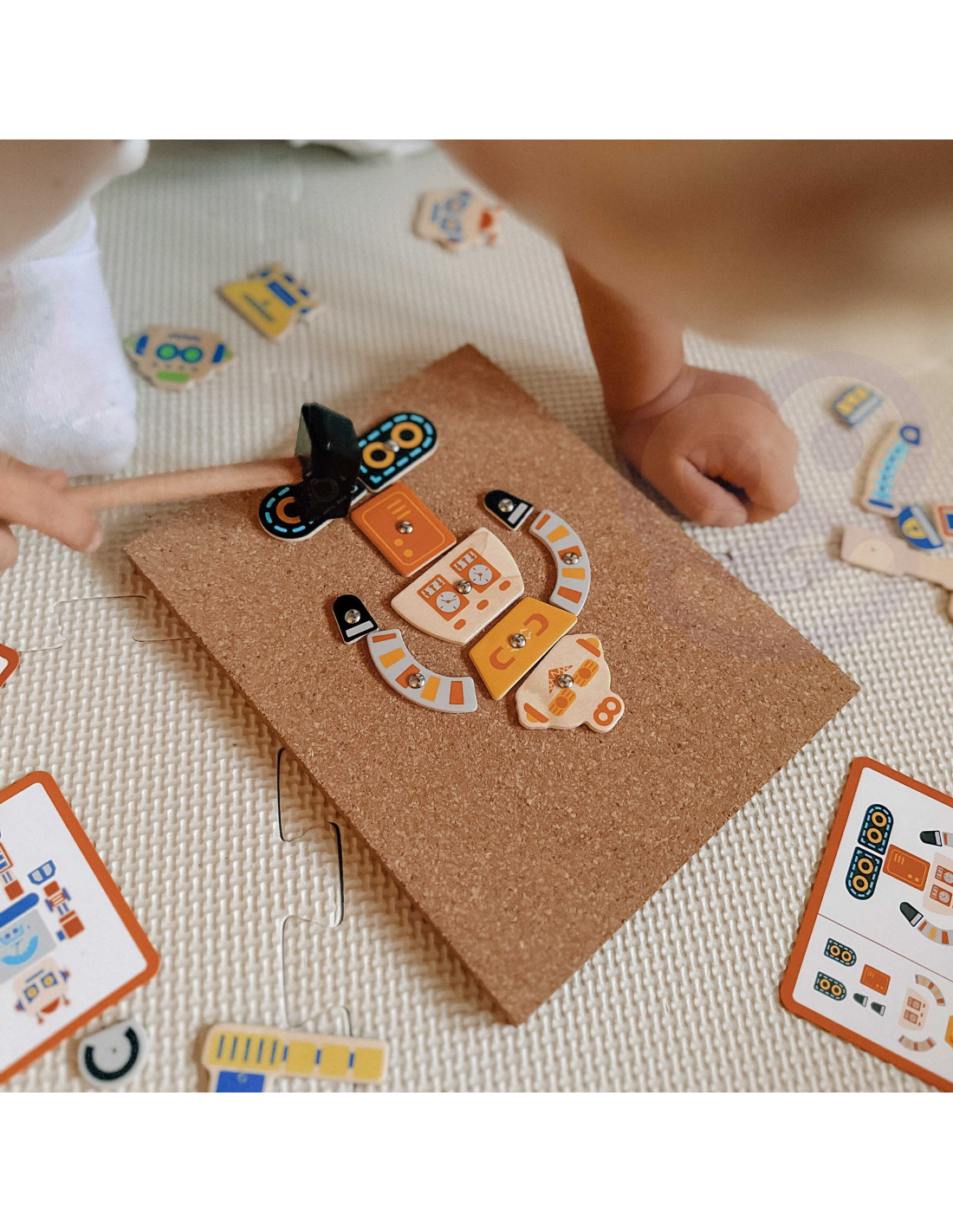 Discover the fascinating world of technology and creativity with this wooden hammer from Viga , which will transform your child's room into a true robot laboratory! This brilliant Montessori- inspired toy allows toddlers to safely operate a hammer, combining colorful elements into unique, mechanical structures. Each pin inserted is not only great fun but, above all , a precision and coordination exercise that will engage the child's attention for hours. Thanks to the included inspiration cards, your child can recreate ready-made models or let their imagination run wild and create their own robot of the future.