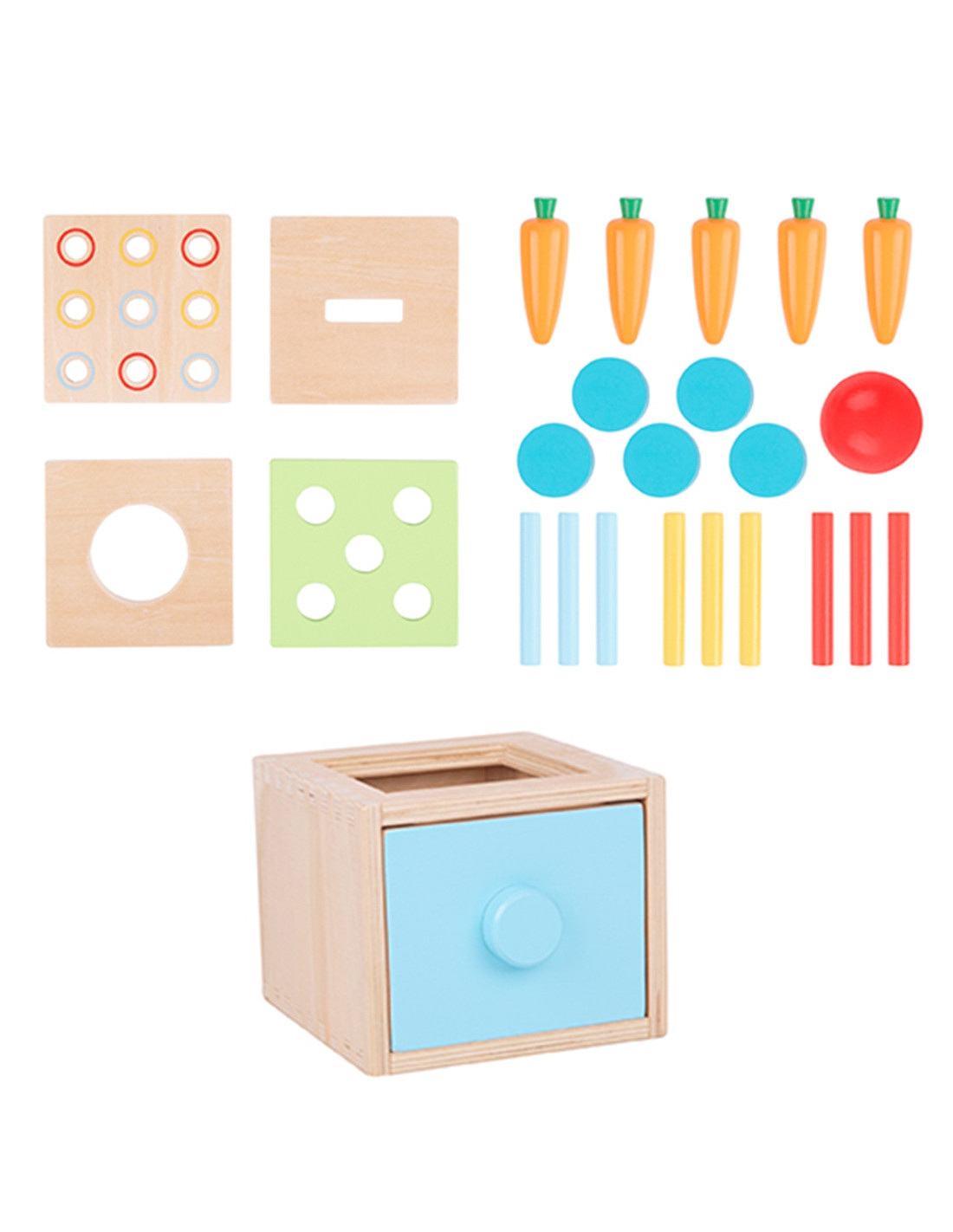 - - The set contains 26 elements: a drawer, 4 inserts, 1 ball, 5 coins, 5 carrots, 9 colored sticks