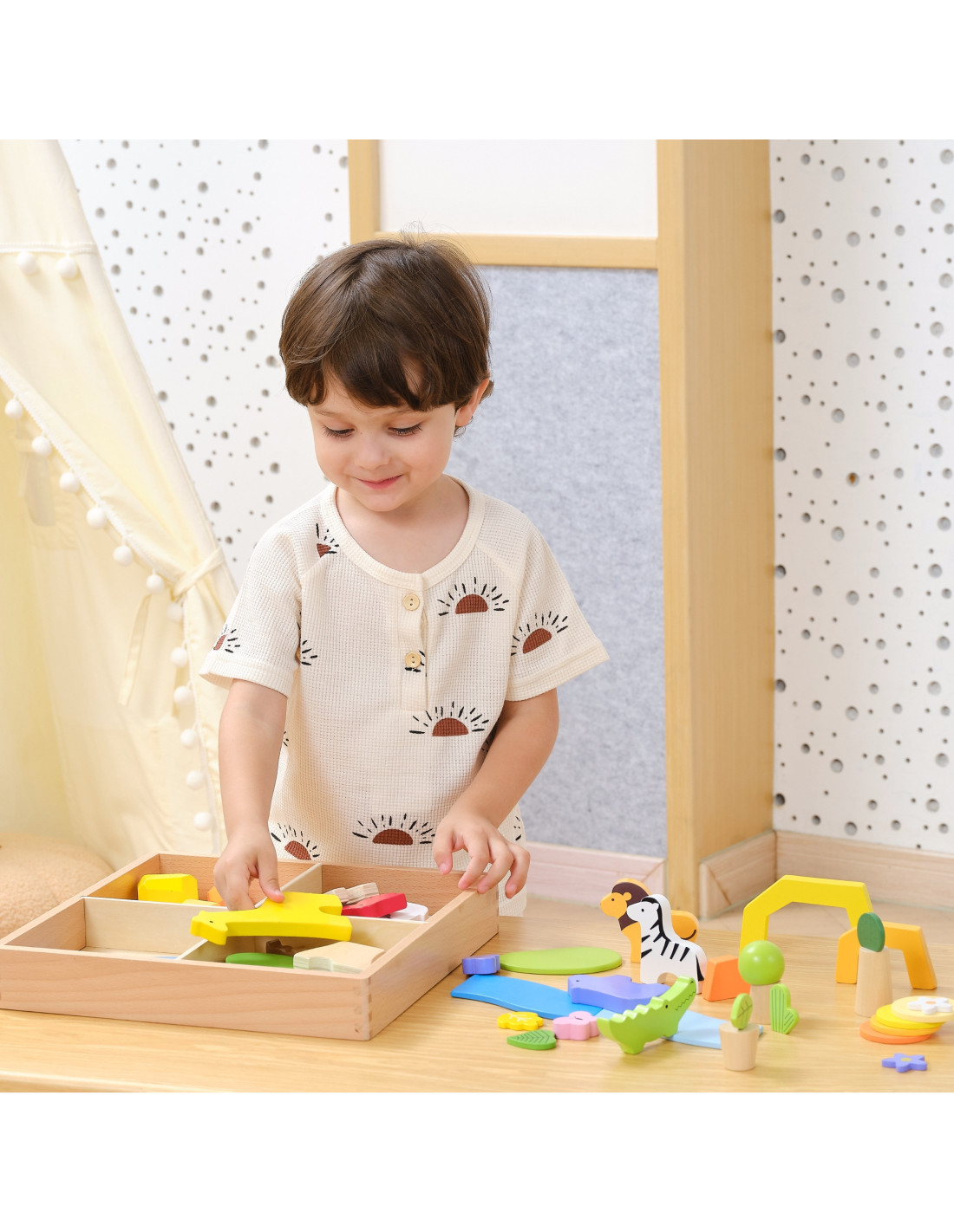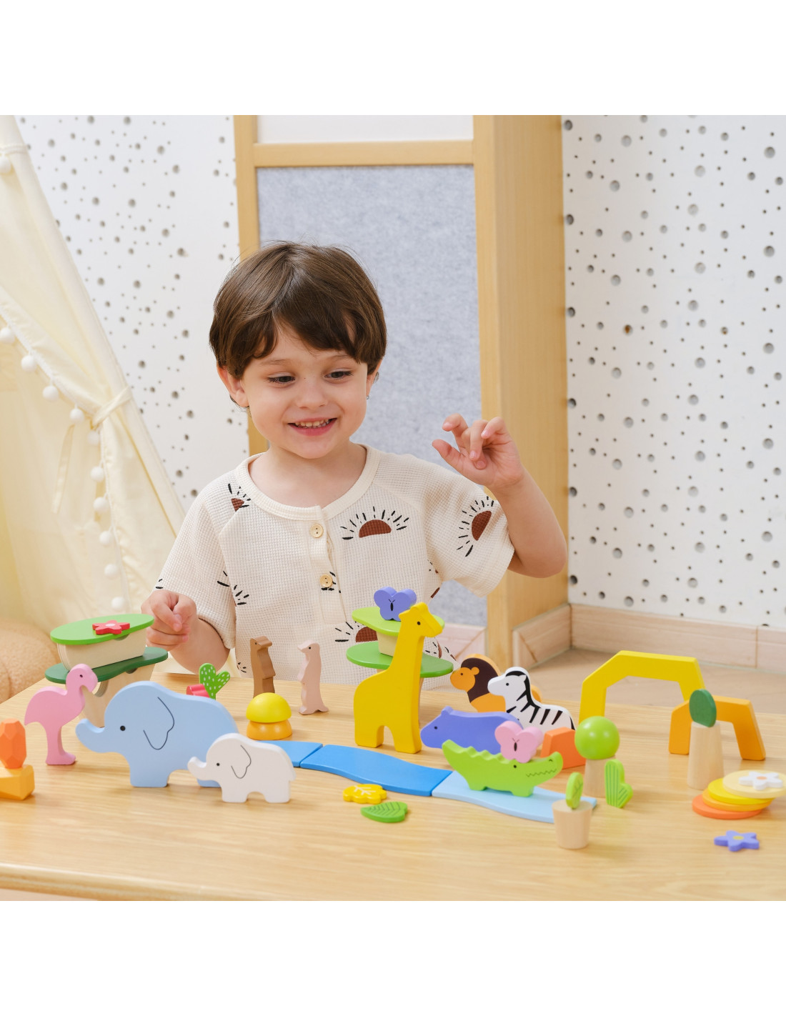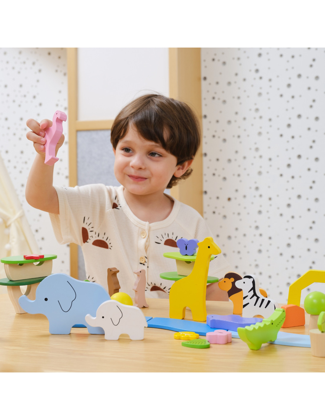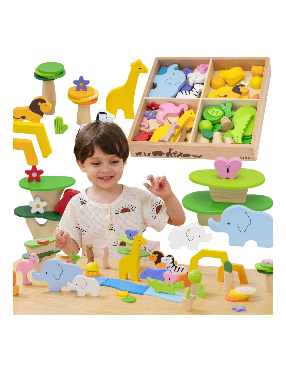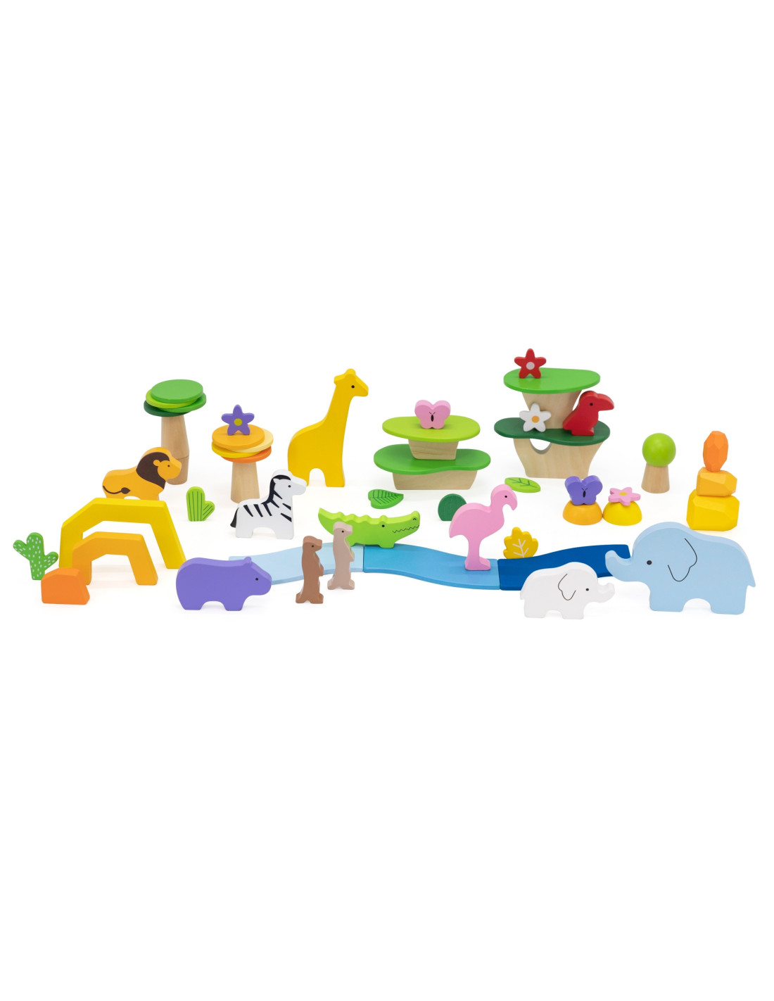 Transport your child to the world of African adventure with the VIGA Colorful Tropical Stories Blocks set! This incredibly rich set, consisting of 55 wooden, loose pieces , is the essence of open-ended play and learning in the Montessori spirit. Savannah animal figurines— an elephant, giraffe, lion, and zebra —along with elements of tropical vegetation and a river, inspire little ones to create their own scenarios and develop their creativity . The blocks support fine motor skills and concentration , and thanks to the convenient, wooden box with compartments, cleanup is as easy as play.