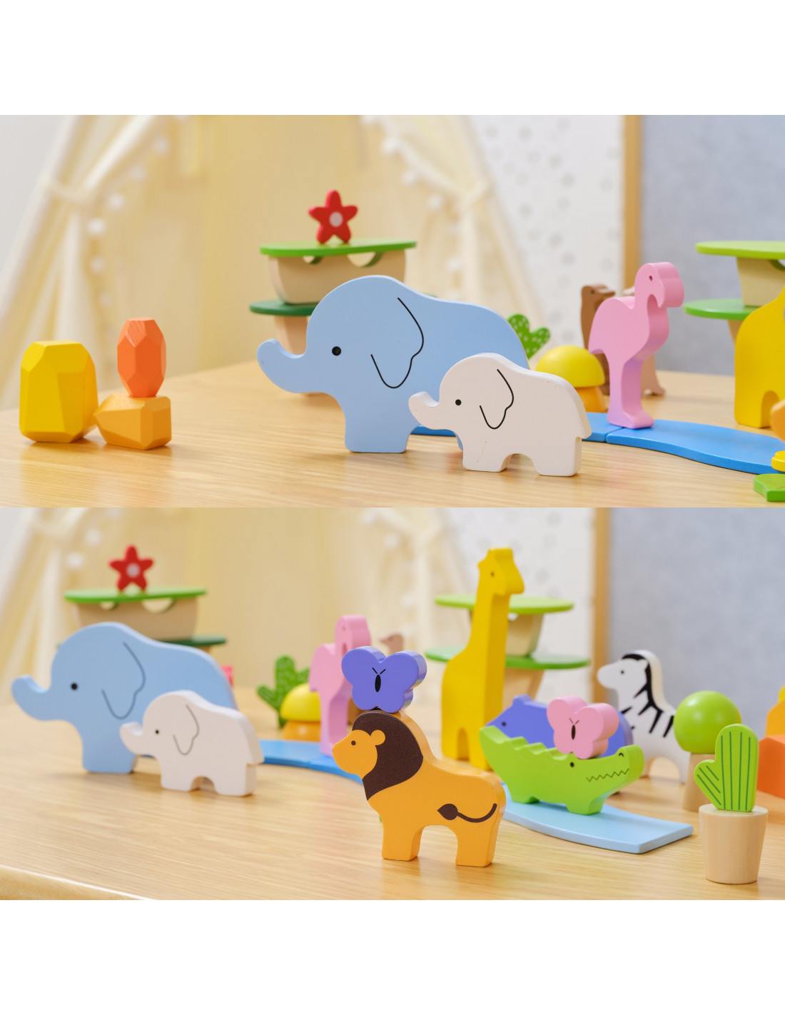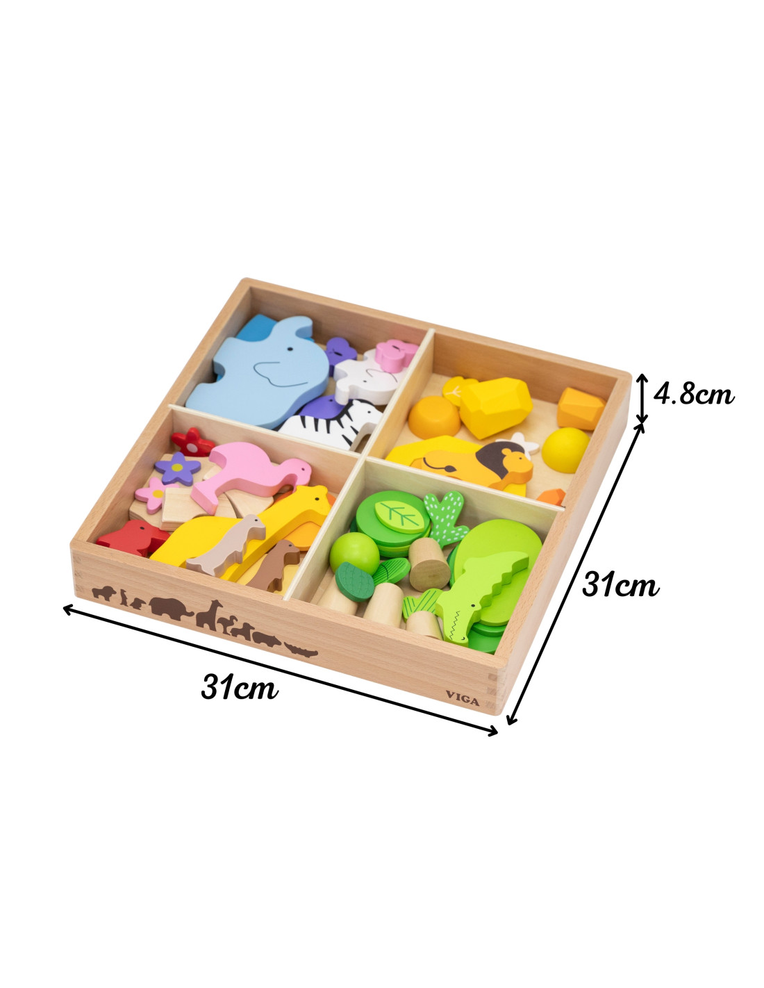 - - 55 wooden elements (tropical animal figures and environmental elements)