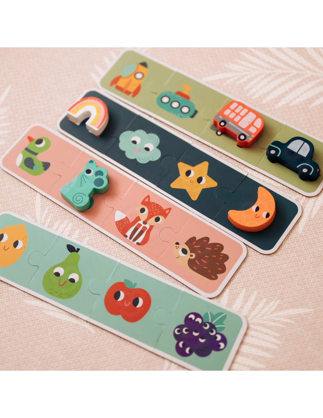 The rules of the game are simple : each player must find the correct wooden object in a canvas bag, using only their sense of touch. Choosing from a variety of shapes, such as animals, fruits, or vehicles, allows for the ability to adjust the difficulty level to the age and skill of the players, making the game both educational and exciting !