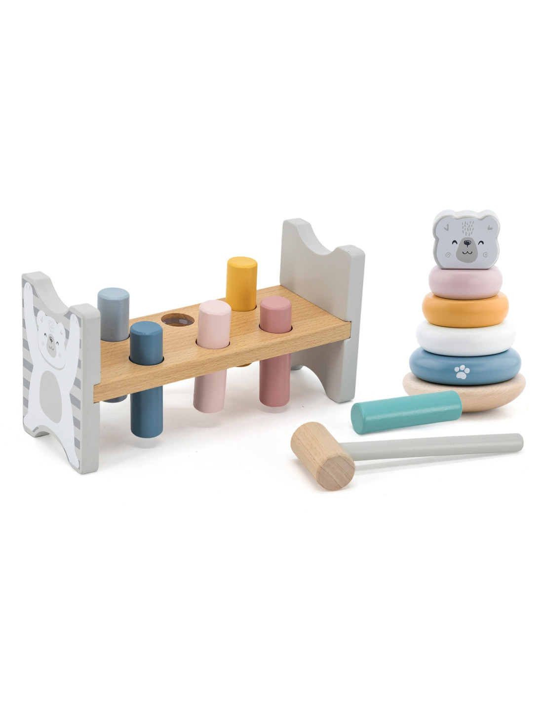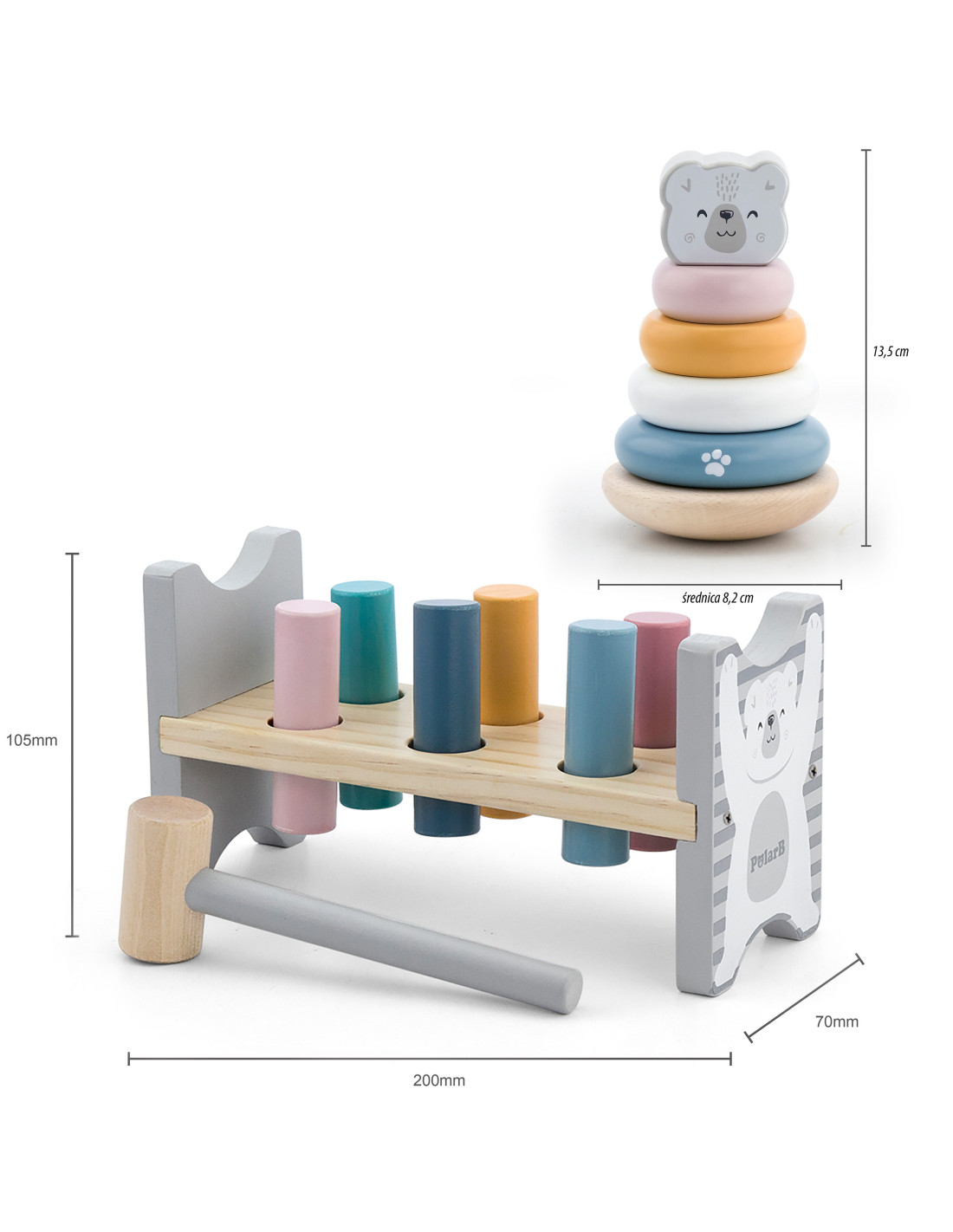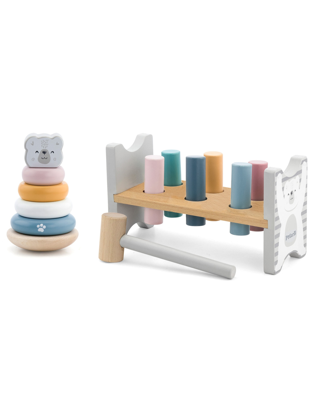 This set from the PolarB series by Viga includes two pastel wooden toys: an educational pyramid and a hammer and punch. Both toys will not only keep your child entertained but will also contribute to the development of fine motor skills , logical thinking , and learning colors . Spending time with these toys will help your child develop precise hand movements, which will facilitate learning to write later.