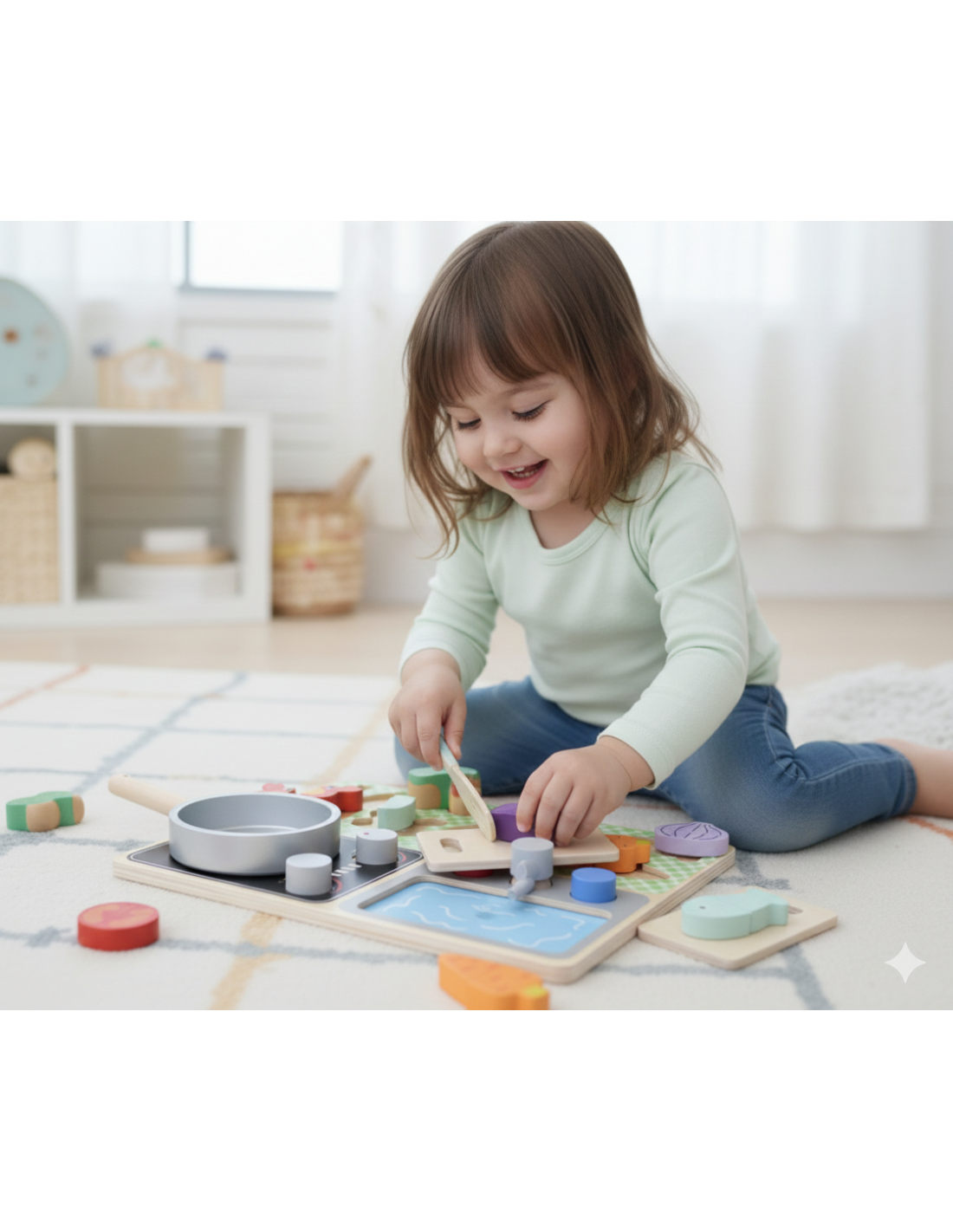 This fantastic kitchen is a complete culinary set that combines learning to cook with developing your child's fine motor skills. The set features a realistic burner with moving knobs, a sink with a faucet, and a shape sorter that teaches matching elements like carrots, eggplants, and fish. The sturdy wooden construction ensures safety and durability, and the pastel colors perfectly complement the aesthetic of a modern children's room.