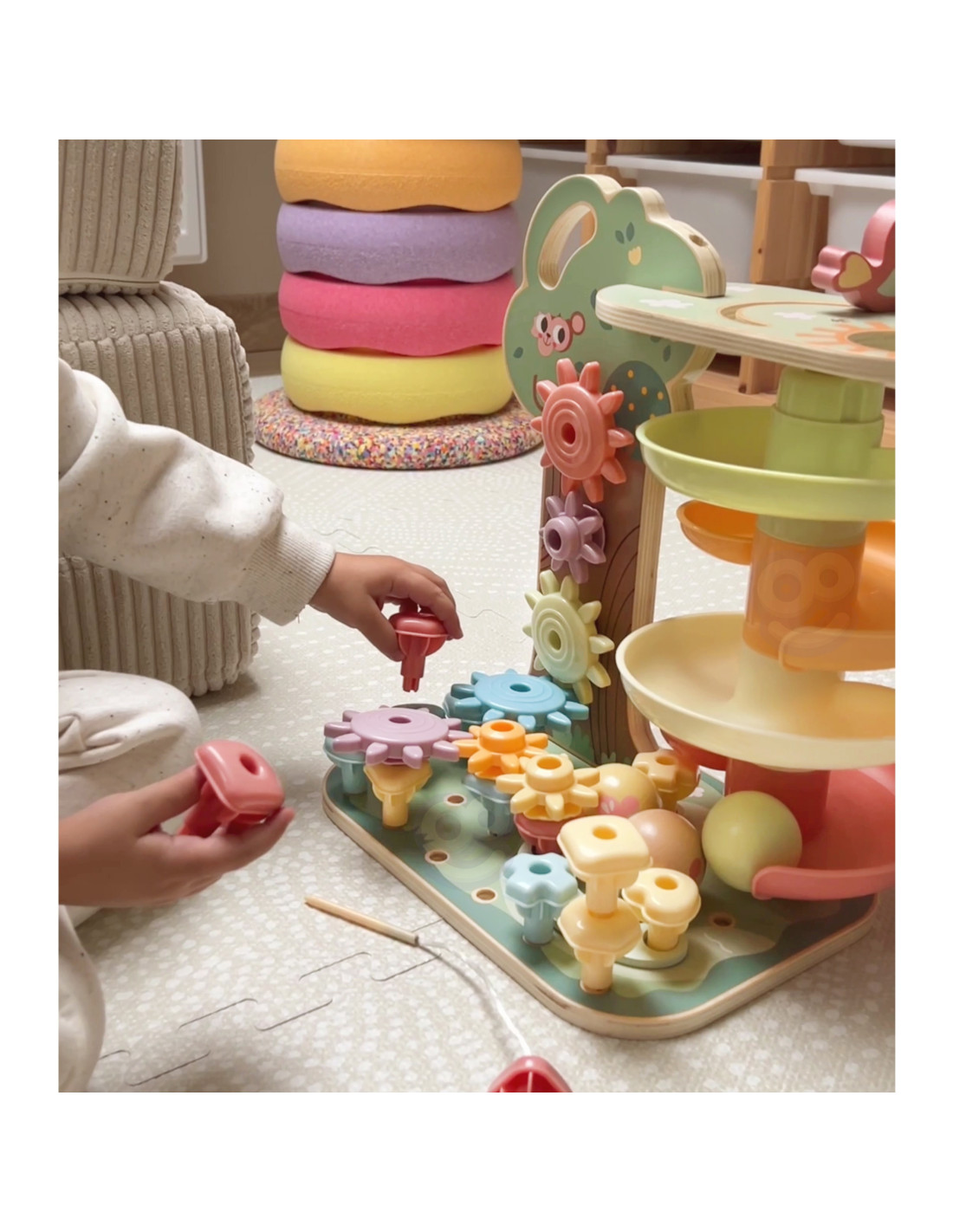 A colorful ball track, sensory gears, pegs for inserting, and a creative threading machine – all in a beautiful, pastel setting and made of safe, durable materials