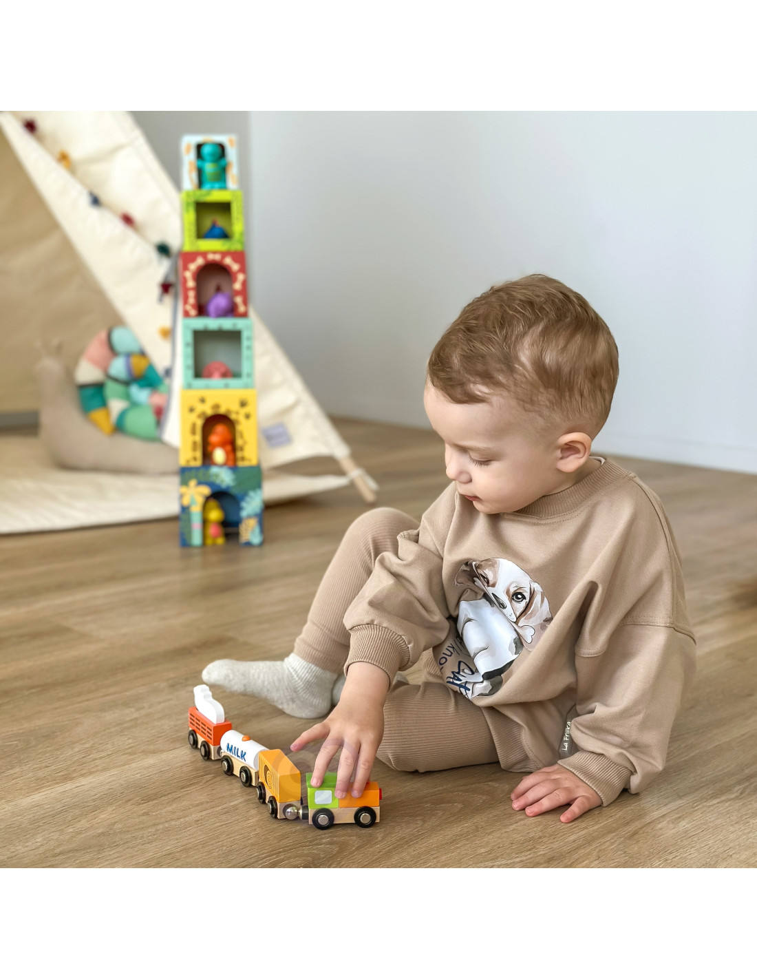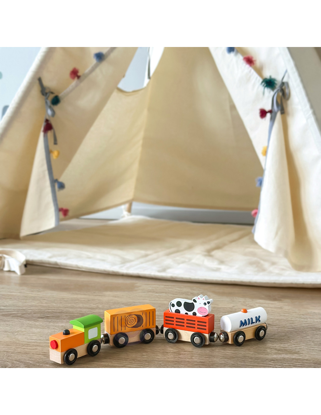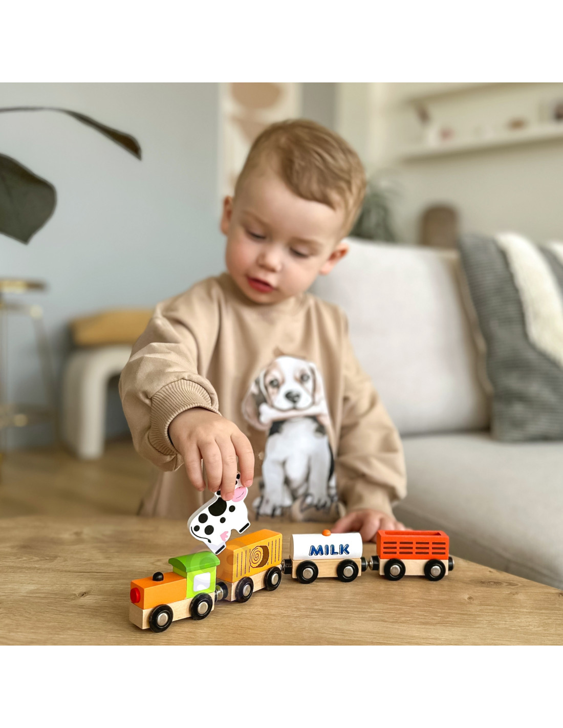 The Viga Farm Train is a charming addition to any wooden train set, bringing the fun to the farmyard. This colorful train consists of a locomotive and three carriages that transport passengers and goods straight from the farm. Thanks to the use of universal magnetic connectors , the carriages can be freely detached and connected, allowing children to creatively build their own freight and passenger trains.