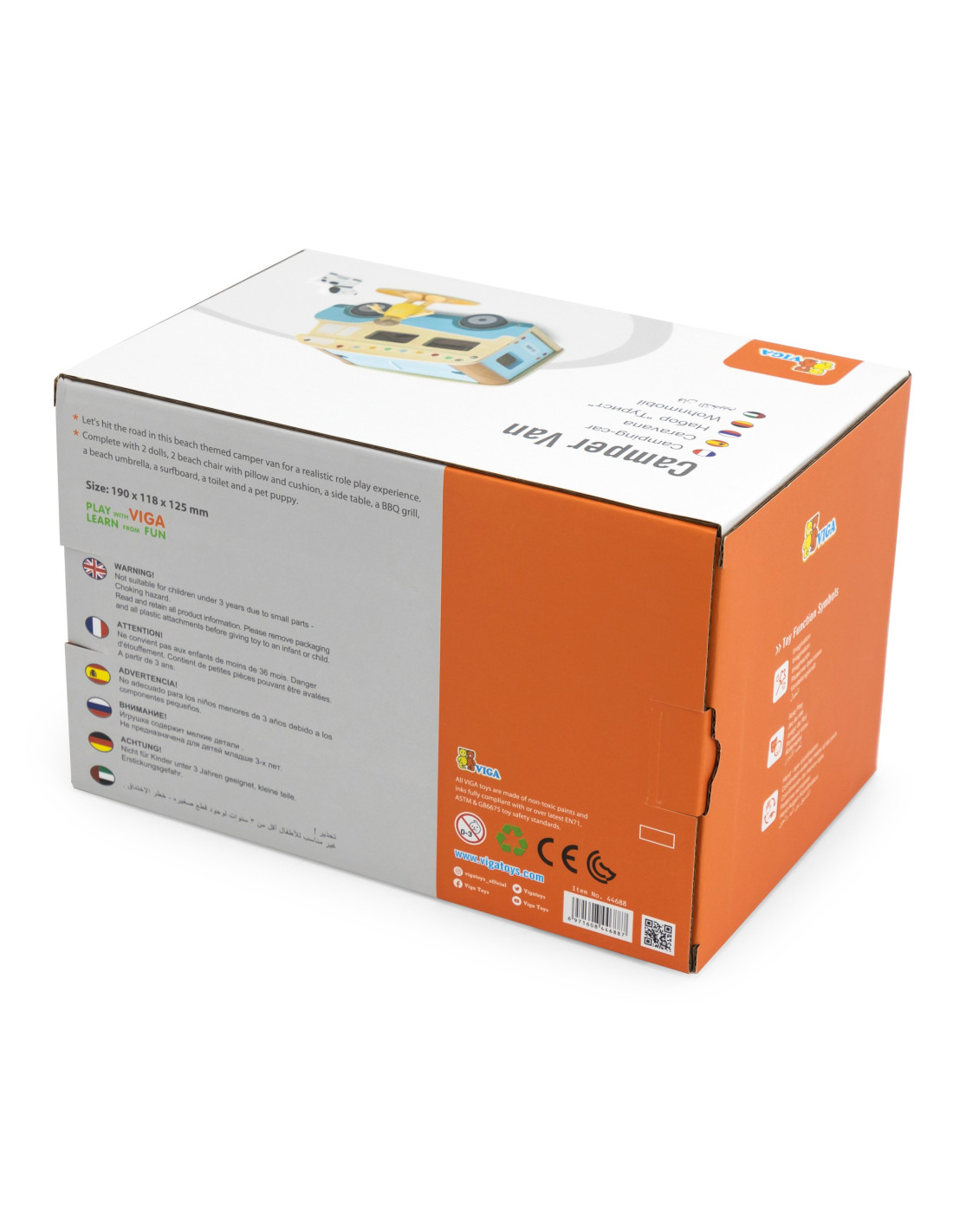 Let's hit the road with this beach camper from Viga . Complete with 2 figures, 2 loungers with soft cushions, a table, a grill, a beach umbrella, a surfboard, a toilet, and a dog. Equipped with sliding doors, a pop-up roof, a surfboard rack, and an easy-opening trunk.