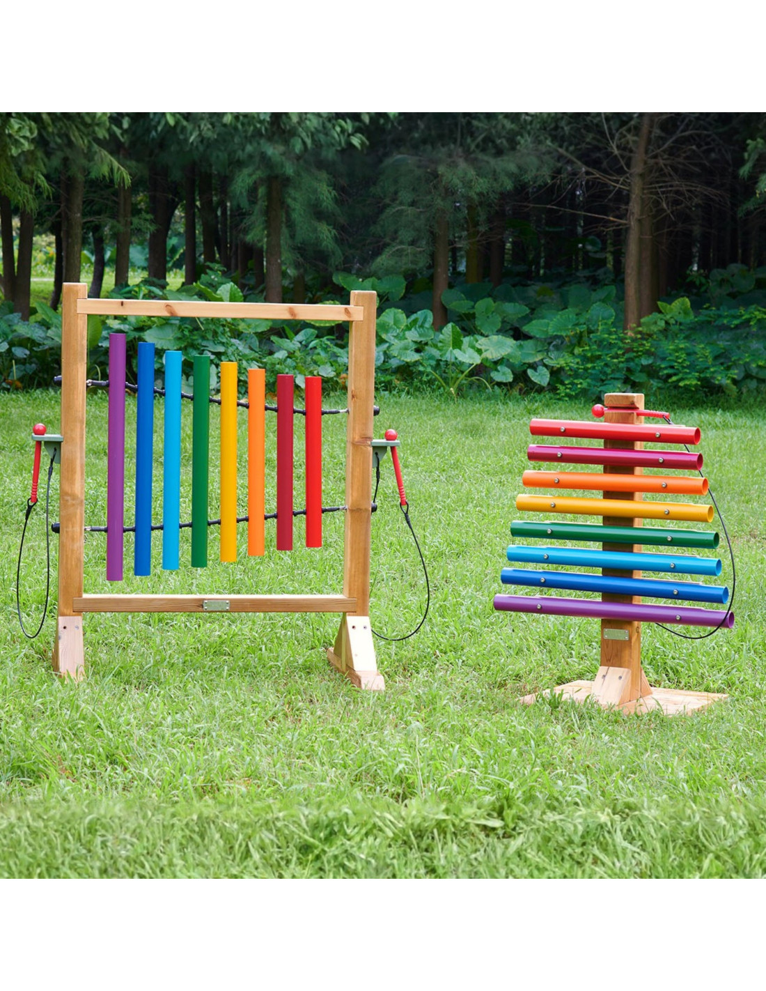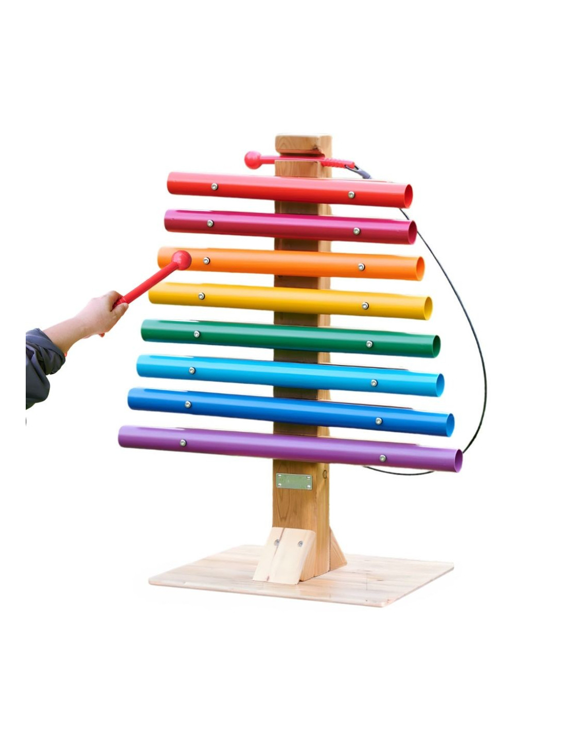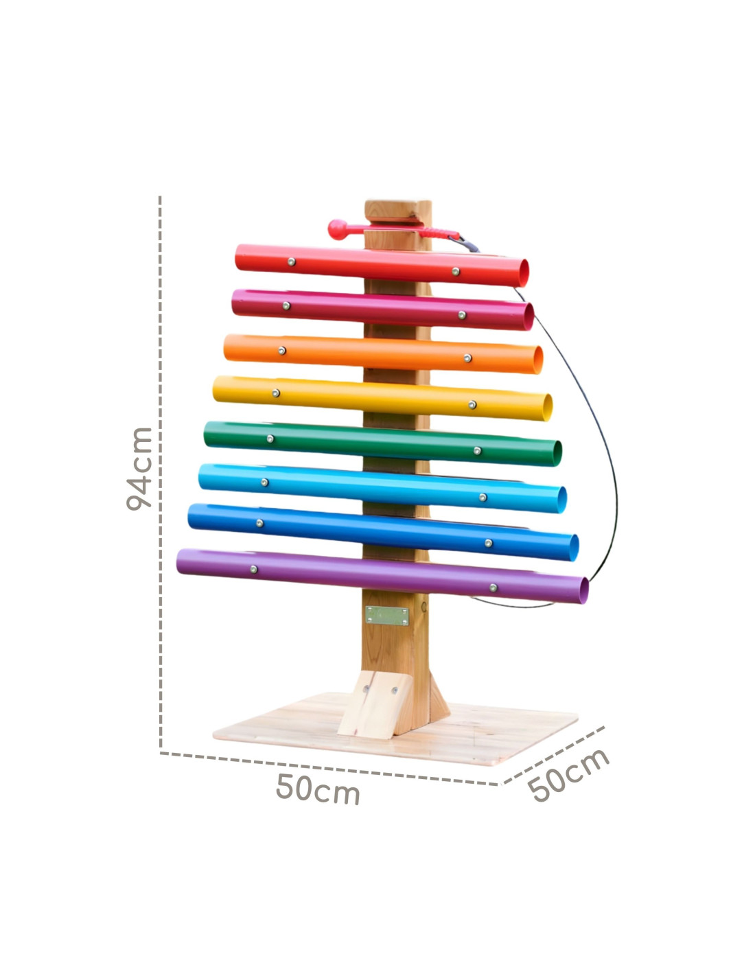 Discover the magic of sound in a grand format! The Rainbow Music Tower by Masterkidz is an impressive instrument that will become the heart of any garden, playground, or home music corner. Its sturdy natural pinewood structure proudly displays eight giant aluminum tubes in vibrant rainbow colors. This isn't just a toy—it's an introduction to the world of music, where every strike of the stick produces a pure, harmonious, and melodic sound. Thanks to its weather-resistant construction, young virtuosos can perform outdoors year-round, enjoying the joy of creating their own melodies and freely expressing themselves.