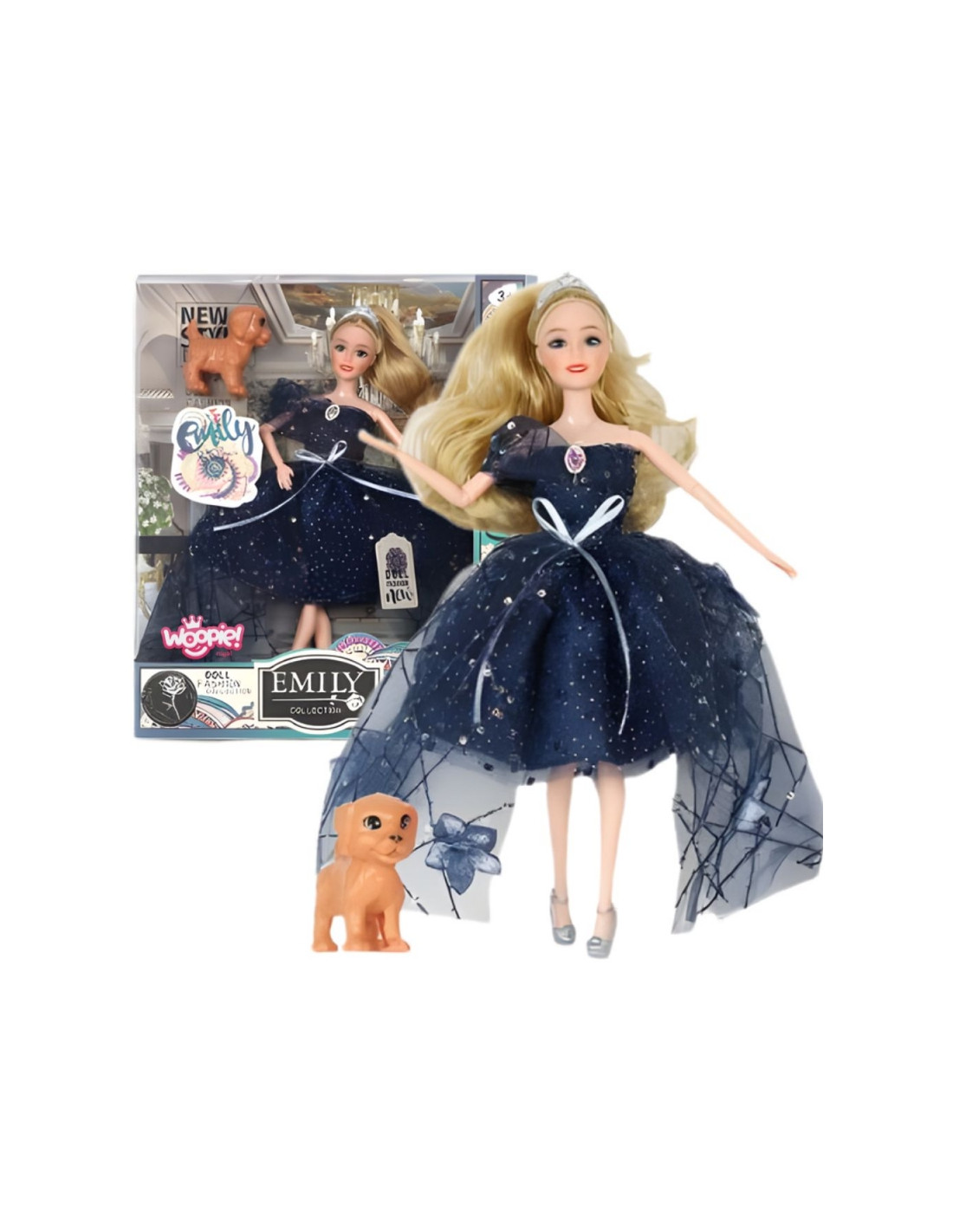 The Emi doll with a dog and an elegant dress from Woopie is a unique toy that will transport every child to a magical world of fashion and dreams. This beautiful doll with long, blonde hair and a crown, dressed in a shiny navy blue dress with a bow and tulle trim, will delight any little style enthusiast. The set also includes an adorable dog – a faithful playmate. The toy stands out for its high-quality craftsmanship, modern design, and numerous details that make playtime even more realistic and engaging. The Emilka doll set is not only a beautiful room decoration, but above all, a source of joy, creativity, and development for your child. Thanks to her, your little one can create their own stories, play out fashion shows, or have a party with their pet. It guarantees hours of carefree play full of smiles and imagination!