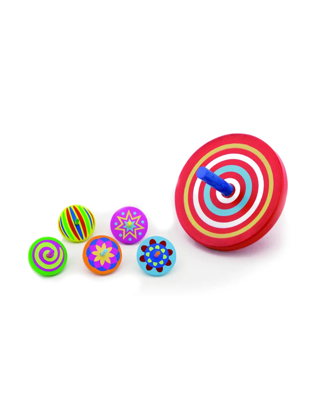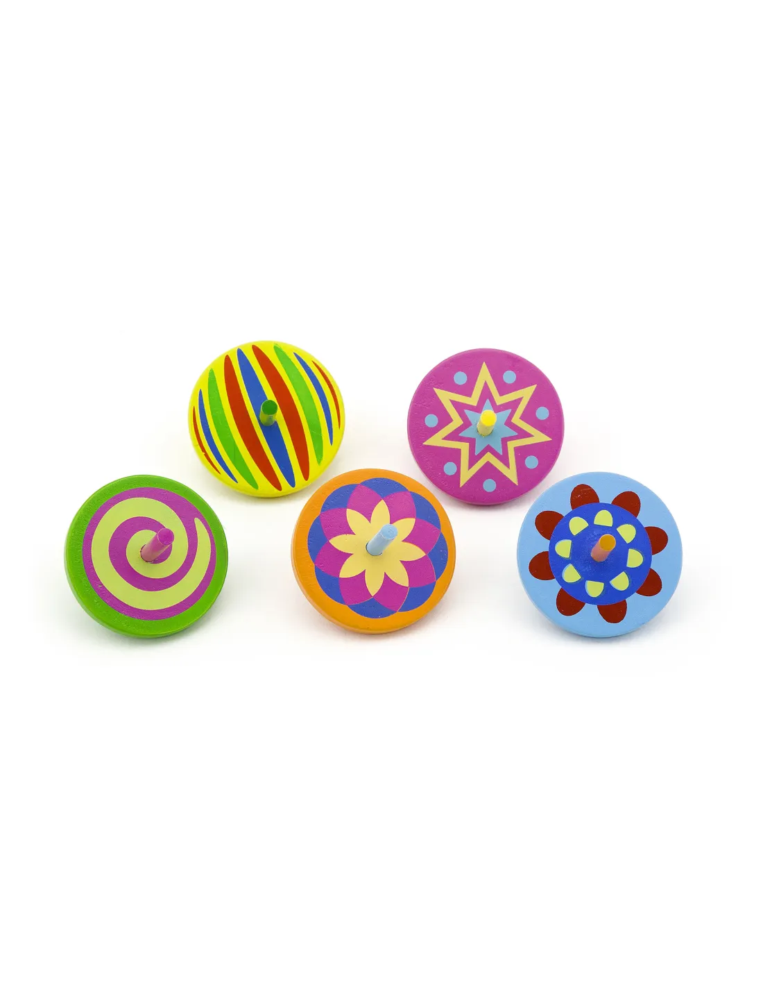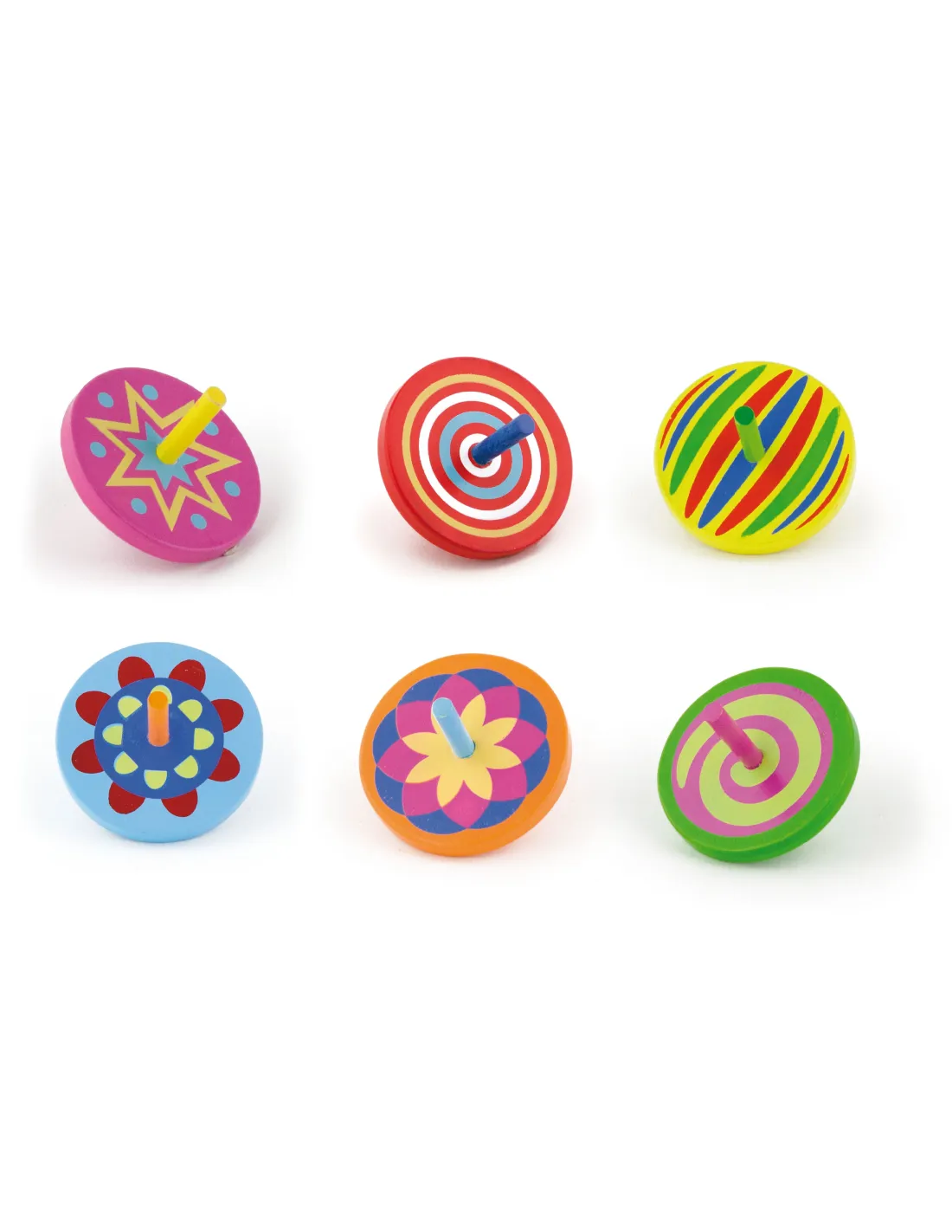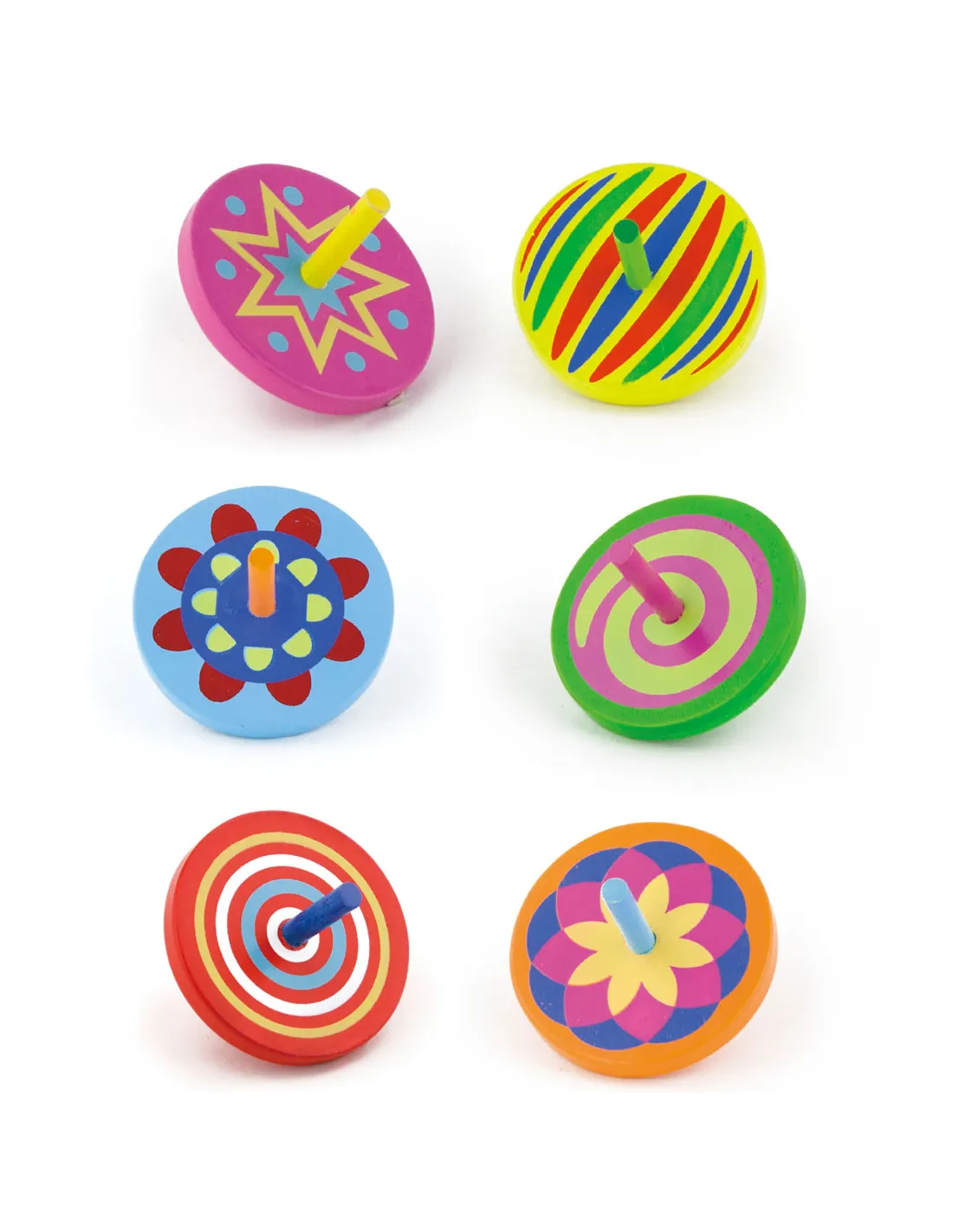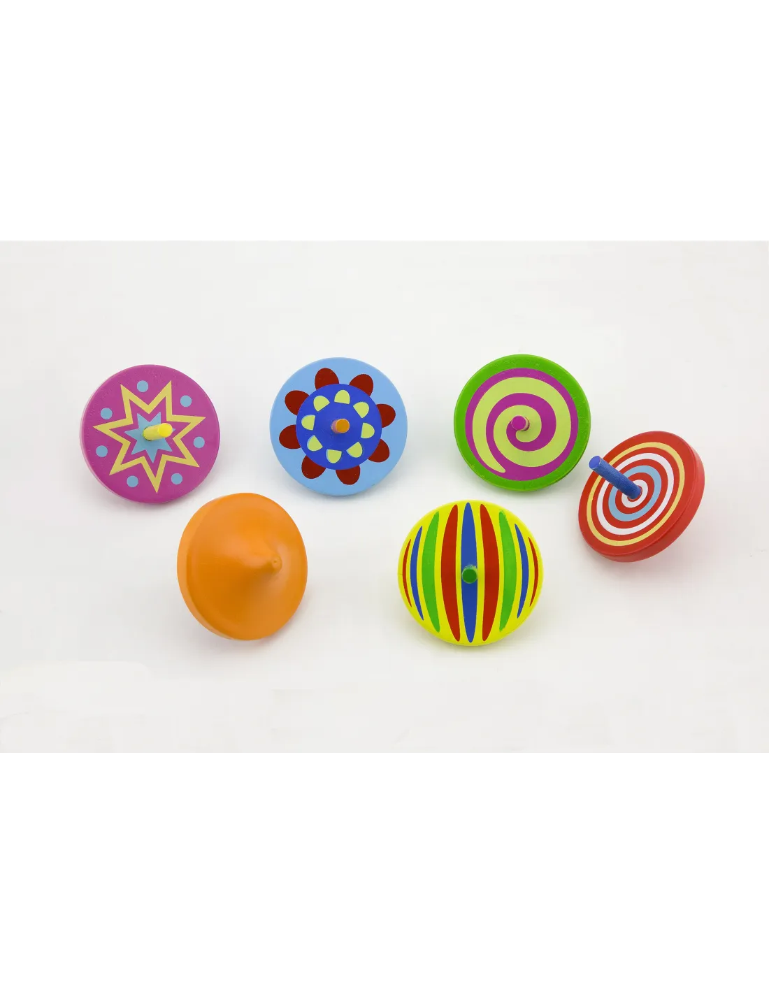 Colorful wooden spinning tops will delight children while they play. As they spin, they create interesting patterns that children will love.