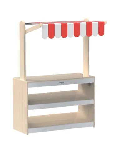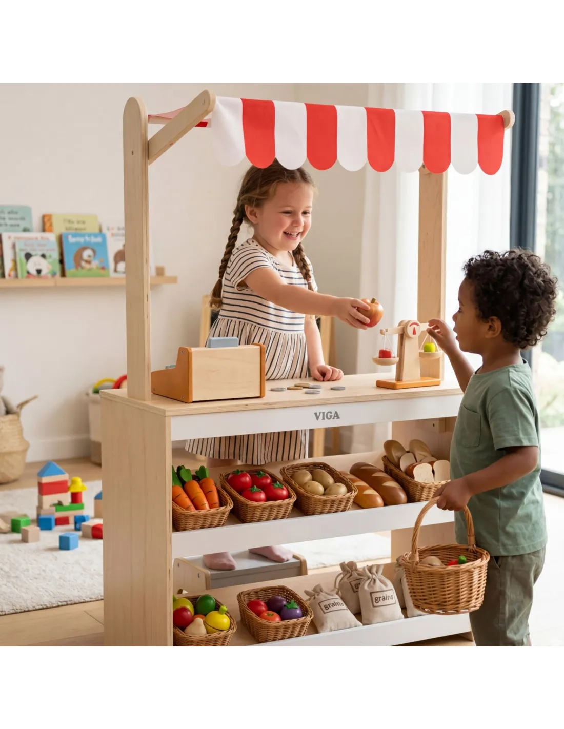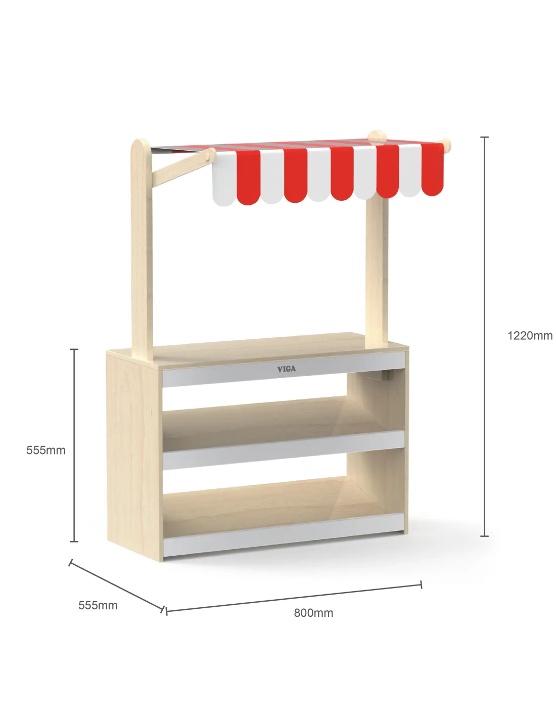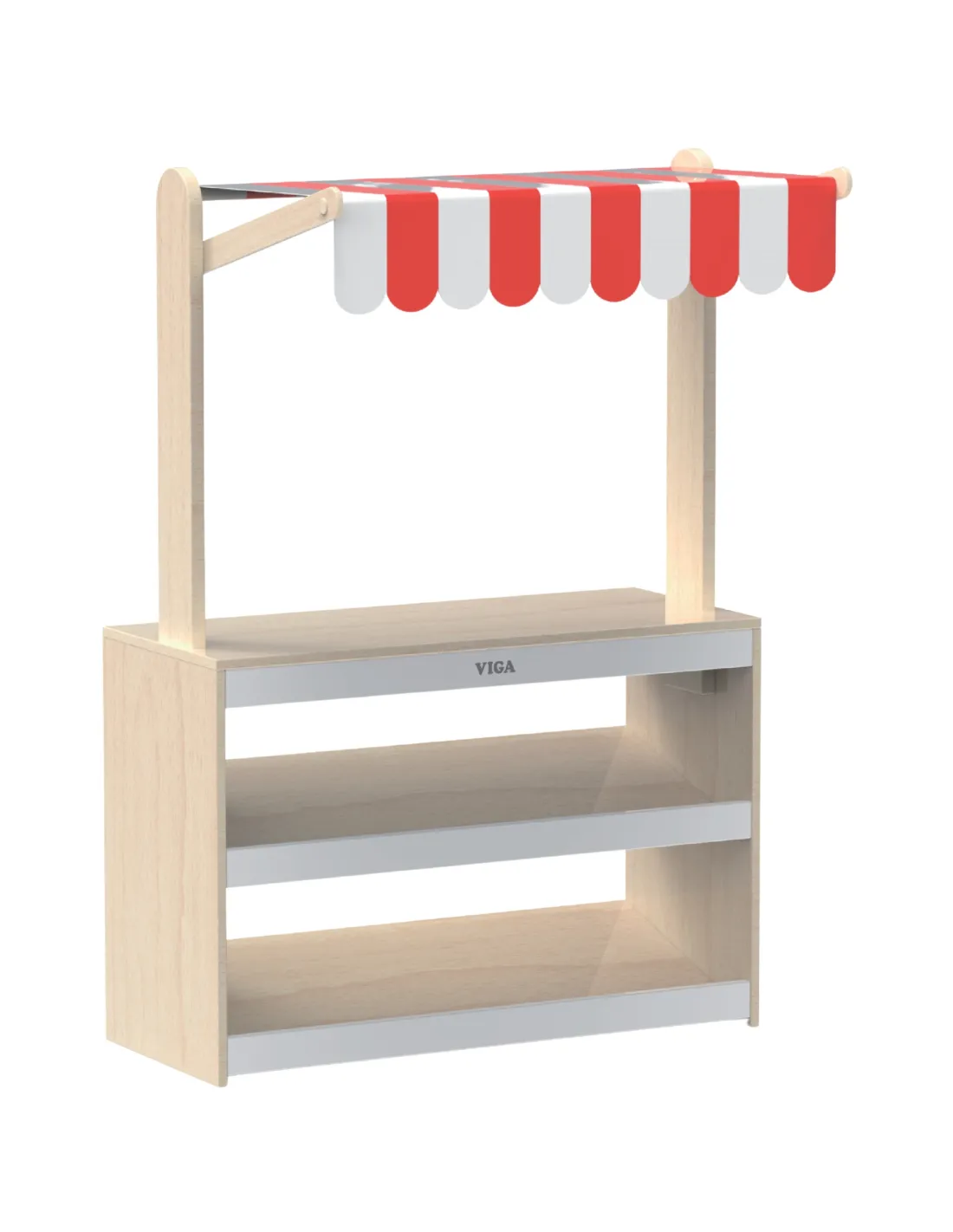 The Wooden Market Stand from VIGA takes role-playing to the next level. Crafted from solid wood and featuring a distinctive red and white striped roof , this market stand is sure to captivate children and become a favorite play area. It features two shelves for displaying products that children can "sell" while playing shop. This beautifully crafted wooden market stand supports creative role-play and allows children to develop social skills through play.