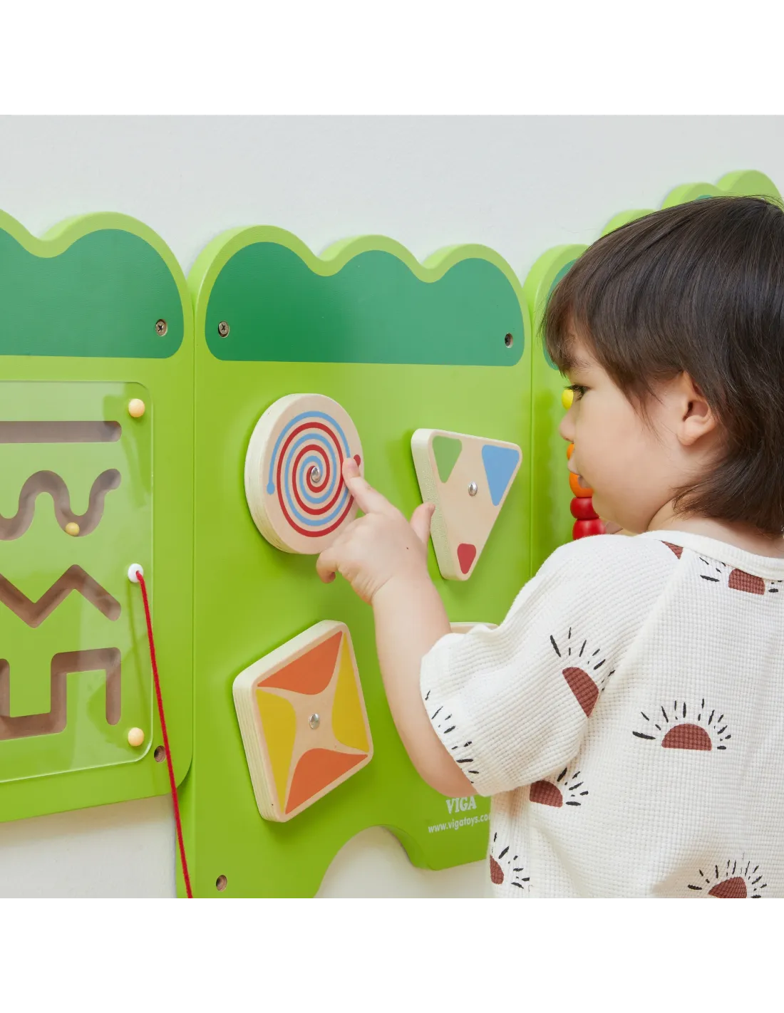 The VIGA Crocodile Educational Wall Panel is a 5-in-1 toy that combines learning, creativity , and joyful play . Each panel offers a different activity— music, mazes, sorters, and gears —that stimulate the senses and imagination . Perfect for a preschool, nursery, or children's room, the panel saves space by mounting on the wall. Made of durable wood and painted with non-toxic paints , it guarantees safety and longevity. This colorful crocodile will become a favorite companion for everyday play and learning.