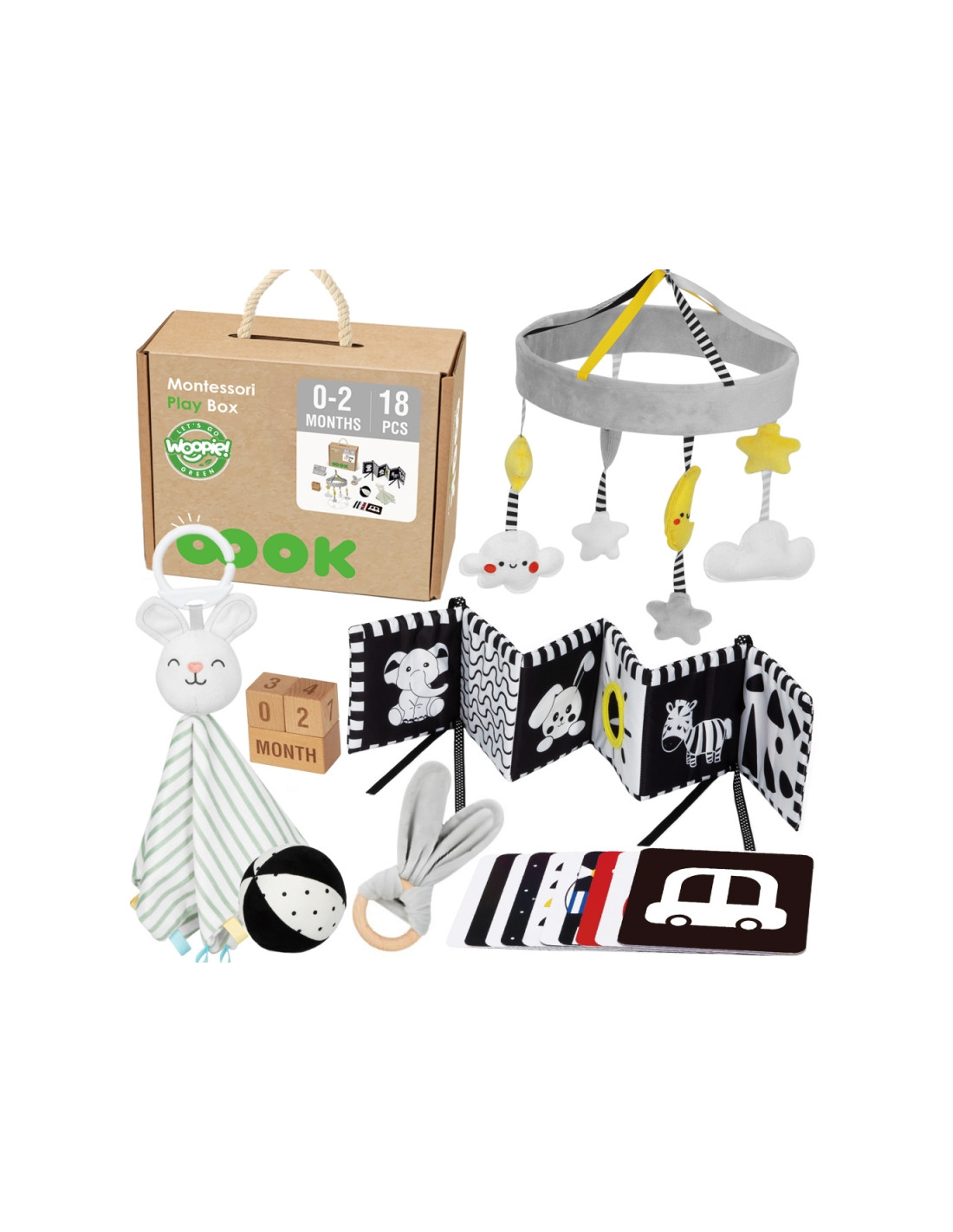 Discover the unique Educational Box from WOOPIE GREEN!, created for the youngest babies aged 0-2 months . This set of 6 carefully selected sensory and educational toys supports your child's development from the first days of life. Each item is designed in the spirit of the Montessori method to stimulate the senses of sight, touch, and hearing, while developing logical thinking and hand-eye coordination. The box also includes a parenting guide, which will show you when and how to introduce each toy. It's the perfect gift for newborns and new mothers, combining learning, fun, and development in one!