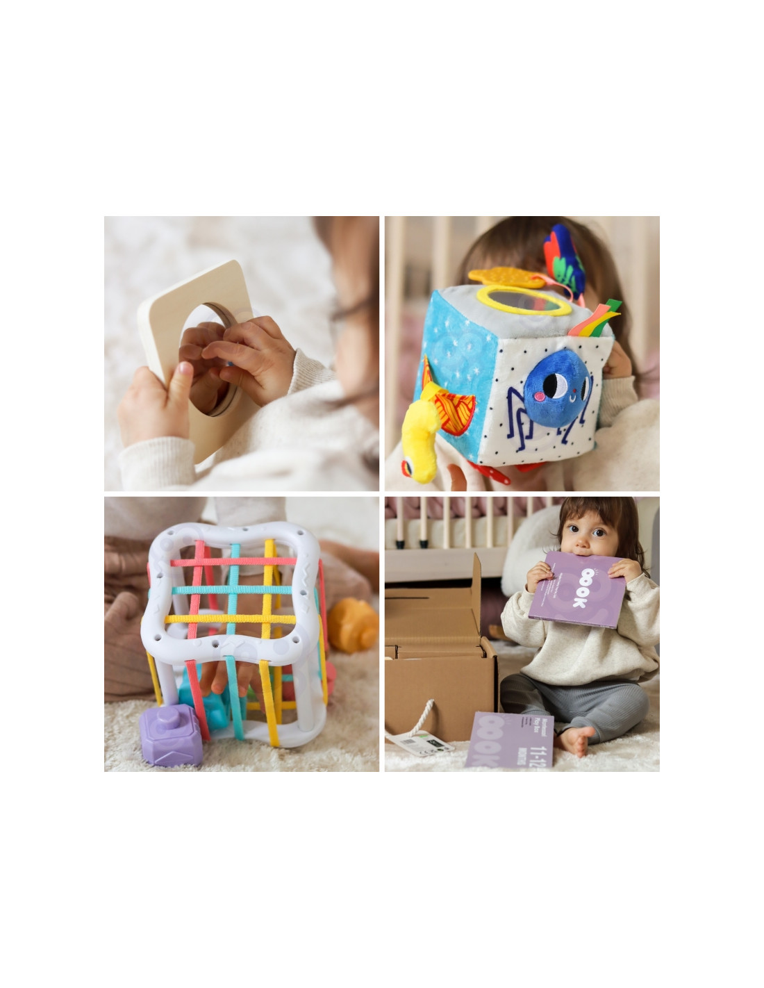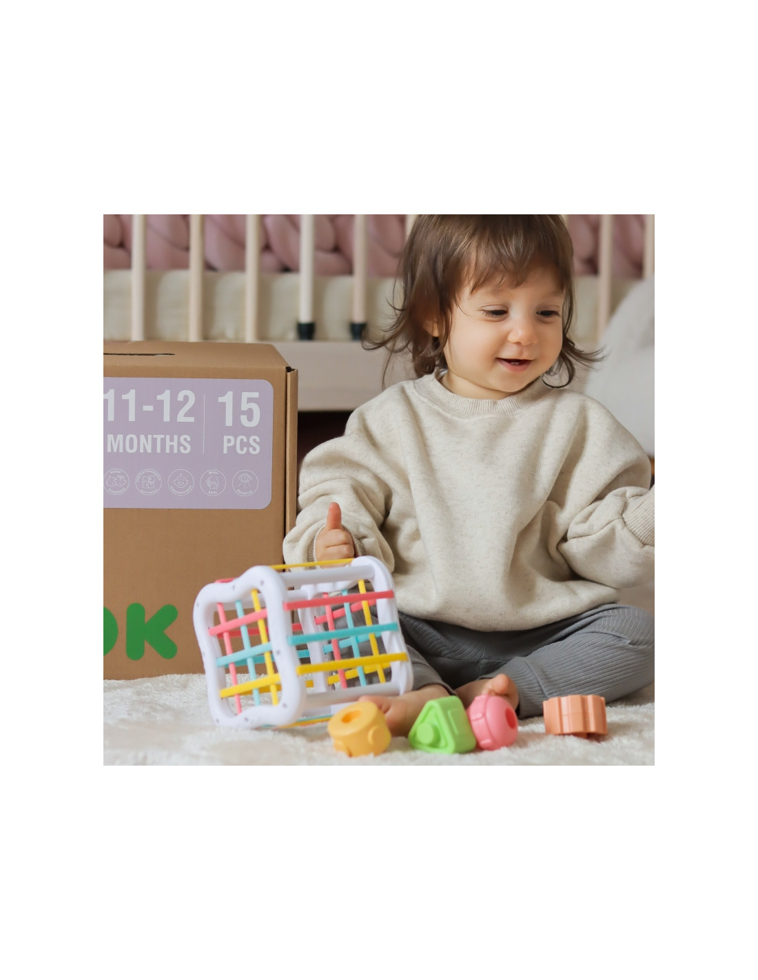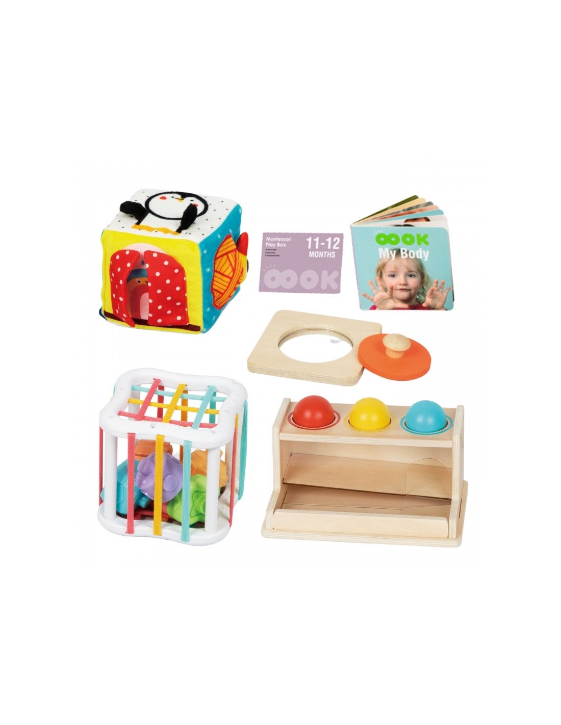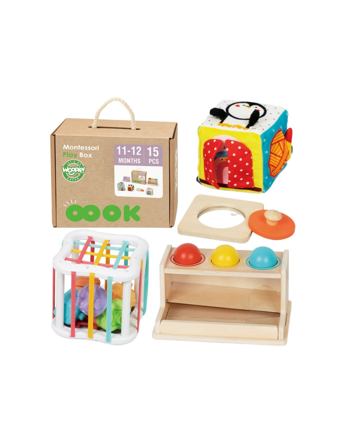 Discover the extraordinary Educational Box from WOOPIE GREEN , designed for babies aged 11-12 months who discover the world every day! Inside, you'll find five unique Montessori sensory and educational toys that support healthy psychomotor development, logical thinking, and hand-eye coordination. Each toy is designed to stimulate a child's senses— sight , touch , and hearing —and develop cognitive skills in a natural, enjoyable way. The set also includes a parenting guide that will show you how to best use each toy in everyday play and learning. It's the perfect gift for a one-year-old who combines joy, learning, and development!