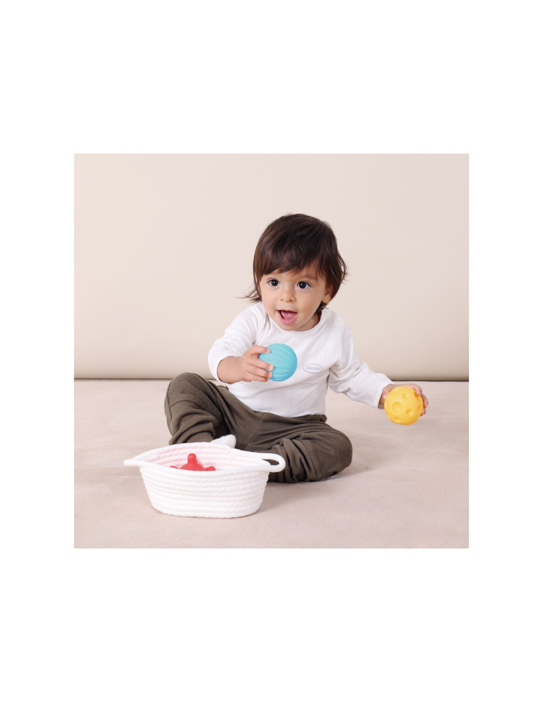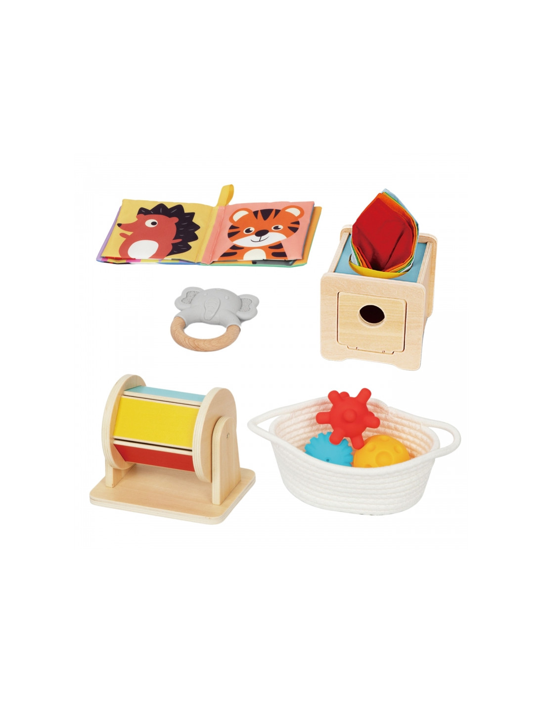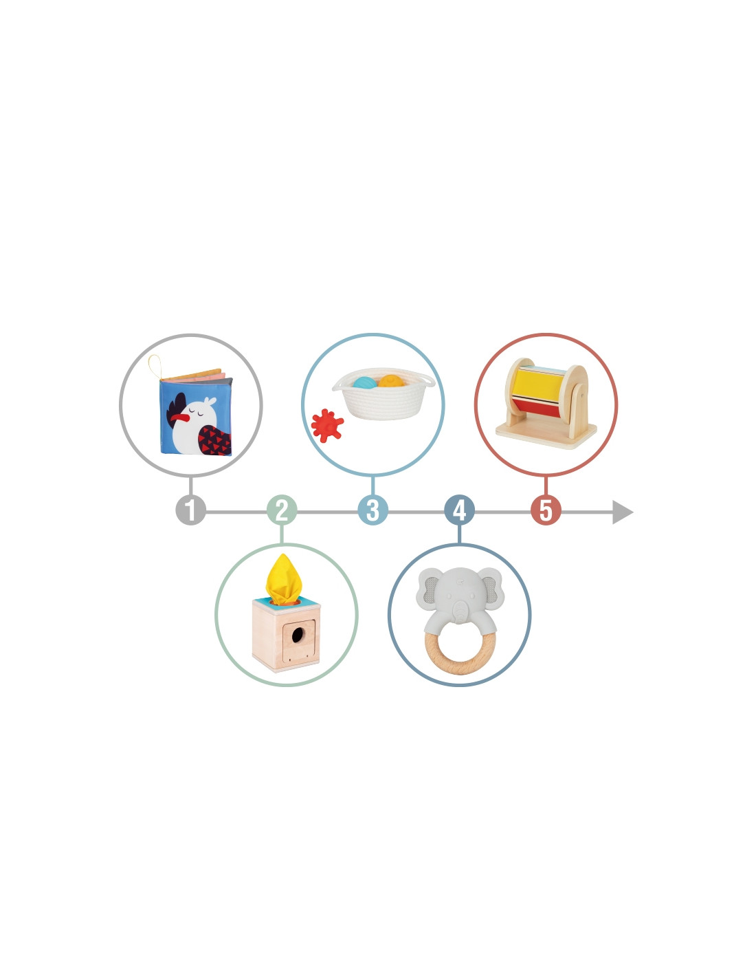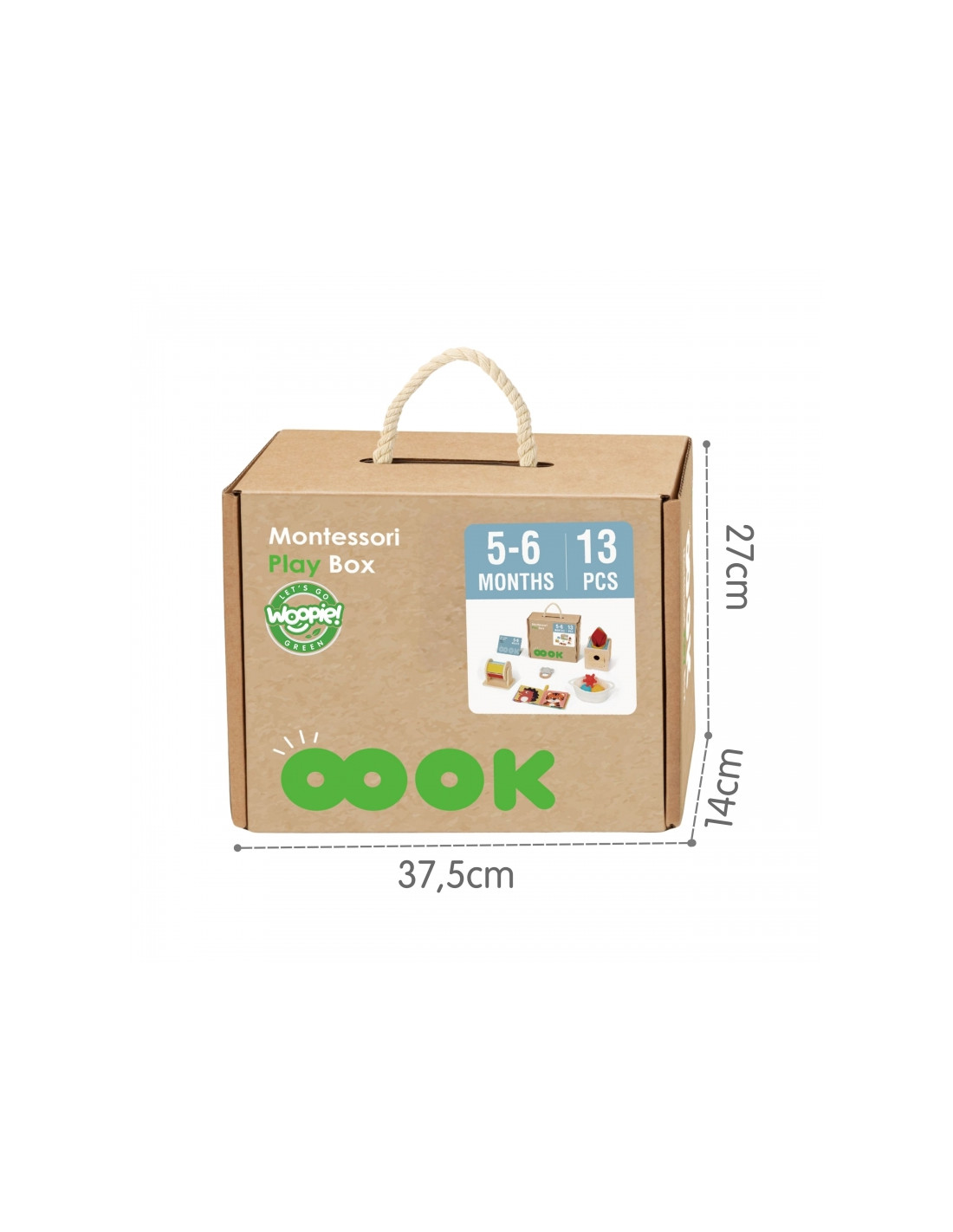 The Woopie Learning Box is a comprehensive set designed to support your little one's healthy psychomotor development . It's perfect for babies aged 5-6 months , containing five Montessori- inspired sensory and learning toys . The toys stimulate key senses: sight, touch, and hearing , while also supporting hand-eye coordination and logical thinking. A detailed parenting guide is included, suggesting when and how to introduce each toy, making this box a perfect gift for a baby.