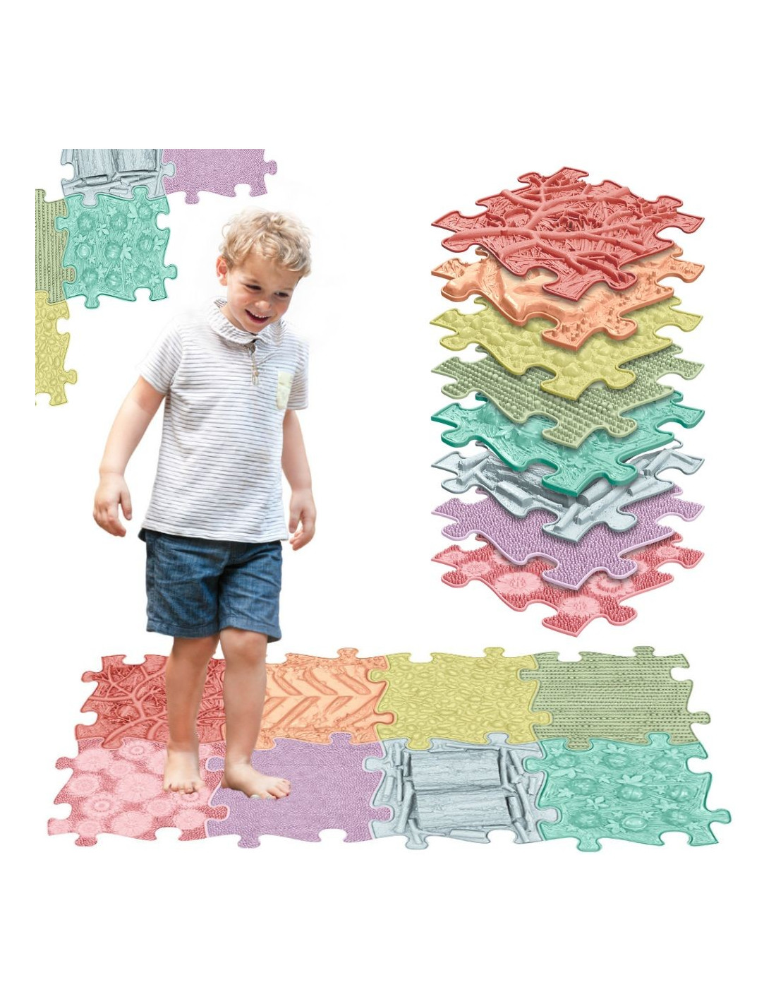 This set of sensory mats fromWoopie is the perfect combination of movement , play , and everyday experiential learning . The varied textures stimulate children's feet, encouraging barefoot walking and active play. Pastel colors create a friendly space for exercise at home and at preschool. Each element is designed with healthy development and proper posture in mind. This is a product that children will love, and adults will appreciate for its real developmental support.