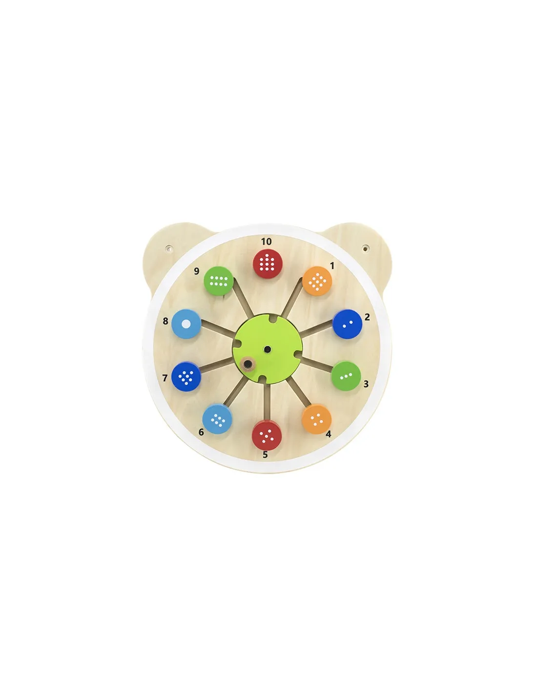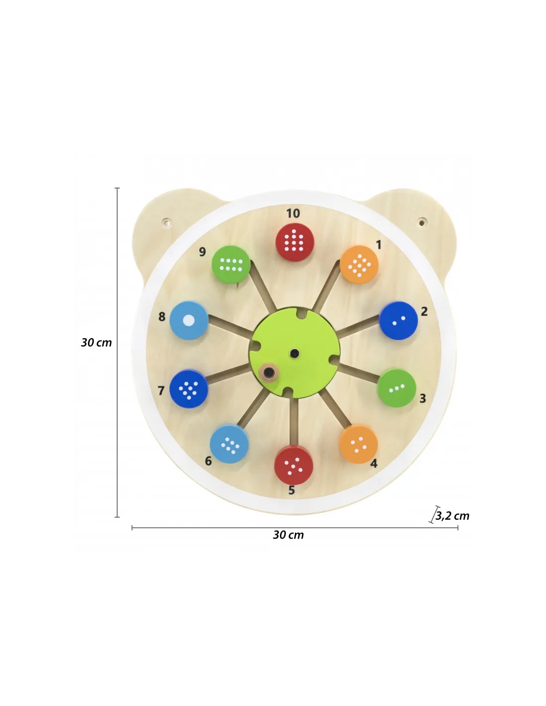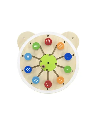 Viena iš medinių lentelių su žavinga meškiuko galva serijos. Lentoje yra apvalūs kaladėlės su atitinkamu taškų skaičiumi, kuriuos reikia suderinti su atitinkamu skaičiumi lentoje. Šis žaislas padeda lavinti vaikų loginį mąstymą ir mokosi spalvų bei skaičių. Šis gaminys puikiai tinka tiek naudoti namuose, tiek ikimokyklinio ugdymo įstaigose. Įdomus lentos dizainas tikrai pritrauks kiekvieno vaiko dėmesį. Visa lenta pagaminta iš lakuotos medienos ir dažyta netoksiškais ryškių spalvų dažais, kurie pradžiugins kiekvieną vartotoją ir suteiks daug linksmybių. Šis gaminys tinka vaikams nuo 18 mėnesių amžiaus . Galima įsigyti visą mūsų meškiuko galvų lentelių seriją.