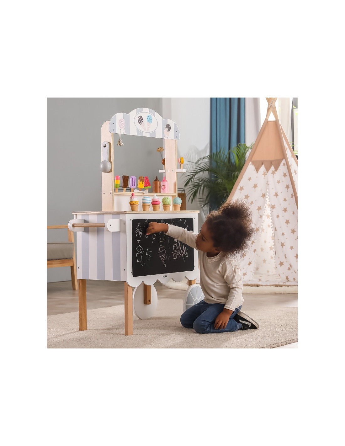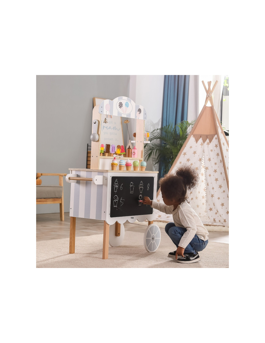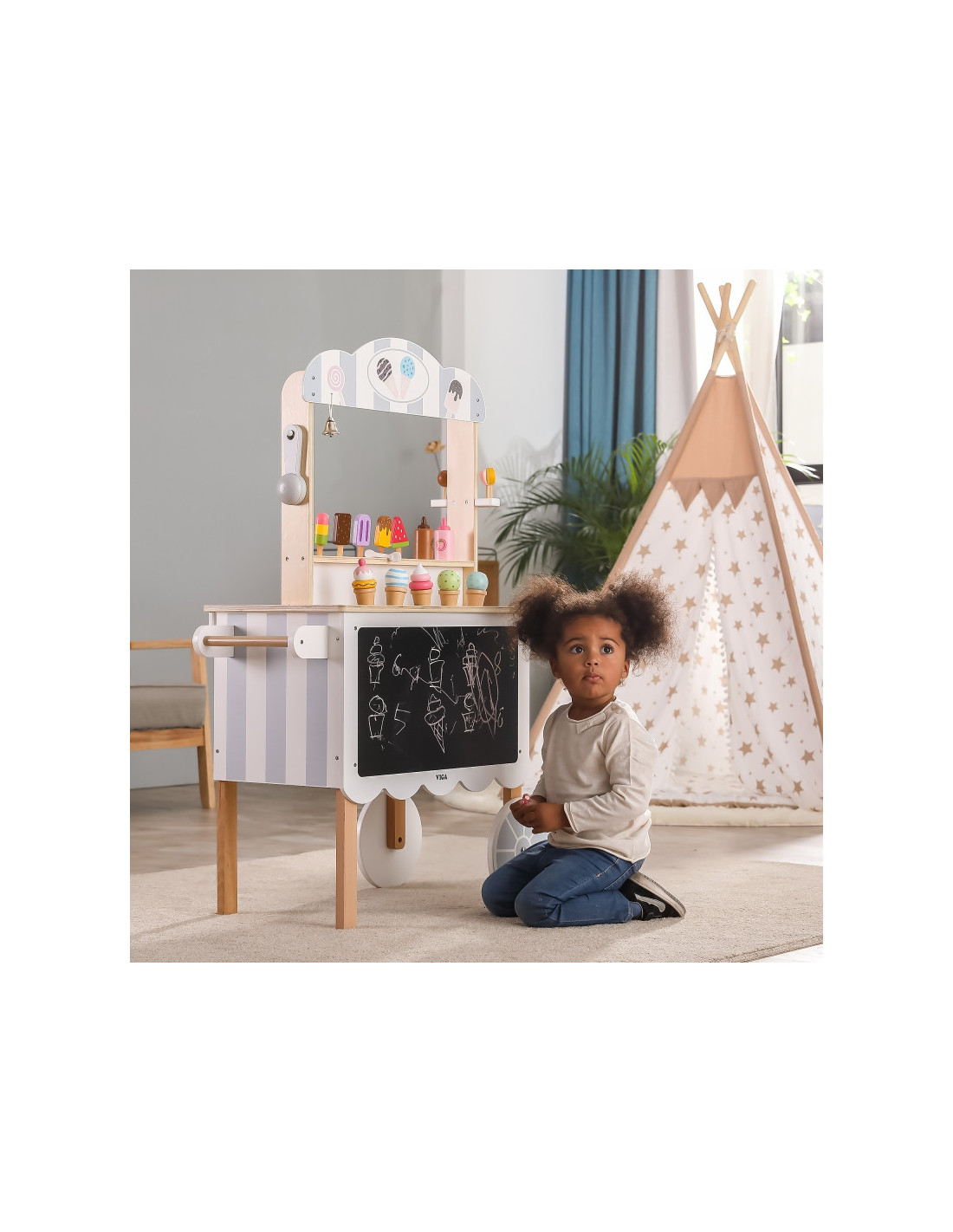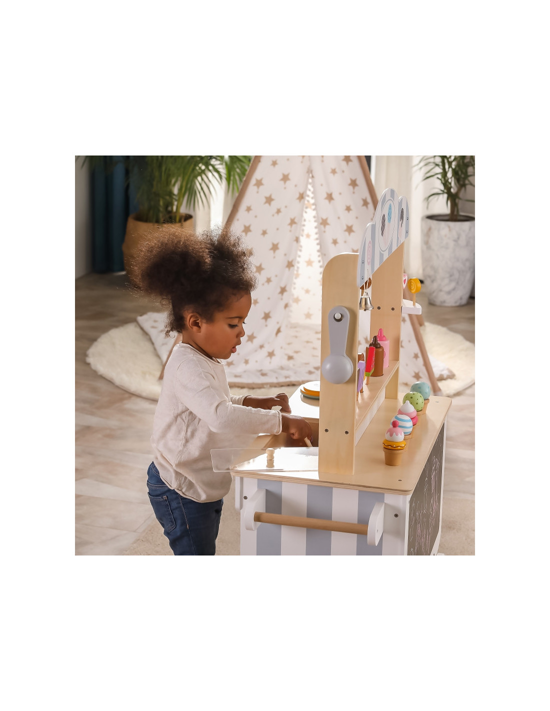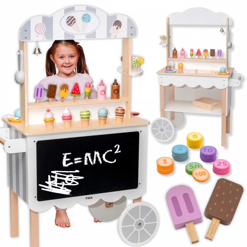 3 viename – parduotuvė, konditerijos parduotuvė ir ledainė – puiki dovana mažiesiems konditeriams. Rinkinys puikiai tinka vaikui, norinčiam tapti pardavėju ar konditerio darbu. Šis žaislas leis jūsų vaikui pasijusti profesionaliu saldumynų pardavėju. Žaisle yra daug mažesnių priedų, tokių kaip ledinukai ant pagaliuko, ledai, vafliai ir pagardai. Be to, parduotuvėje yra kreidinė lenta, ant kurios vaikai gali piešti ar rašyti kainas arba šiandienos meniu. Parduotuvėje taip pat yra lentyna įvairiems daiktams laikyti. Visas rinkinys nudažytas netoksiškais, švelnių spalvų dažais, kurie patraukia vaikų dėmesį.