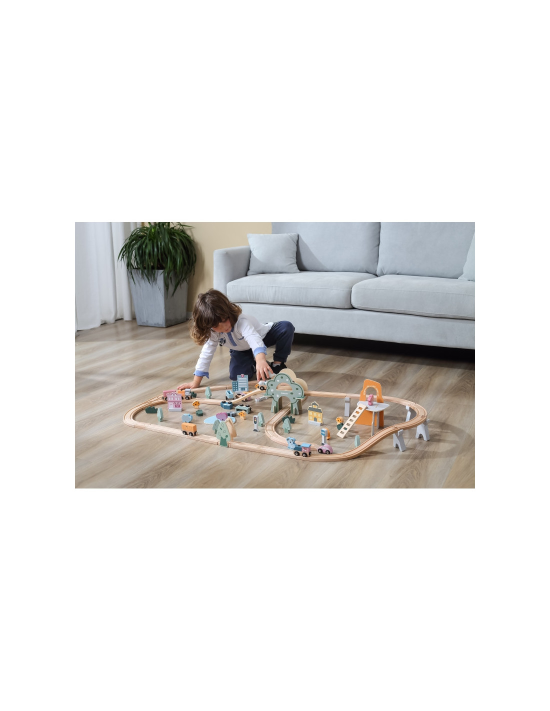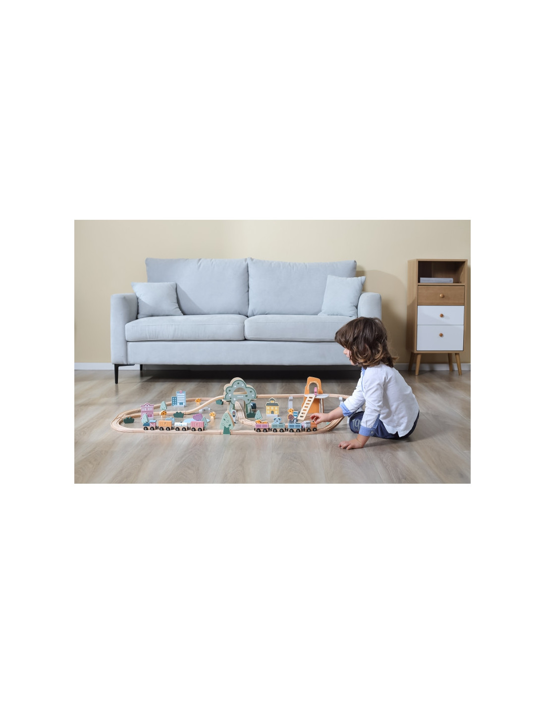 - - rinkinį sudaro 90 elementų, m.in. bėgius, bėgių pakraščius, traukinį ir įvairius vagonus, geležinkelio ženklus, pastatus, gyvūnus, transporto priemones ir įvairių rūšių medžius bei akmenis,