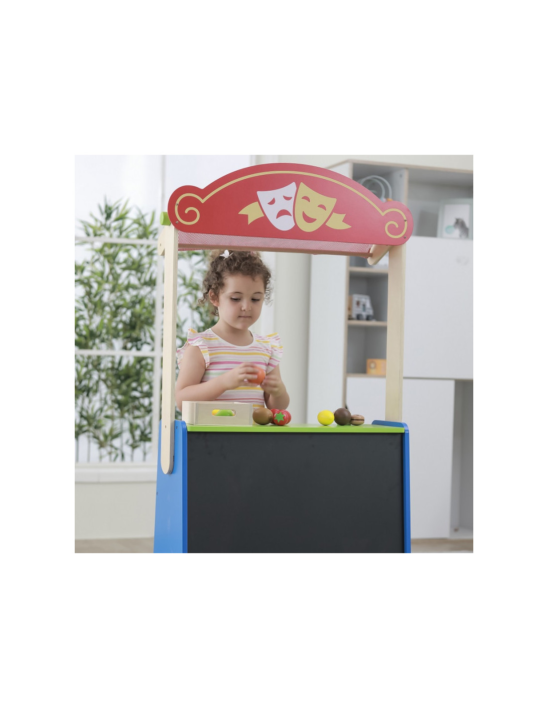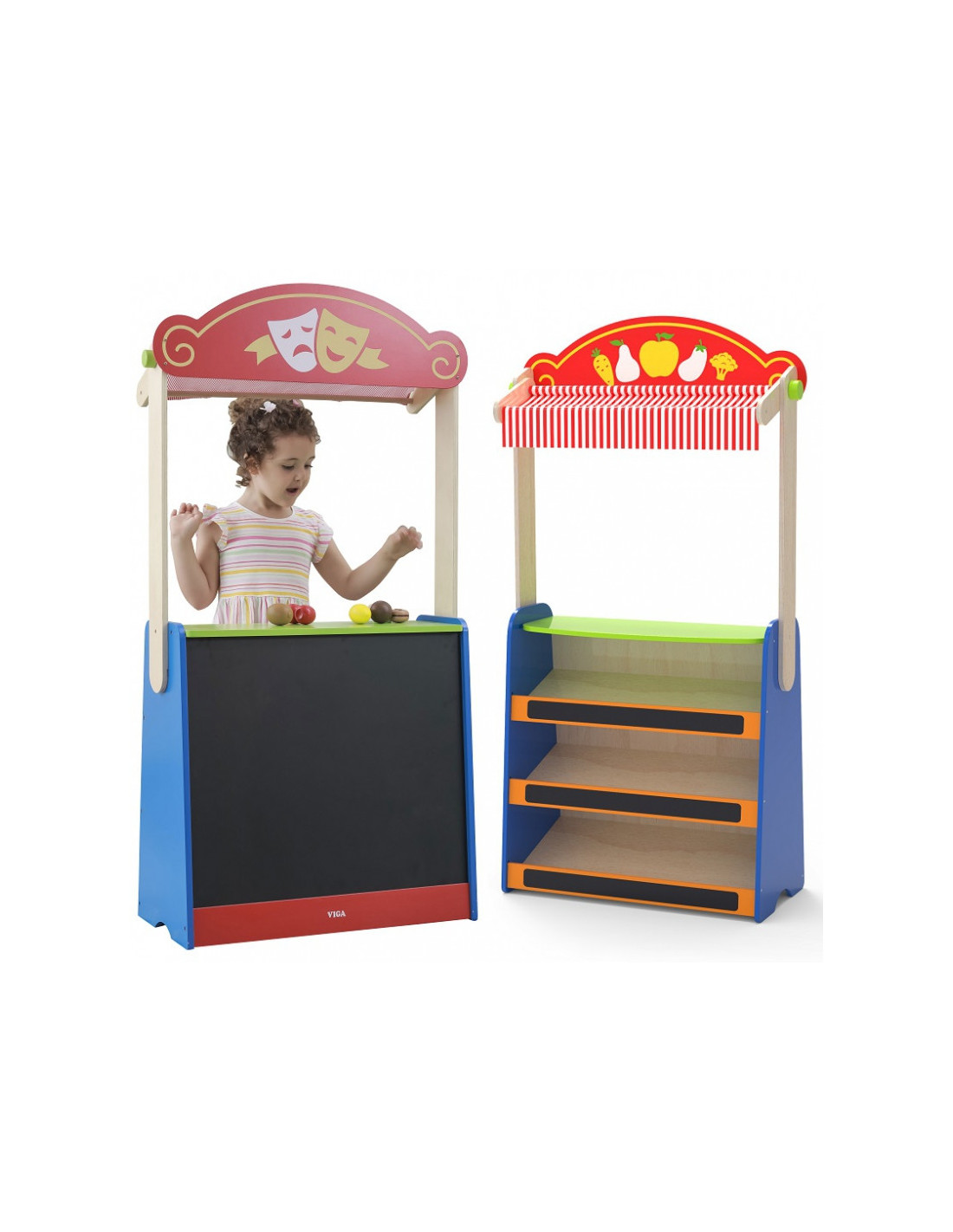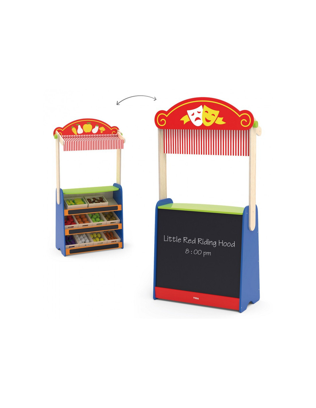 Šis aukštos kokybės „Viga Toys“ žaislas – tai teatro ir maisto prekių parduotuvės derinys . Tiesiog apverskite žaislą ir galėsite imtis visiškai naujų vaidmenų.