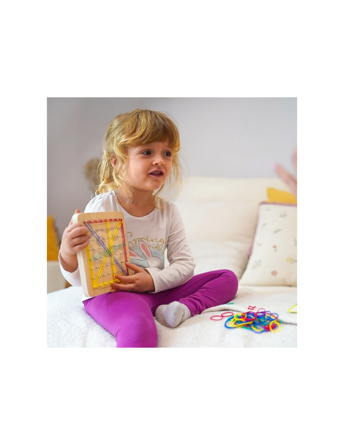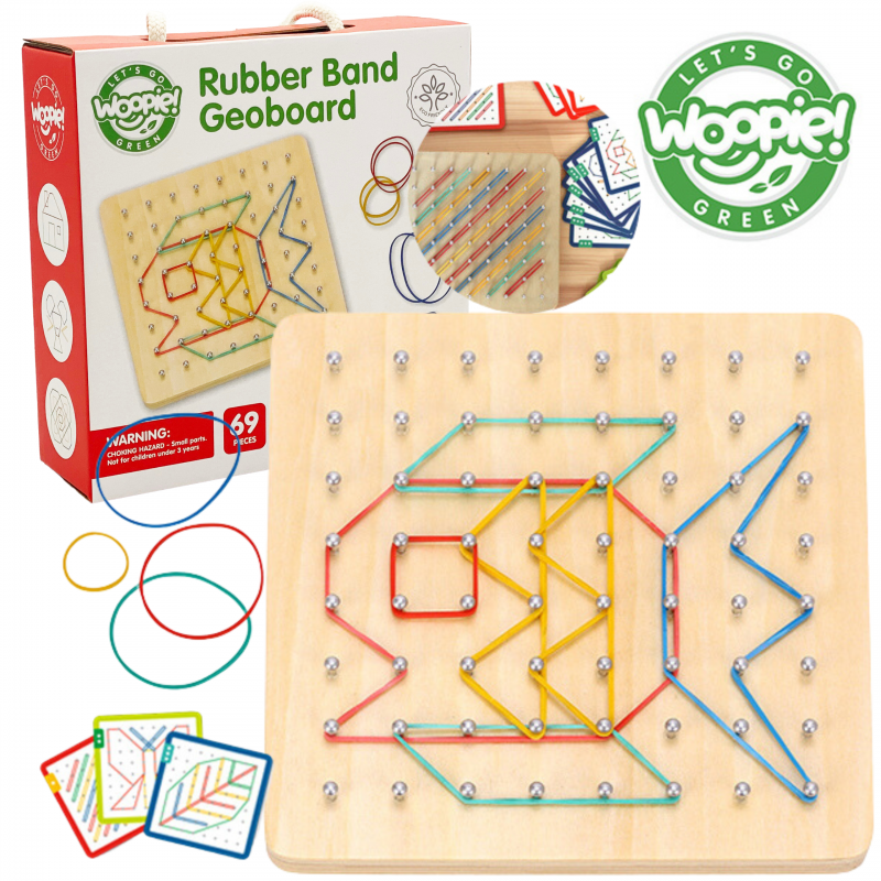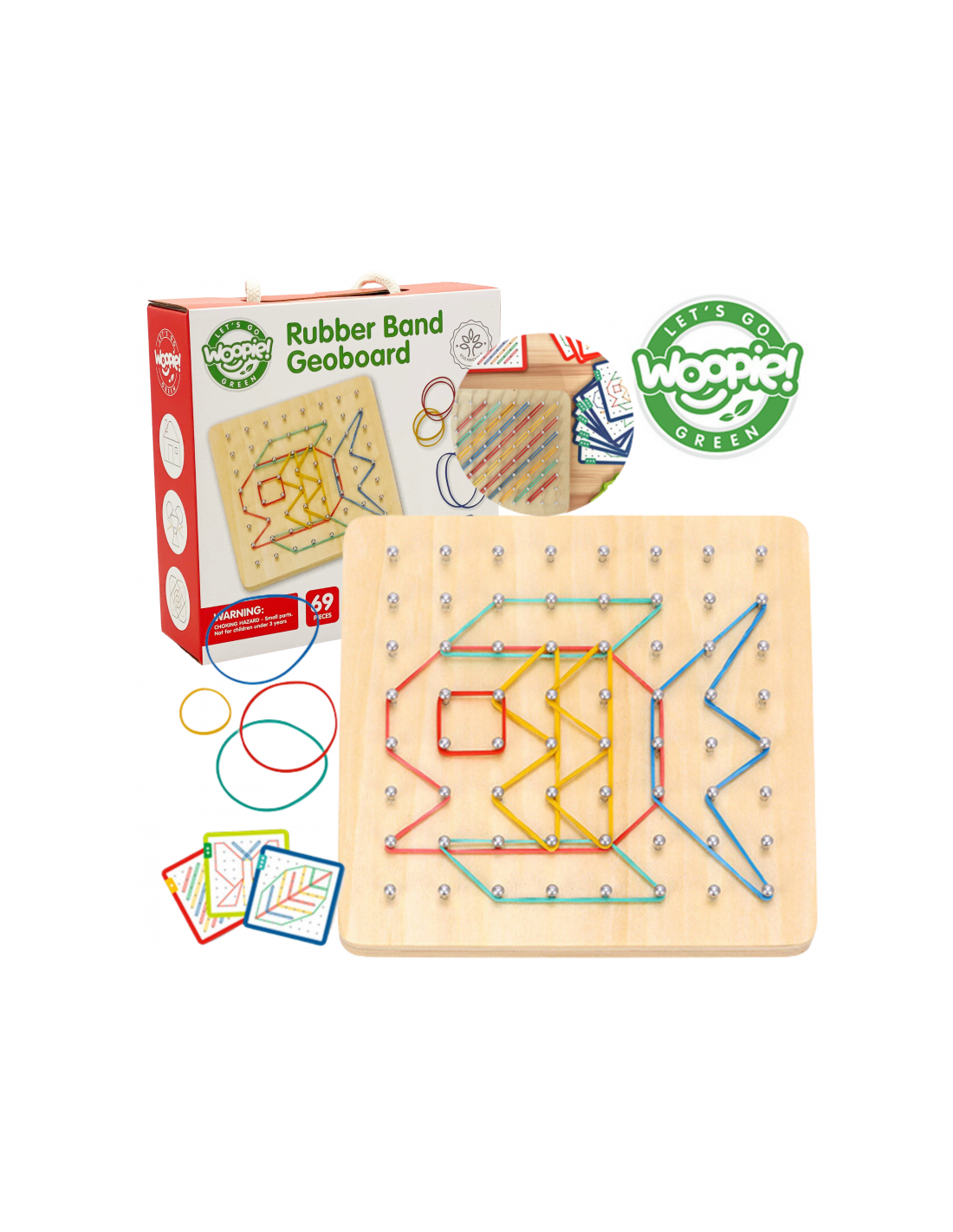 „WOOPIE“ medinis „GeoPlan“ dėlionė , priklausanti ekologiškai GREEN serijai, yra unikalus lavinamasis žaislas, derinantis mokymąsi su kūrybišku žaidimu! Ji padeda vaikams lavinti rankų įgūdžius , susikaupimą ir loginį mąstymą, kuriant įvairias formas ir raštus spalvingomis gumytėmis ant specialios lentos su kaiščiais. Taip pat galite įtraukti atminties žaidimo elementą arba leisti savo mažyliui kurti savo unikalias kompozicijas. Tai smagus žaidimas, kuris nenuobodžiaus ir ilgam užims dėmesį!