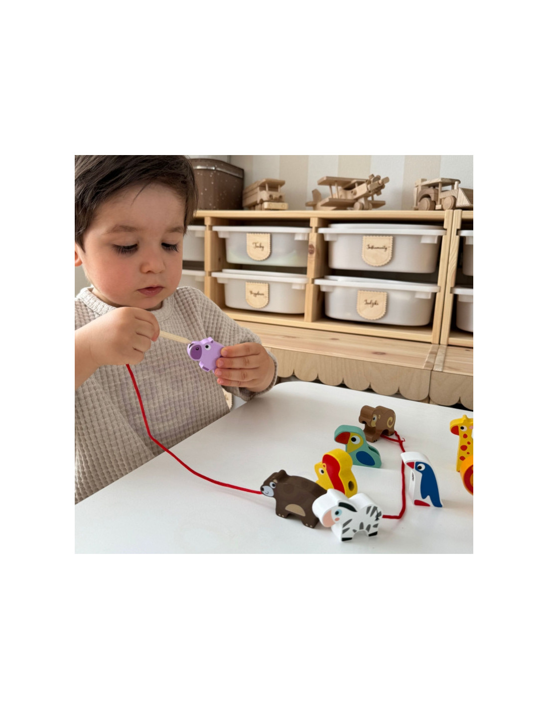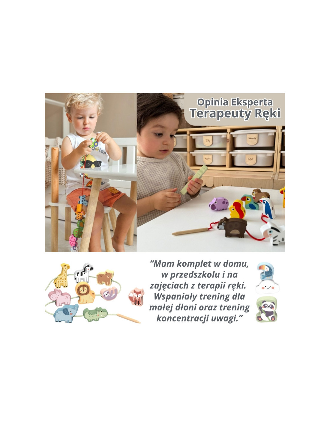- - Rinkinį sudaro: 12 medinių karoliukų su safario motyvais (pvz., liūtas, žirafa, beždžionė) + virvelė