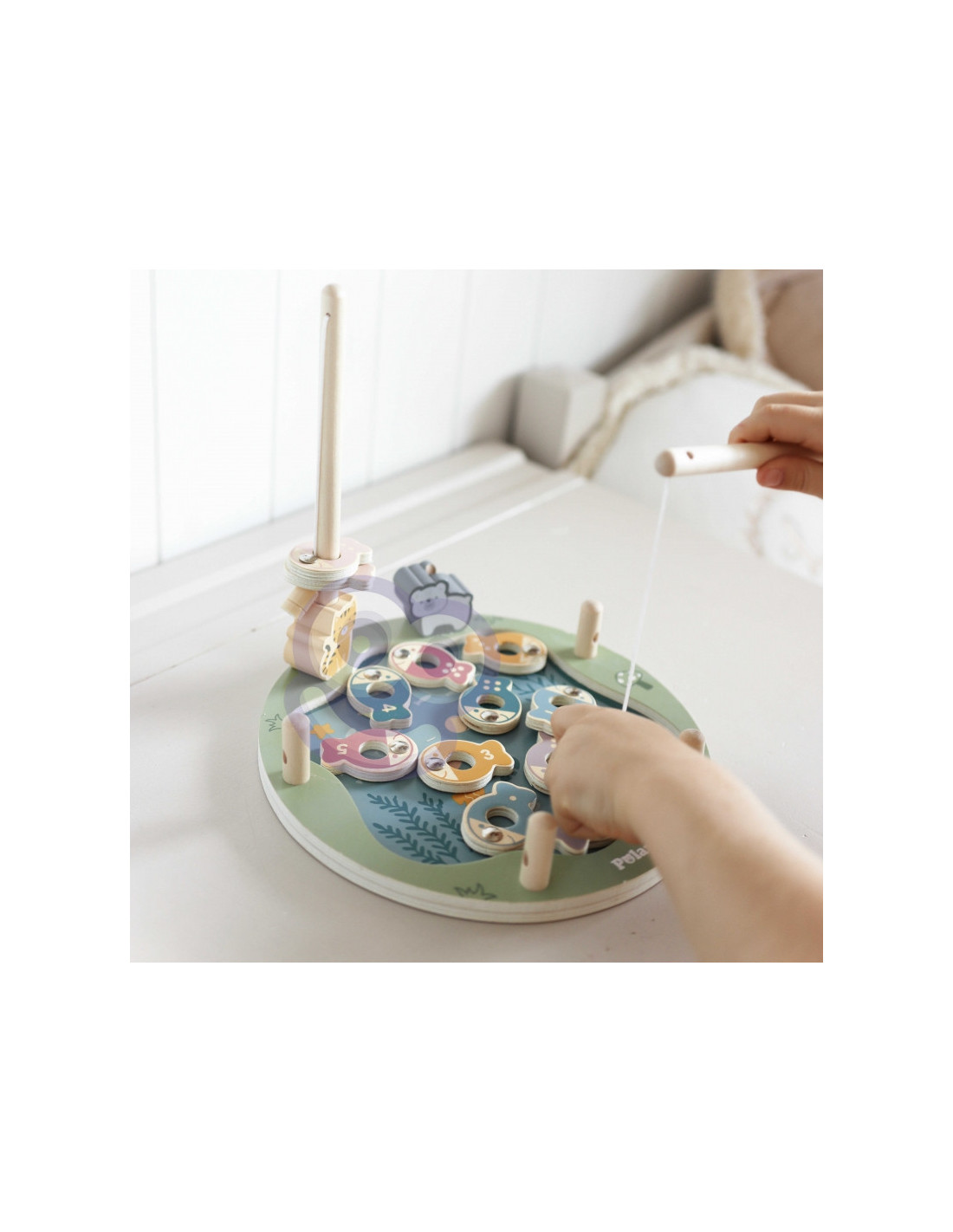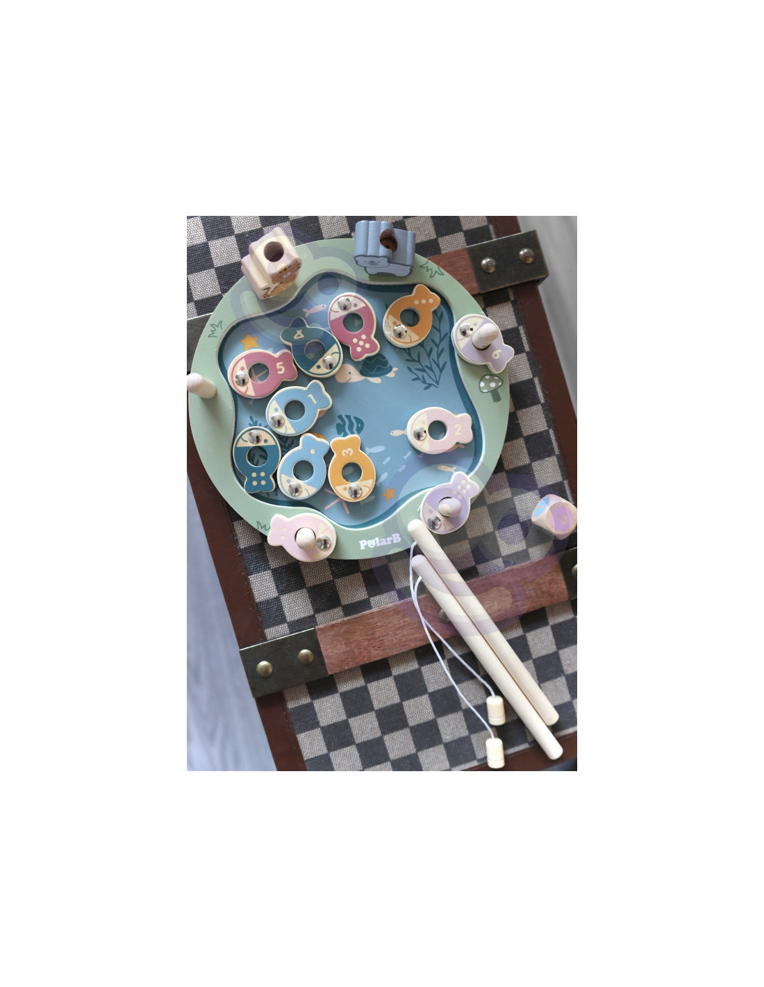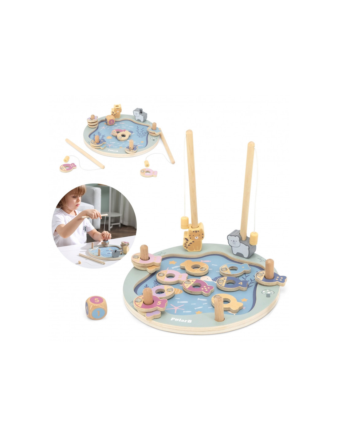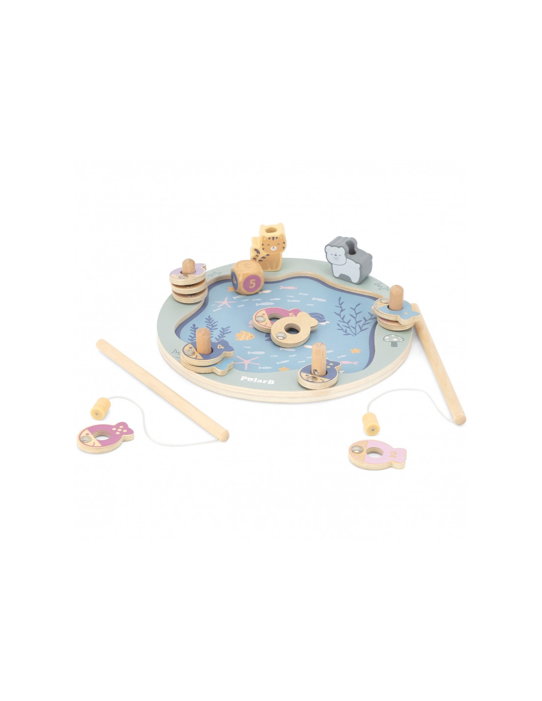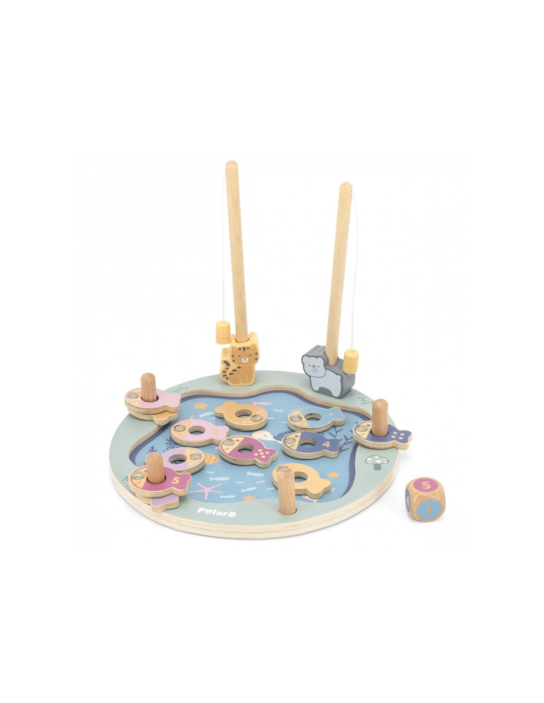 - - žaislą sudaro: medinis žaidimo stovas, 2 meškerės, kauliukas ir 12 žuvų,