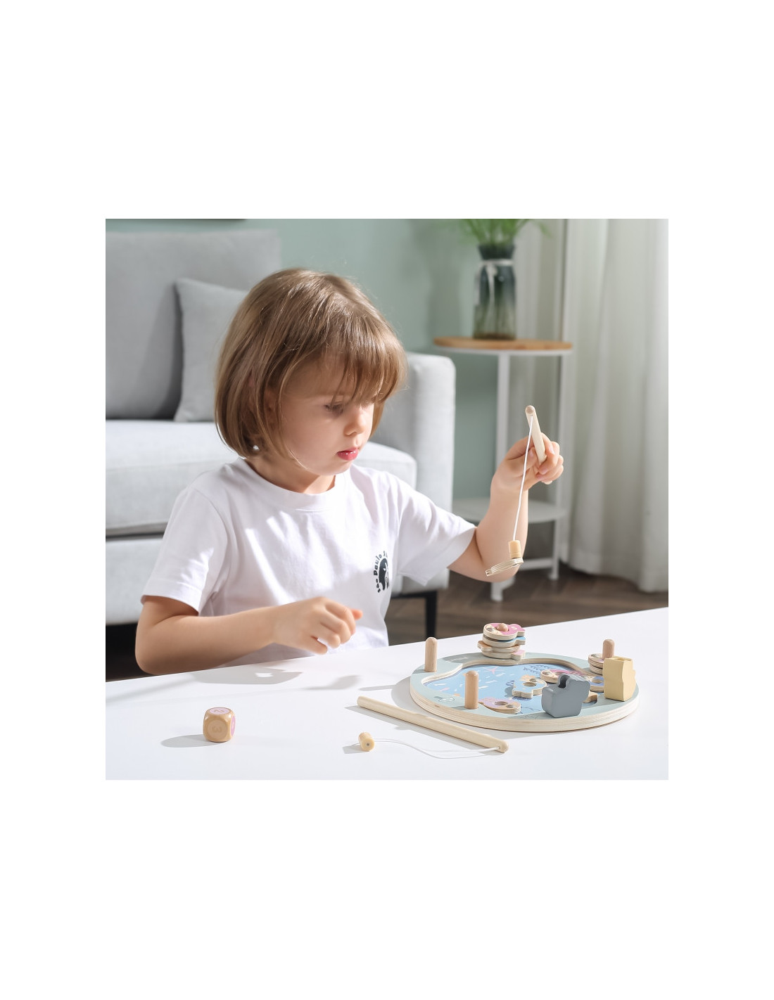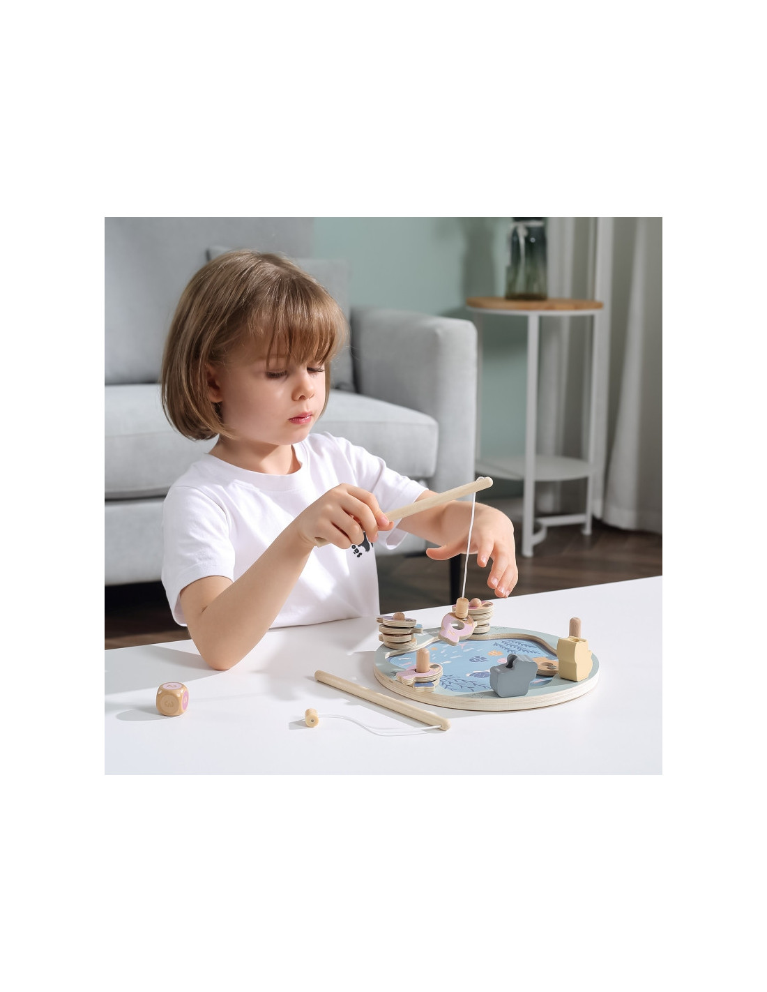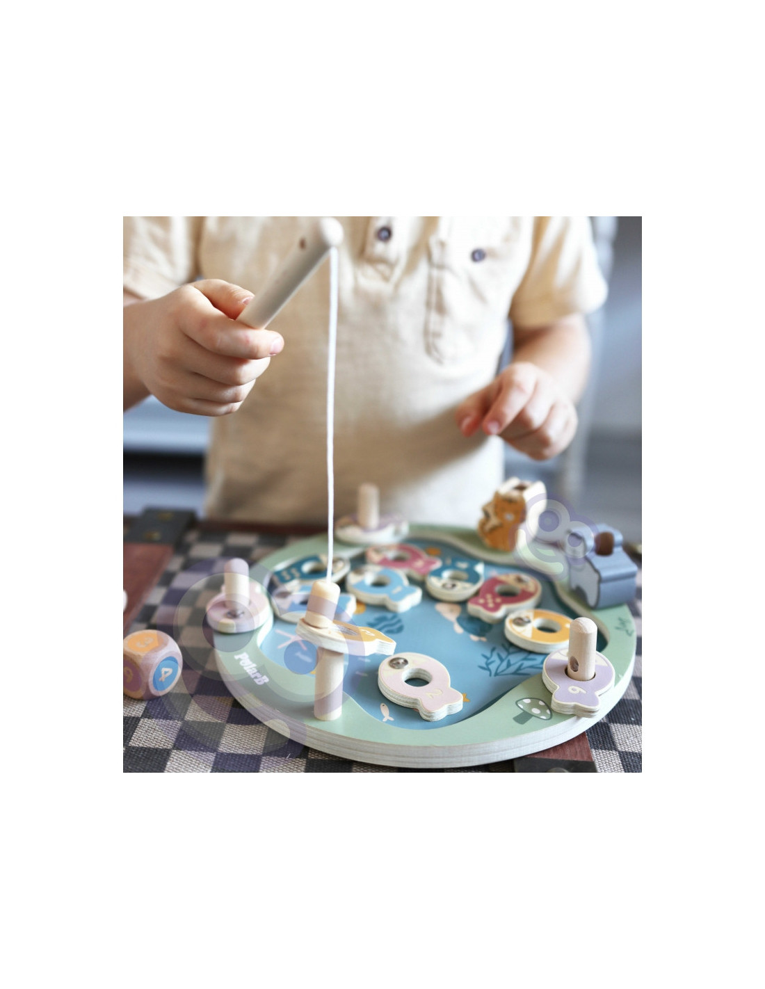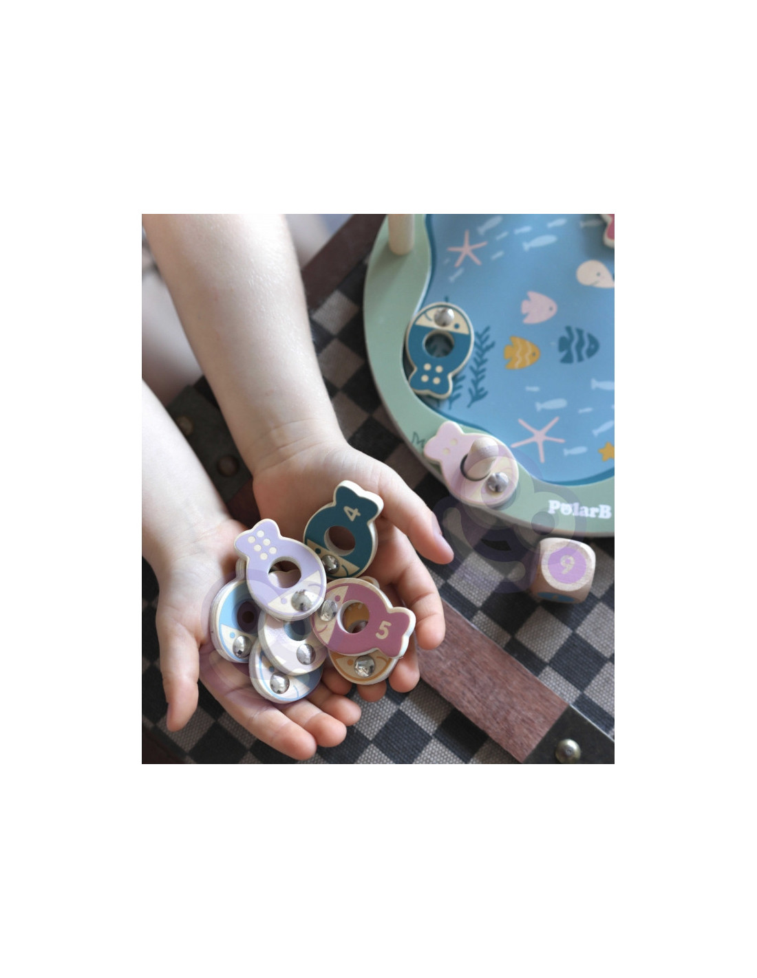 - - žaislą sudaro: medinis žaidimo stovas, 2 meškerės, kauliukas ir 12 žuvų,