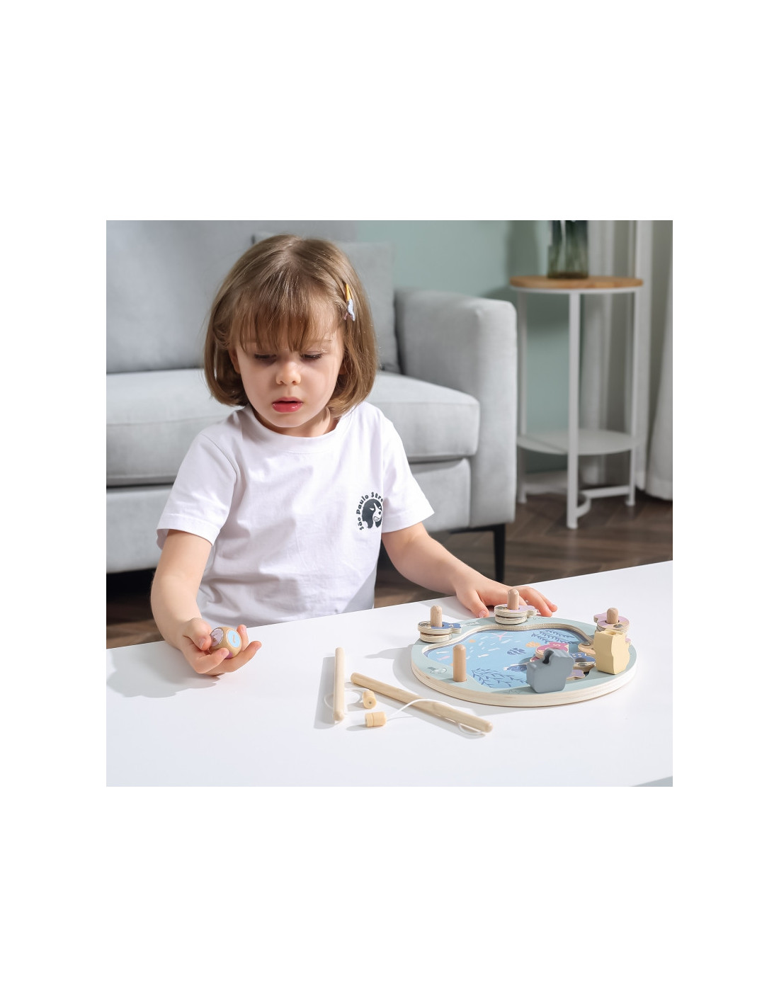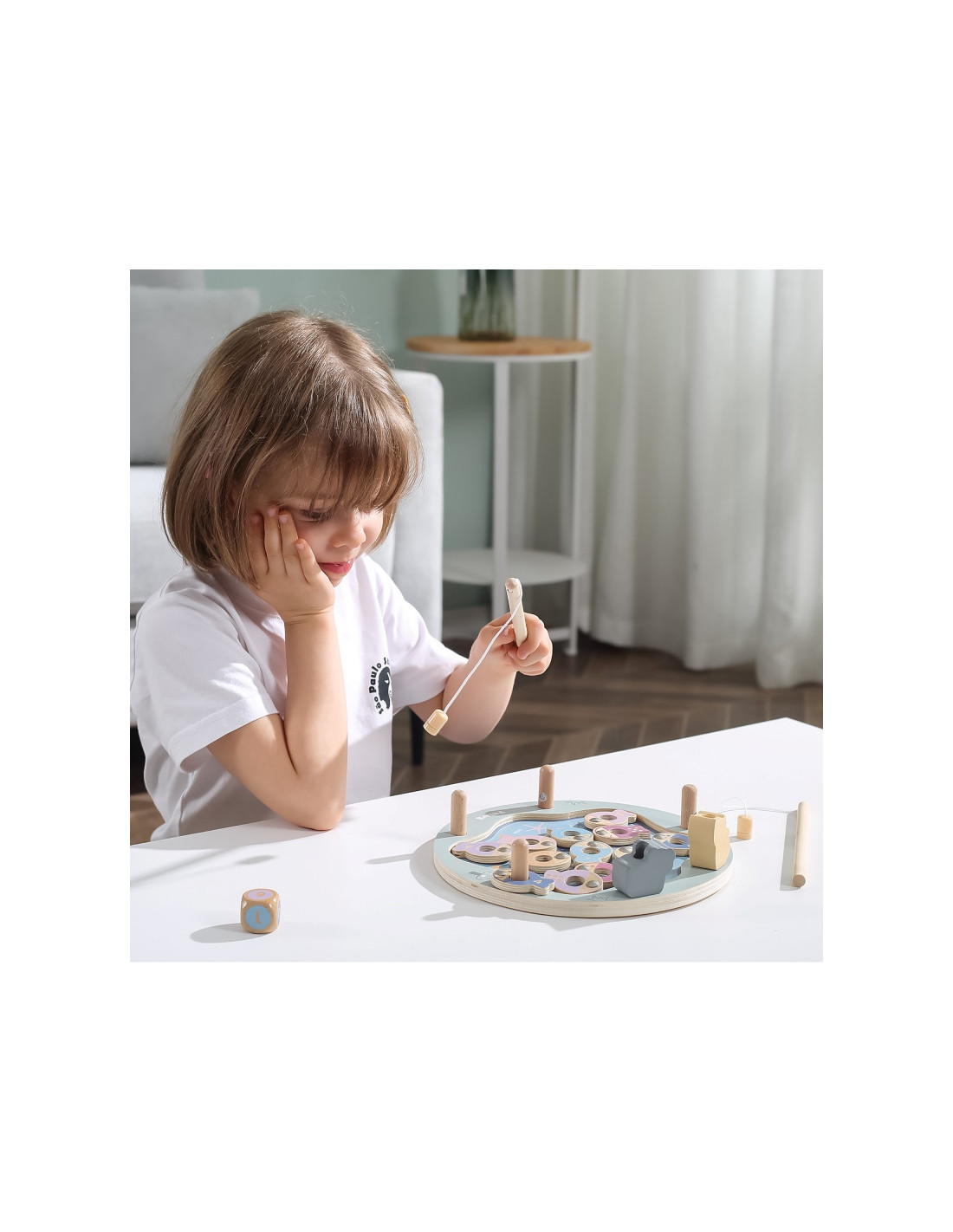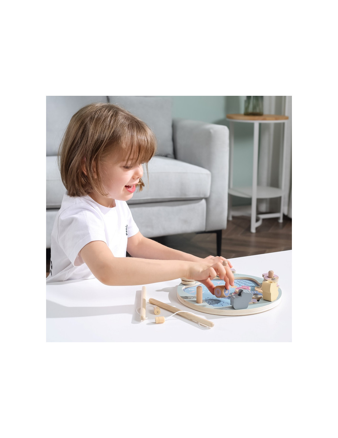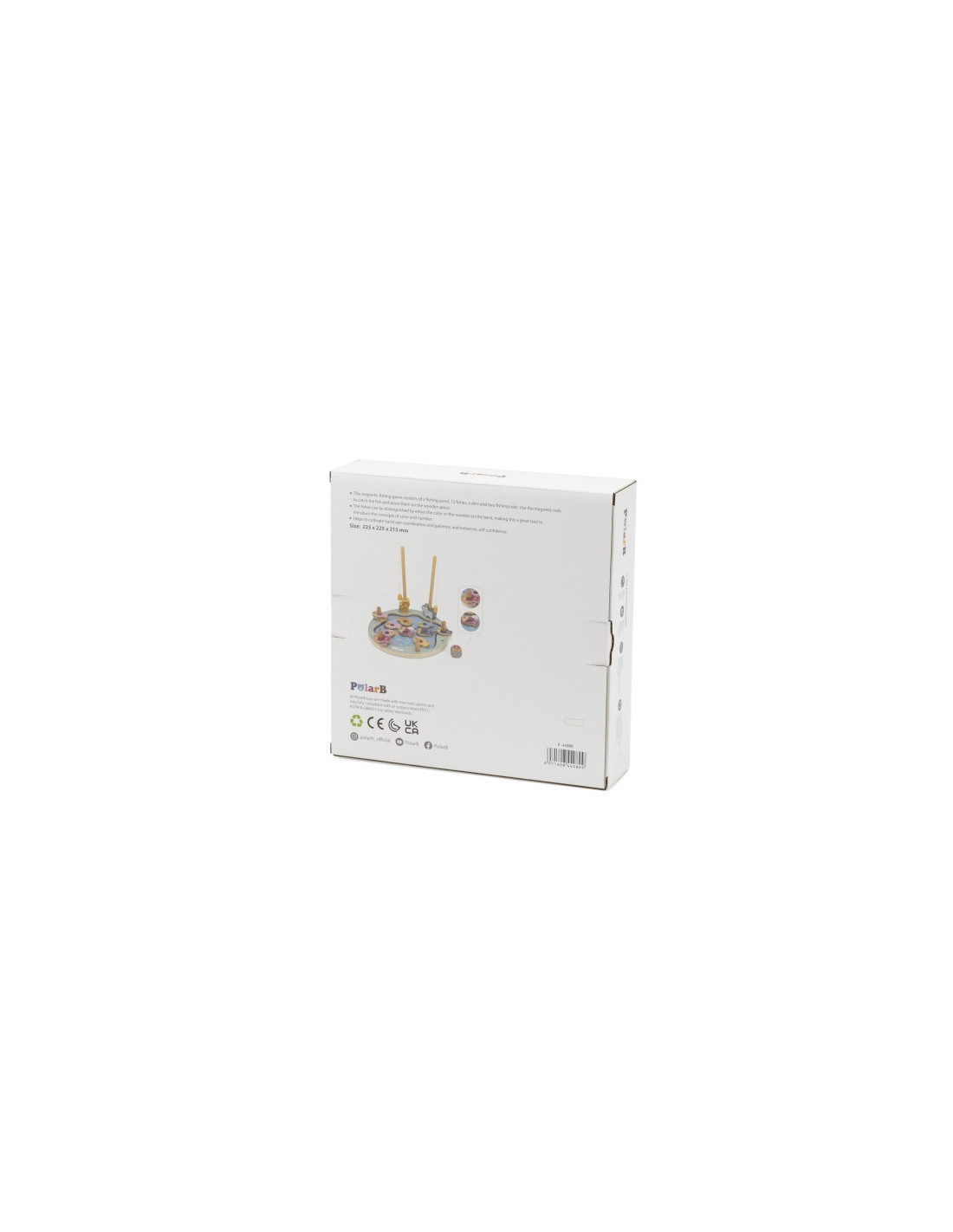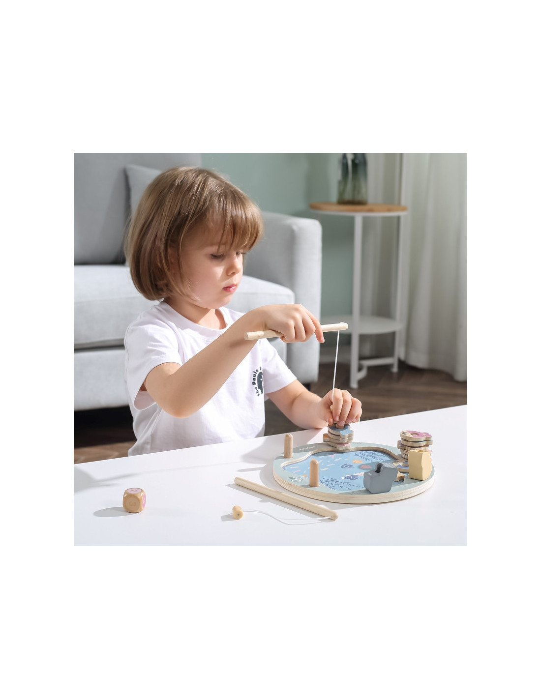 - - žaislą sudaro: medinis žaidimo stovas, 2 meškerės, kauliukas ir 12 žuvų,
