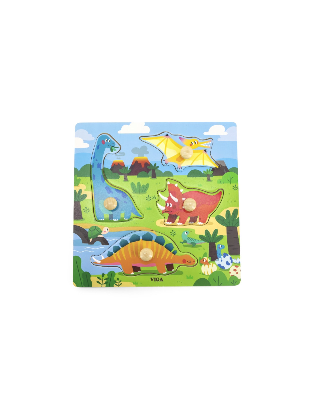 Ši medinė dinozaurų dėlionė iš garsaus „Viga“ prekės ženklo yra pirmaujantis žaislas, kuris ne tik yra tradicinė dėlionė, bet ir leidžia vaikams lavinti rankų miklumą bei gyvūnų formų atpažinimą. Šis žaidimas, tinkantis 12 mėnesių ir vyresniems vaikams, padės lavinti tikslius rankų judesius , gerins akių ir rankų koordinaciją , taip pat padės lavinti atmintį , loginį mąstymą ir susikaupimą . Spalvingos dėlionės yra vizualiai patrauklios ir skatina žaisti. Rinkinį sudaro keturios dėlionės su skirtingais gyvūnais skirtingose formose. Dėlionės turi rankenas , leidžiančias mažyliams lengvai jas paimti ir padėti į tinkamą vietą lentoje.