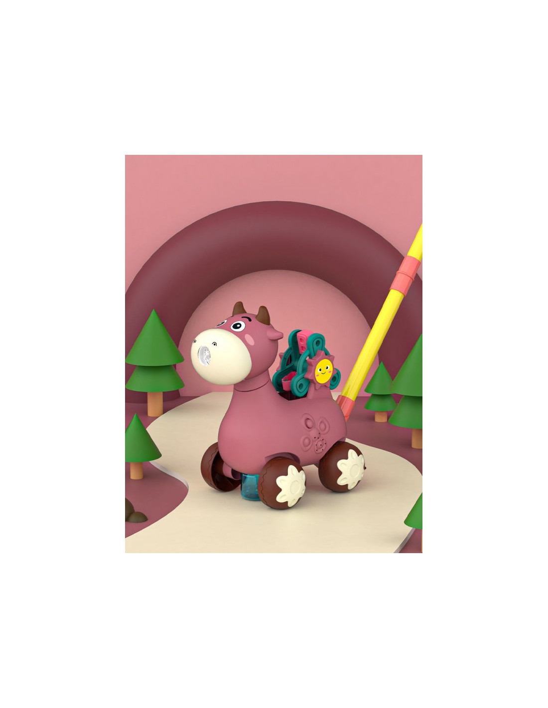 Rožinis karvės stūmiklis iš WOOPIE yra puiki mokymosi priemonė jūsų vaikui. Vaikai gali praktikuotis vaikščioti stumdami savo mėgstamą karvę. Šis stūmiamas žaislas turi daug funkcijų , kurios pradžiugins kiekvieną vaiką. Karvė pučia burbulus – tiesiog įsukite muilo indelį iš apačios (pridedami du indeliai) . Burbulai išbėga iš karvės nasrų. Jame yra besisukantis ratelis su abėcėlės raidėmis (A, B ir C) mokymuisi. Visa tai lydi nuostabios melodijos , kurias galima įjungti ir išjungti mygtuku . Šis žaislas padės lavinti jūsų vaiko koordinaciją , motorinius įgūdžius, vaikščiojimo įgūdžius ir leis jam žengti pirmuosius žingsnius mokantis abėcėlės .
