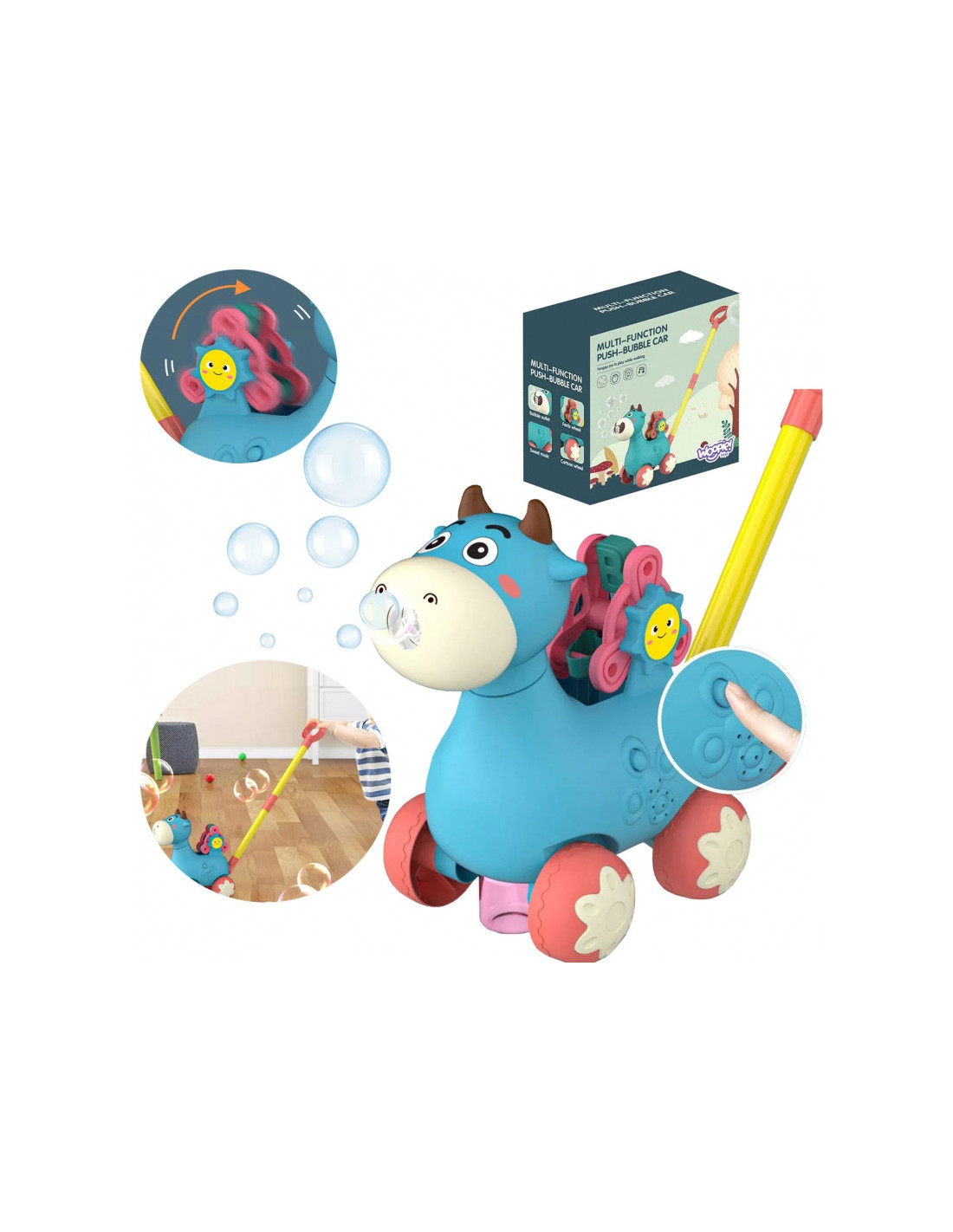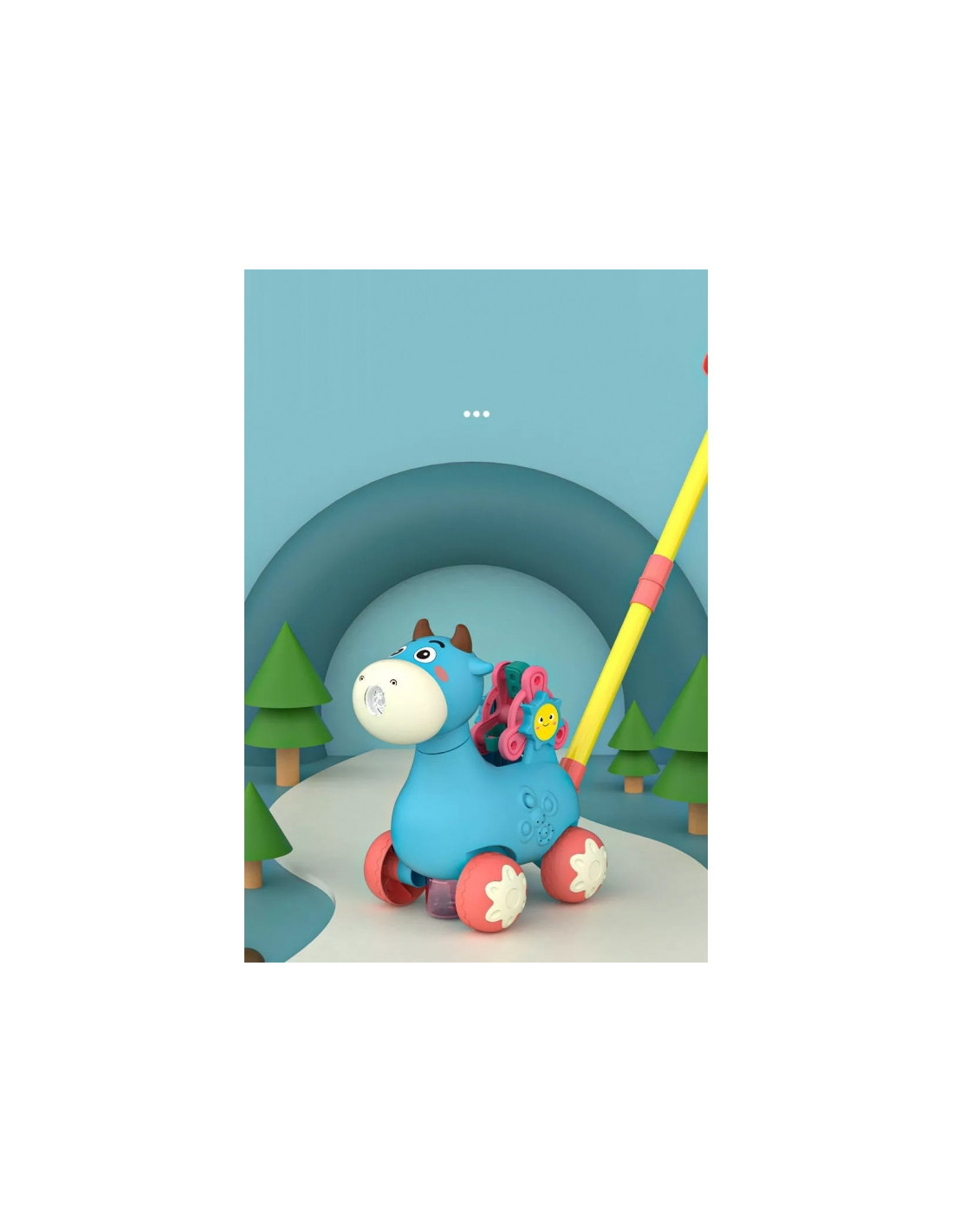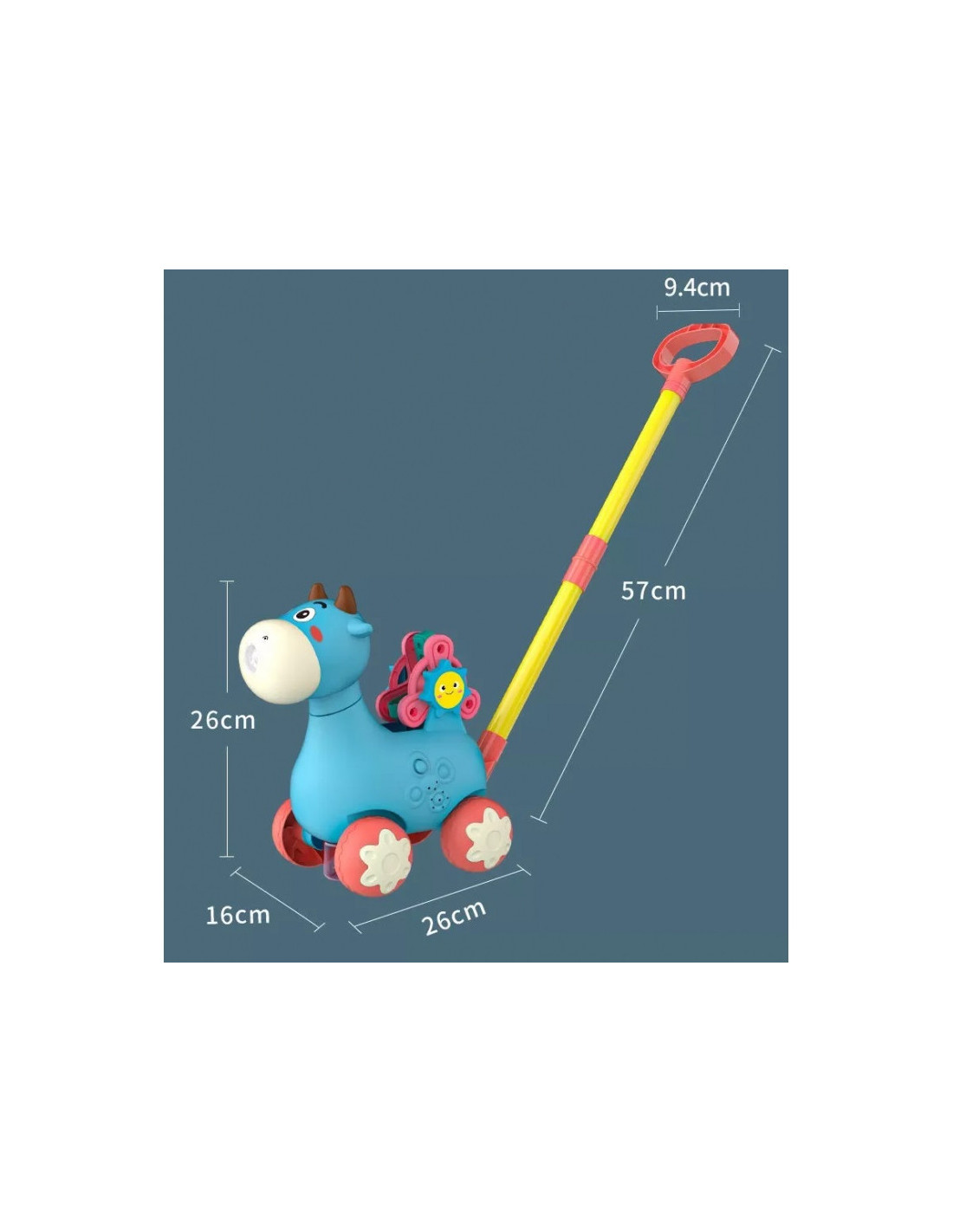 Mėlynas karvės stūmiklis iš WOOPIE yra puiki mokymosi priemonė jūsų vaikui. Vaikai gali praktikuotis vaikščioti stumdami savo mėgstamą karvę. Šis stūmiamas žaislas turi daug funkcijų , kurios pradžiugins vaikus. Karvė pučia burbulus – tiesiog įsukite muilo indelį iš apačios (pridedami du indeliai) . Burbulai išbėga iš karvės nasrų. Jame yra besisukantis ratelis su abėcėlės raidėmis (A, B ir C) mokymuisi. Visa tai lydi nuostabios melodijos , kurias galima įjungti ir išjungti vienu mygtuko paspaudimu . Šis žaislas padės lavinti jūsų vaiko koordinaciją , motorinius įgūdžius, vaikščiojimo įgūdžius ir leis jam žengti pirmuosius žingsnius mokantis abėcėlės .