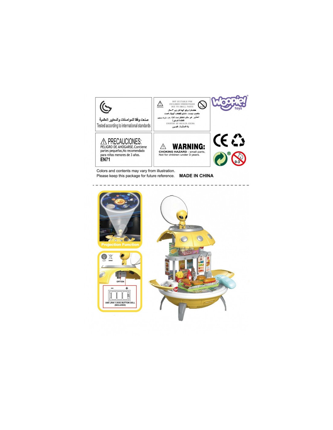 WOOPIE greito maisto NSO – tai erdvės rinkinys kiekvienam vaikui! Šis žaislas turi tris funkcijas : galite įjungti projektorių ir išmokti planetų pavadinimus. Jį taip pat galite naudoti kaip stilingą kuprinę su marsietiu. Dėvint kuprinę, marsietio galva laisvai juda už laivo priekinio stiklo. Tačiau svarbiausia savybė yra galimybė sulankstyti erdvėlaivį į super greito maisto restoraną . Jūsų vaikas gali tapti pardavėju Marse ir smagiai praleisti laiką kartu su draugais. Rinkinį sudaro 60 dalių : viskas, ko reikia greito maisto restoranui. Mažąjį ateivį galima sulankstyti. Kuprinės funkcija leidžia pasiimti savo nešiojamą restoraną su savimi, kad ir kur eitumėte . Vaidmenų žaidimai lavina jūsų vaiko sąmoningumą ir skatina jo vaizduotę bei kūrybiškumą .