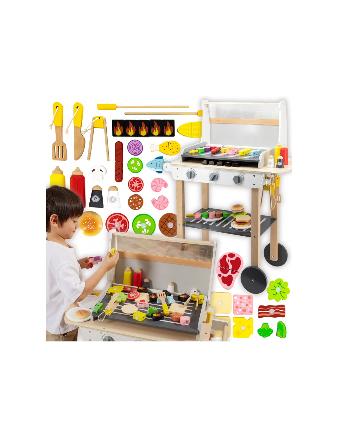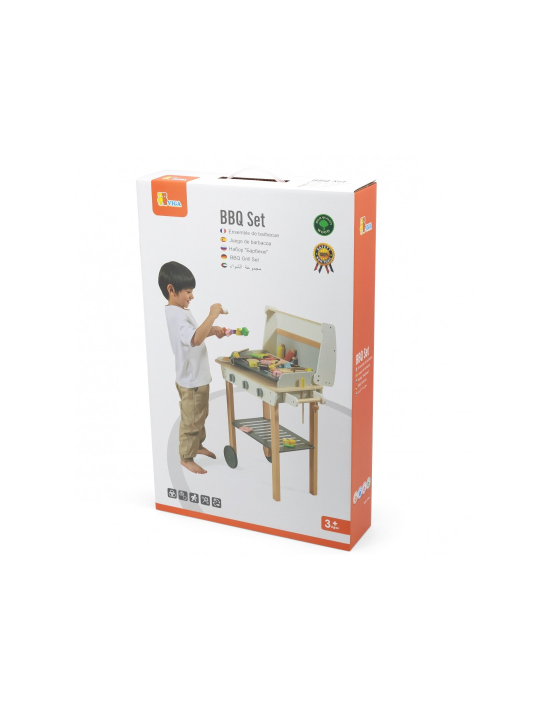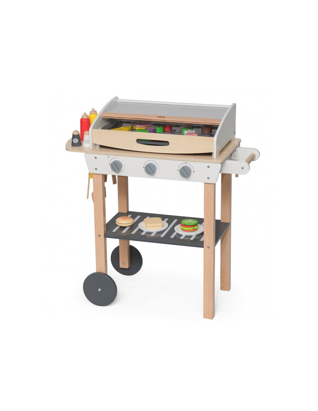 Medinės VIGA kepsninės yra kaip tikros kepsninės! Rinkinį sudaro 47 priedai , tokie kaip prieskonių stiklainiai, kečupas, garstyčios, žnyplės, stalo įrankiai ir kt. Garso efektai sustiprina tikrovišką pojūtį. Vaikai gali gaminti iešmelius, sumuštinius ir mėsainius. Nuimamas dangtis apsaugo „karštas“ groteles po kepimo, o ratukai ir patogi rankena leidžia transportuoti kepsninę bet kur sode ar namuose. Vaikai gali atlikti suaugusiojo, stebinčio šeimos kepsninę, vaidmenį.